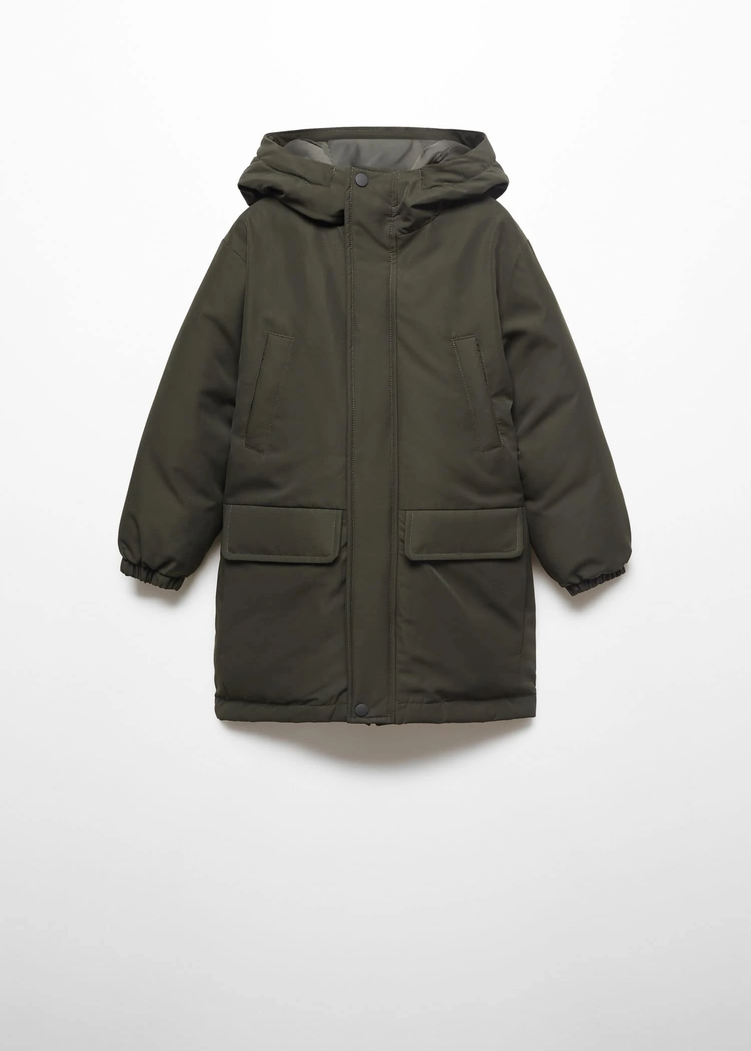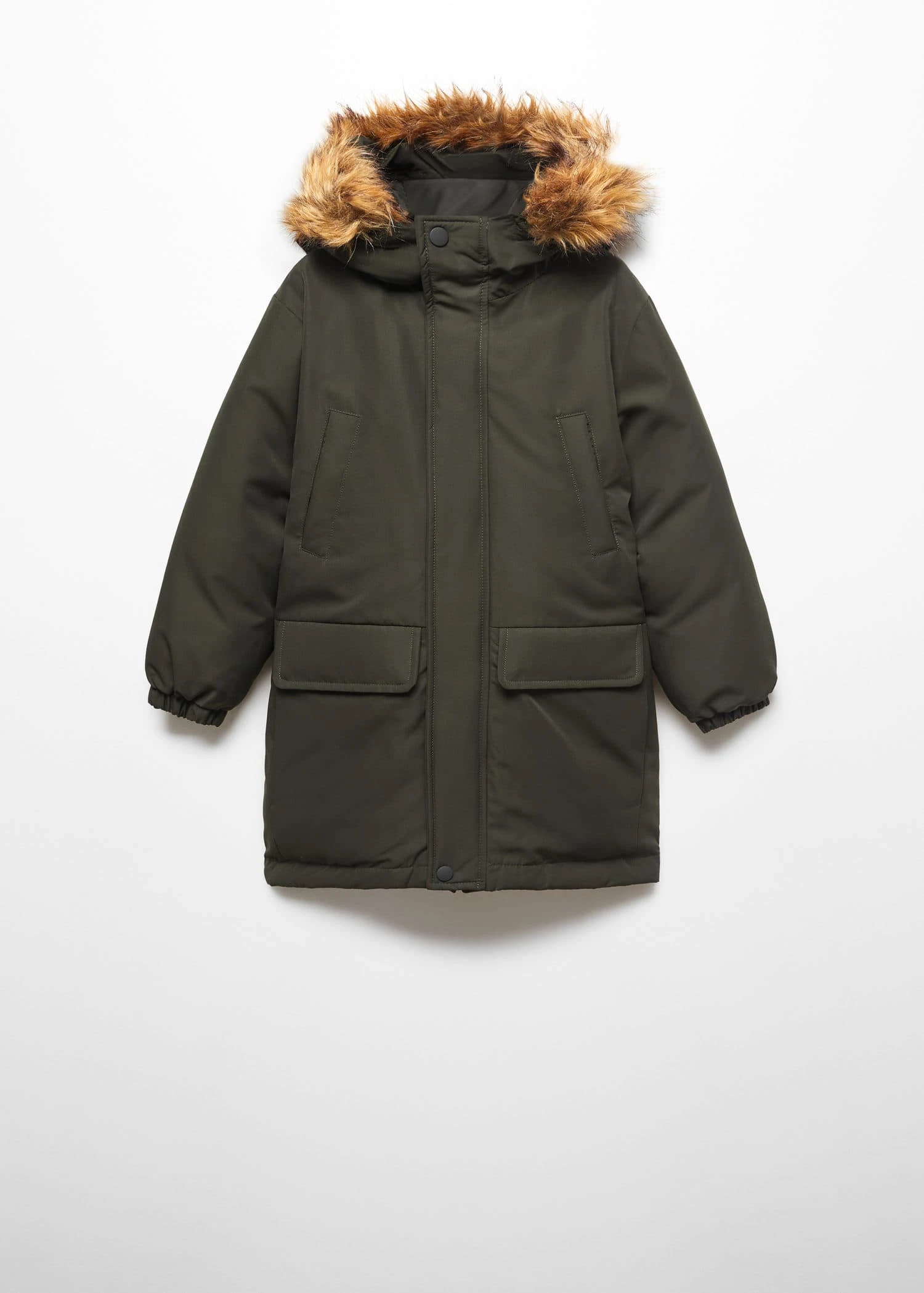coupe longue, coupe droite, deux poches a rabat, deux poches plaquees sur le devant, capuche avec detail de fausse fourrure, fermeture eclair, etiquette d’identite a l’interieur .Composition: 100% polyester. Doublure: 100% polyester. Rembourrage: 100% polyester