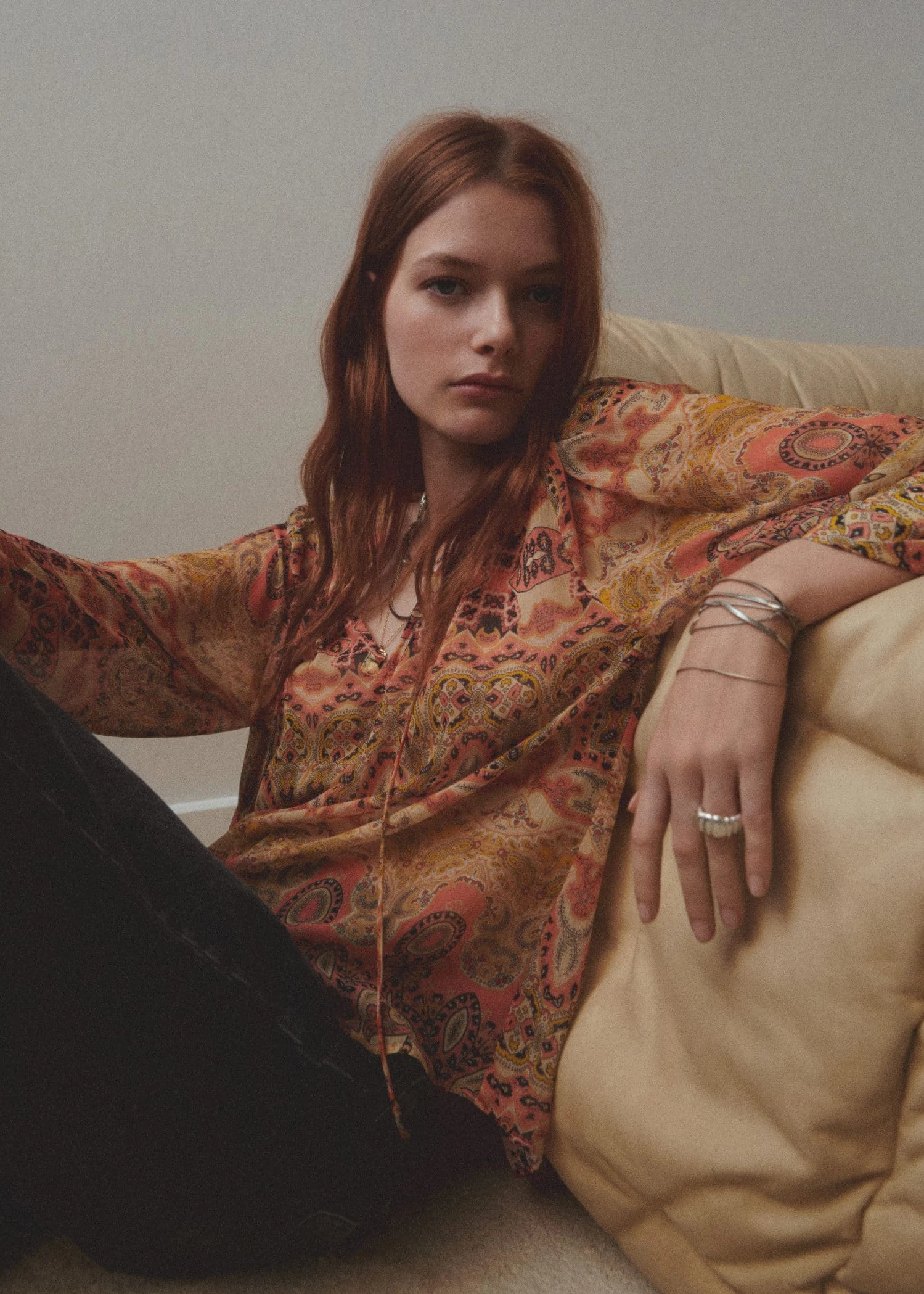 tissu fluide, droit, imprime, col rond, lien a nouer autour du cou, col en v, manches longues bouffantes, manches longues avec poignets boutonnes, style bohoComposition: 100% polyester