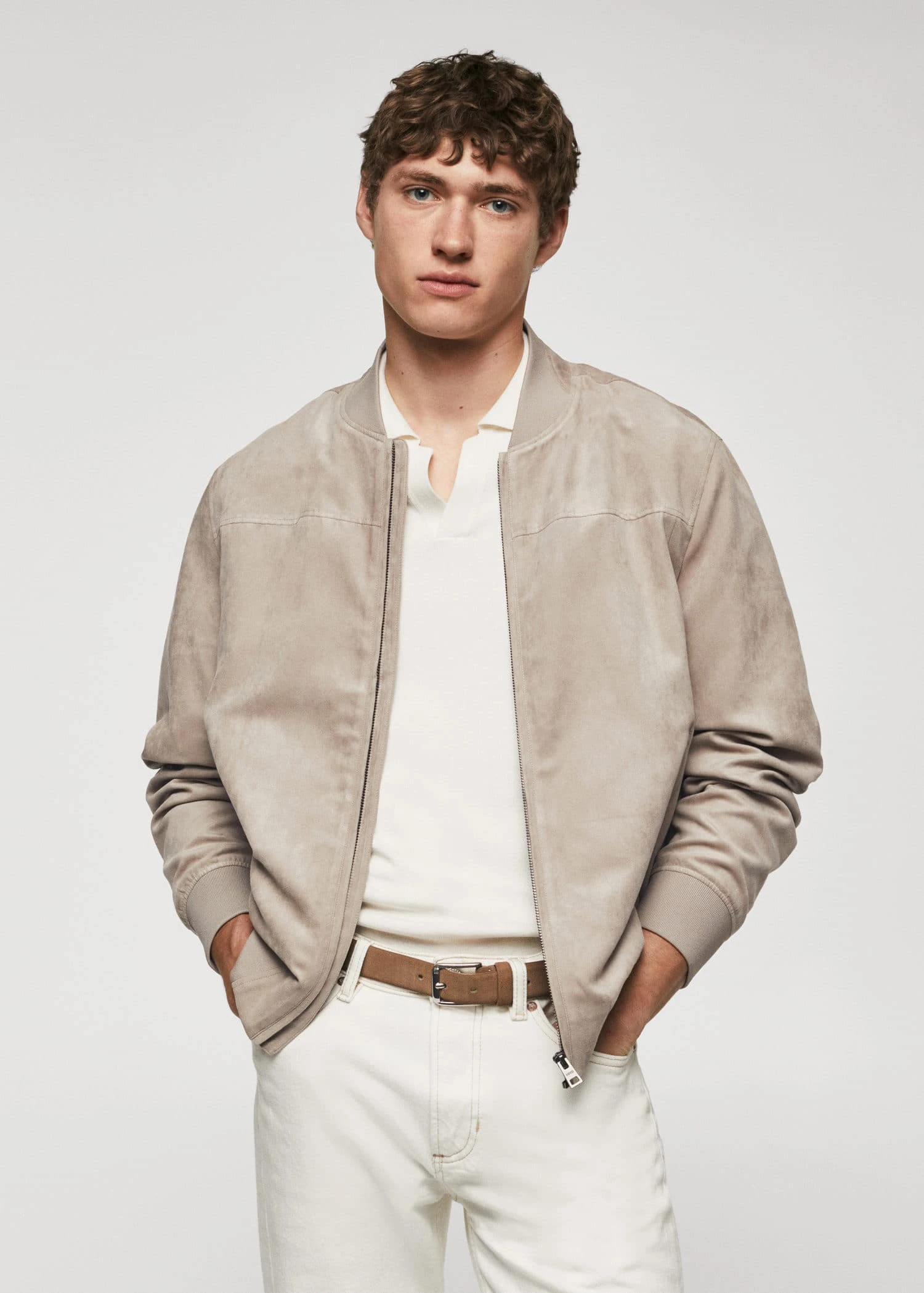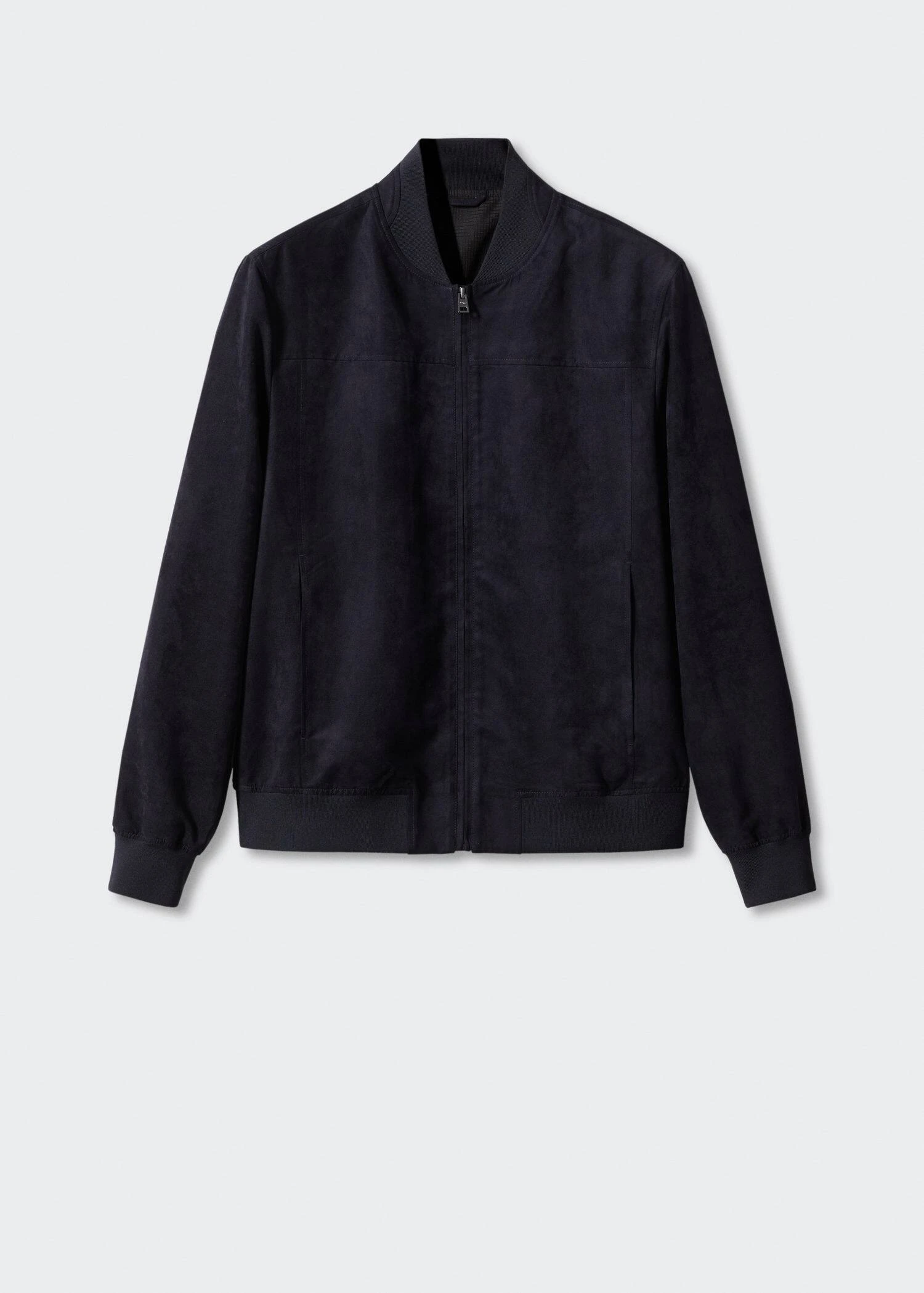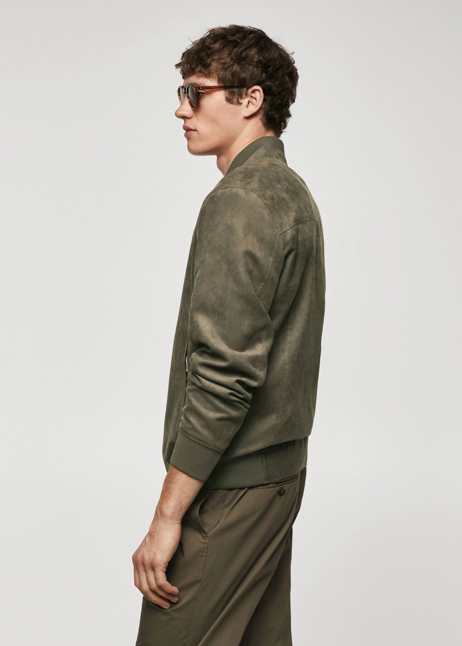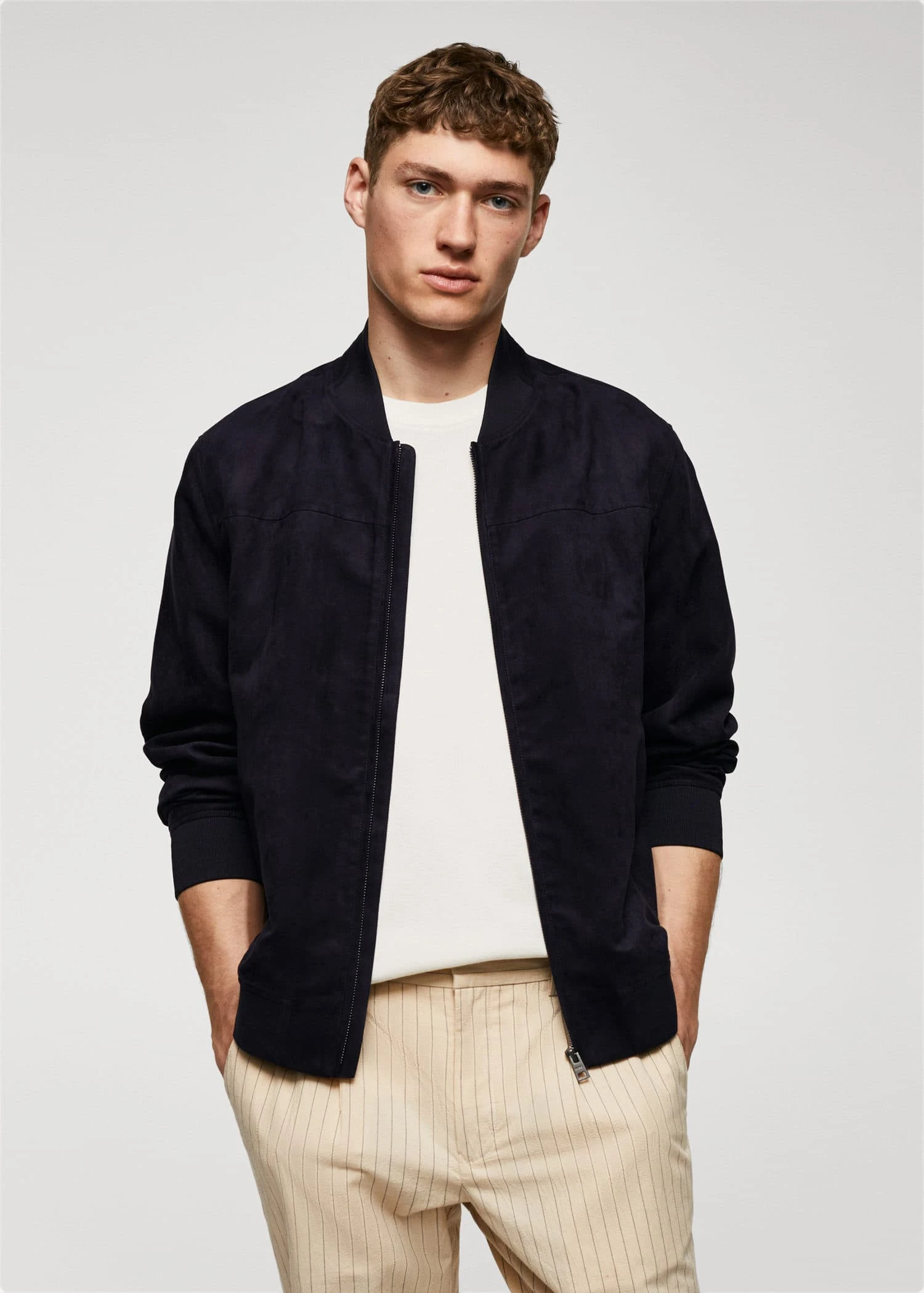style bomber, imitation daim, fermeture eclair a l’avant, manches longues avec poignets elastiques, deux poches a rabat sur les cotes, bas elastique, poche interieure zippee, doublure, le mannequin mesure 183 cm et porte une taille mComposition: 60% polyester,40% polyester recyclé. Doublure: 100% polyester. Cannelé: 98% polyester,2% elasthanne