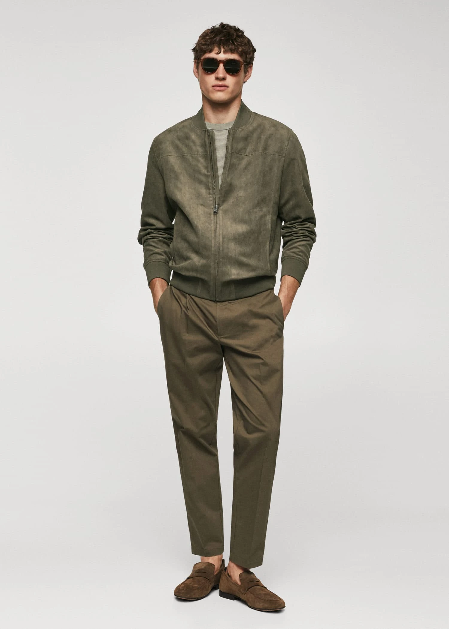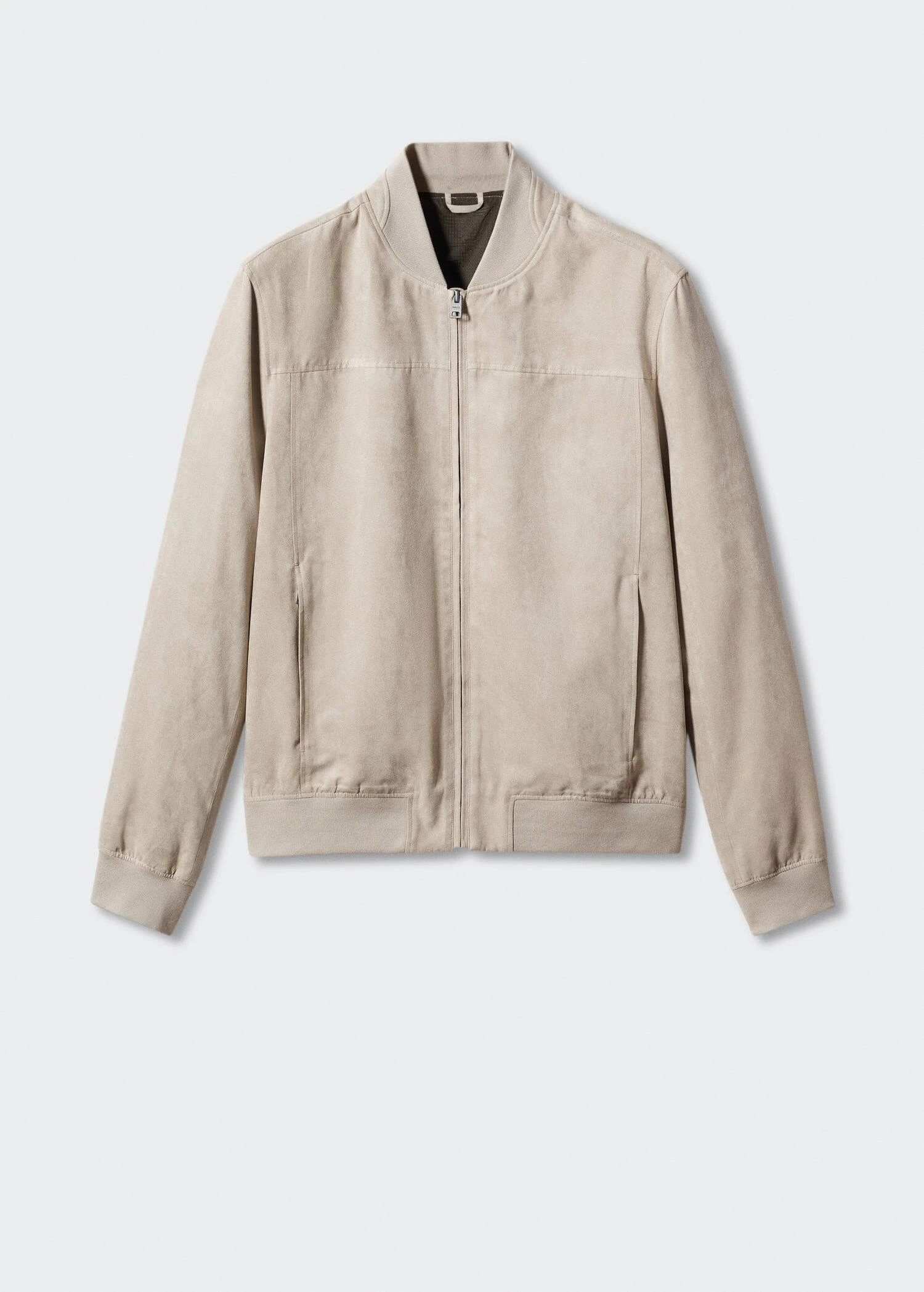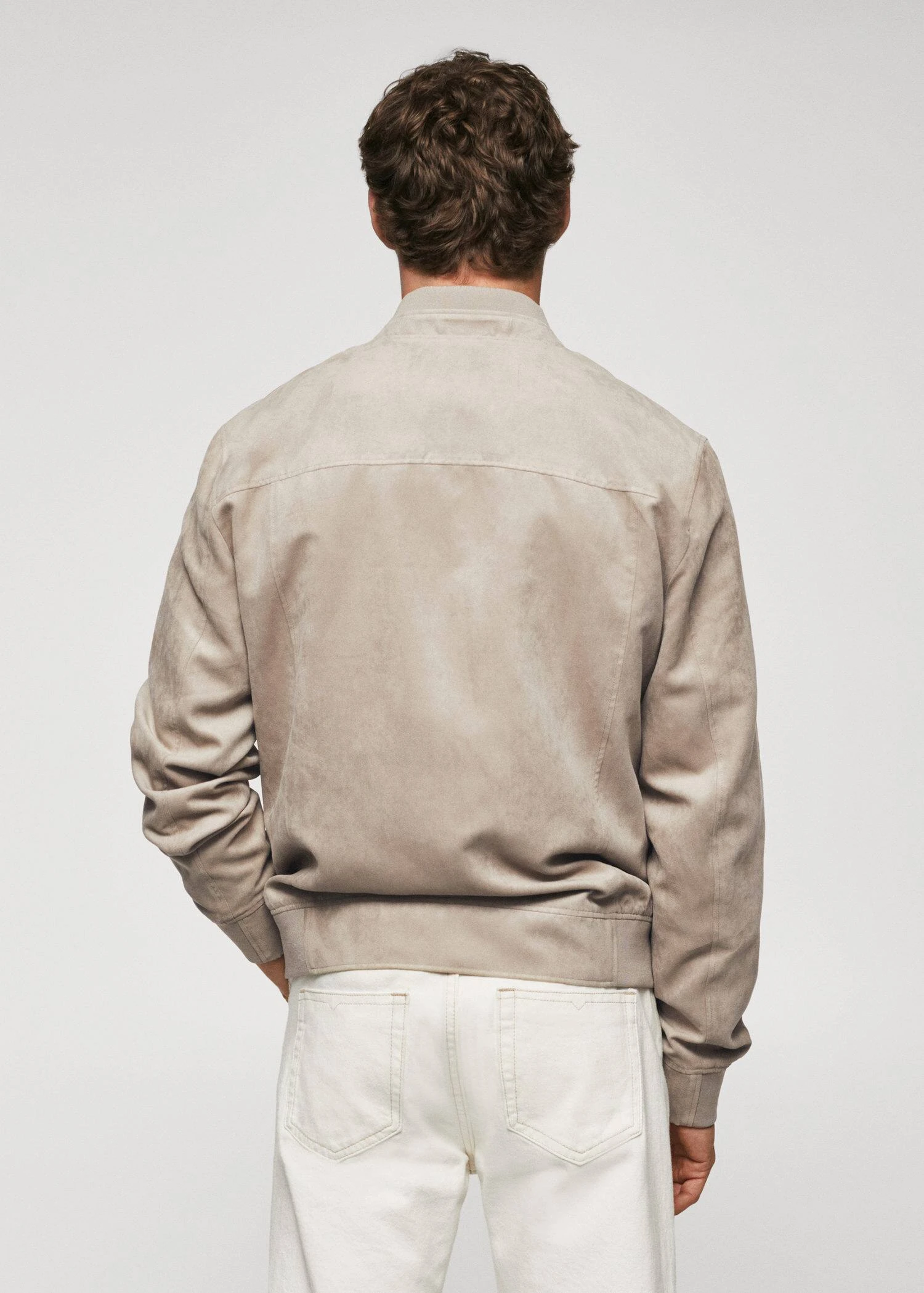 style bomber, imitation daim, fermeture eclair a l’avant, manches longues avec poignets elastiques, deux poches a rabat sur les cotes, bas elastique, poche interieure zippee, doublure, le mannequin mesure 183 cm et porte une taille mComposition: 60% polyester,40% polyester recyclé. Doublure: 100% polyester. Cannelé: 98% polyester,2% elasthanne