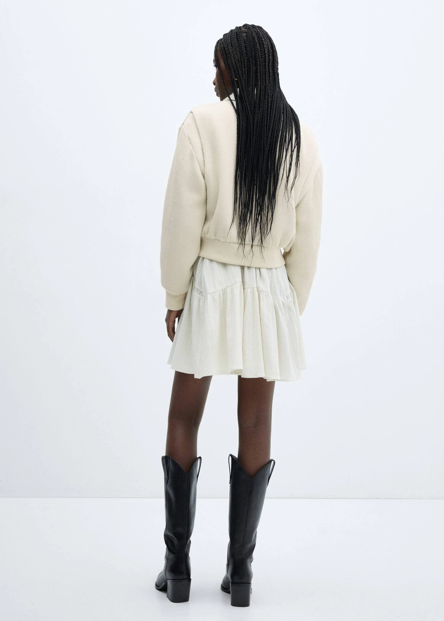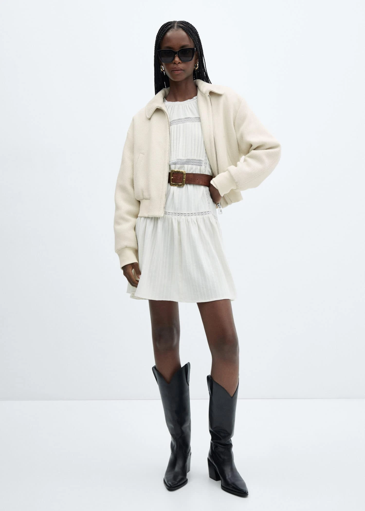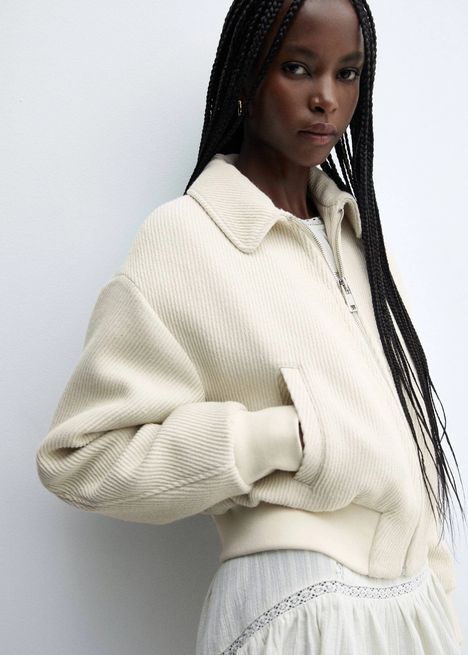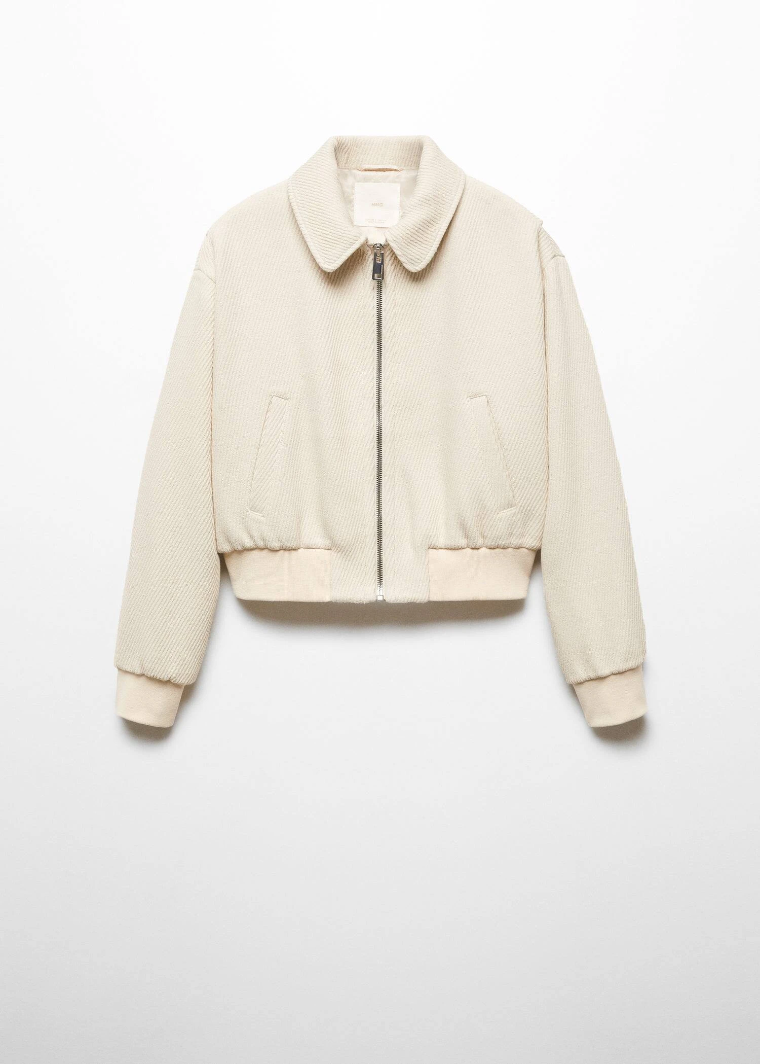 tissu de coton melange, style bomber, coupe courte, col chemise, manches longues avec poignets elastiques, deux poches laterales, fermeture eclair a l’avant, bas elastique, doublureComposition: 89% polyester,3% acrylique,3% viscose,2% coton,2% polyamide,1% laine. Doublure: 100% polyester. Cannelé: 98% polyester,2% elasthanne. Rembourrage: 100% polyester