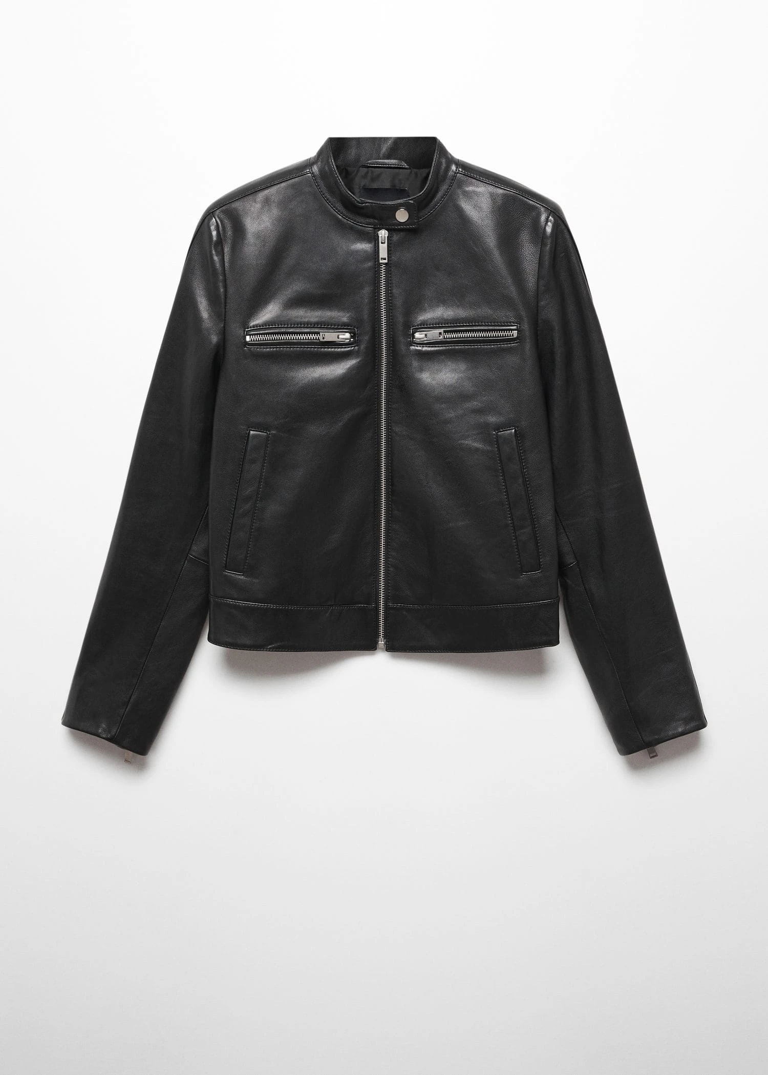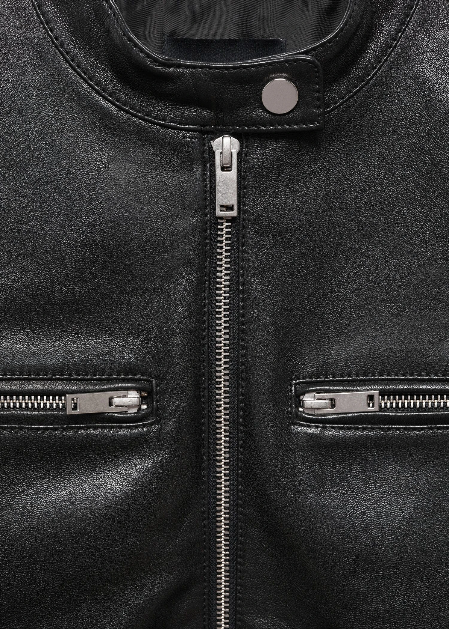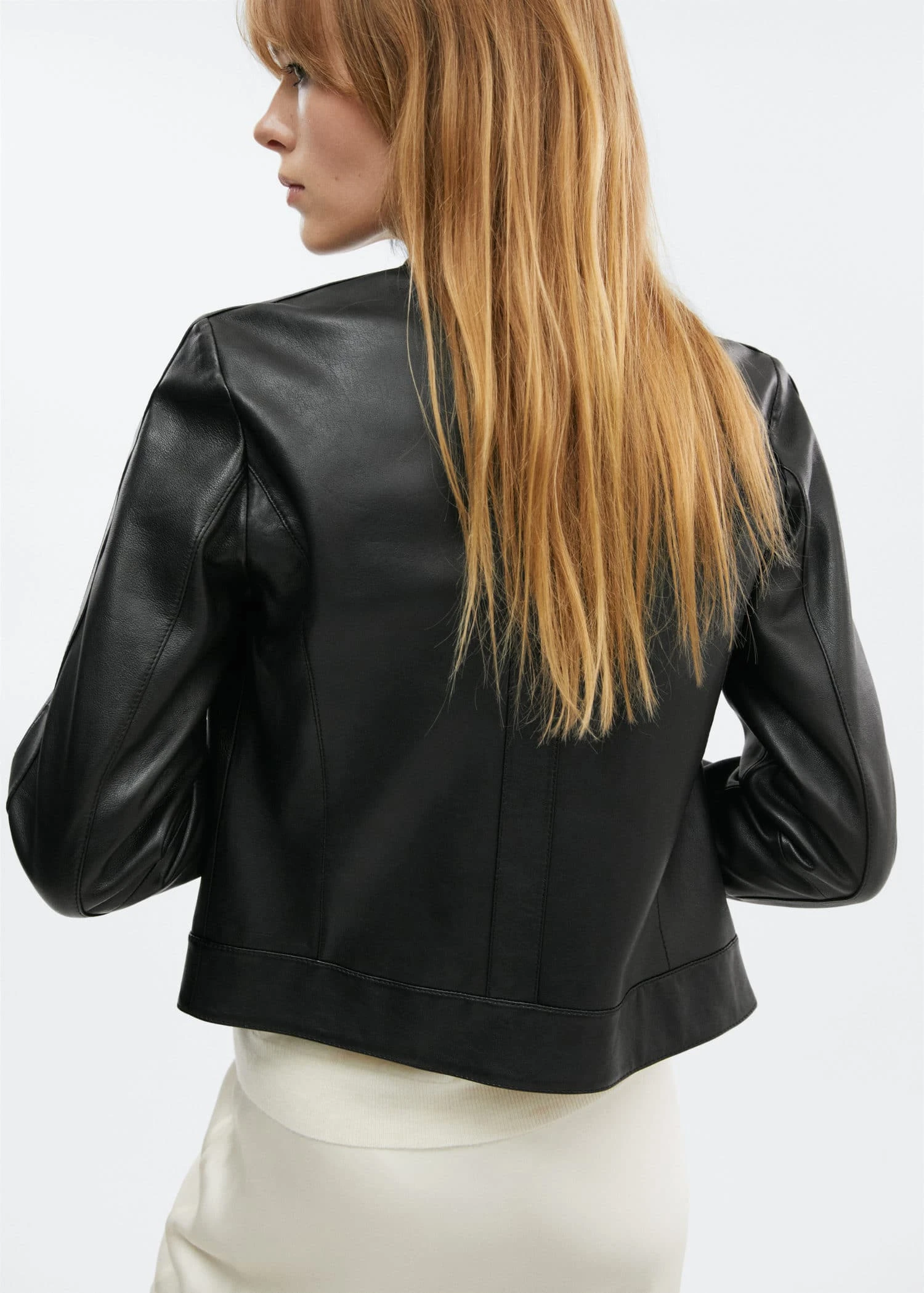 collection selection, 100 % cuir ovin, coupe droite, col officier, manches longues, deux poches zippees sur la poitrine, deux poches laterales, fermeture eclair a l’avant, doublure, une selection de pieces qui vous accompagneront lors du retour au bureau. confectionnee avec des matieres de qualite pour creer une garde-robe feminine et contemporaine pour votre quotidien.