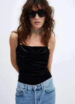 tissu en velours, coupe cintree, col echancre, col drape, bretelles larges, sans manches, fermeture a boutons-pression a la base, encolure au dos, collection fetes et ceremonies.Composition: 92% polyester,8% elasthanne