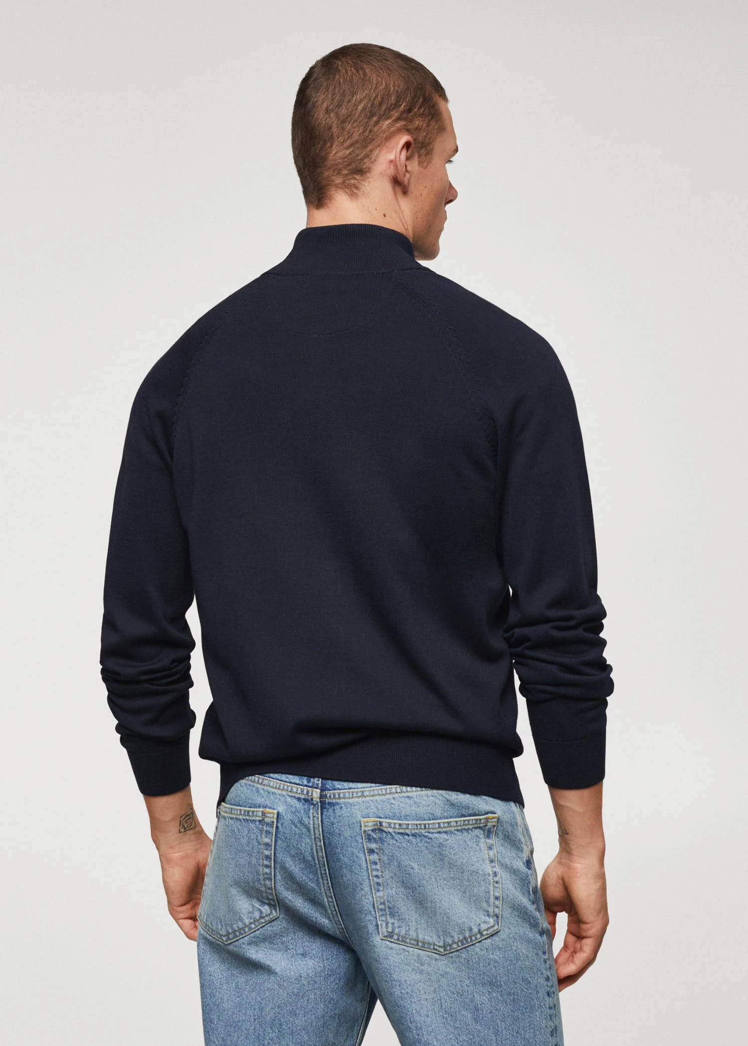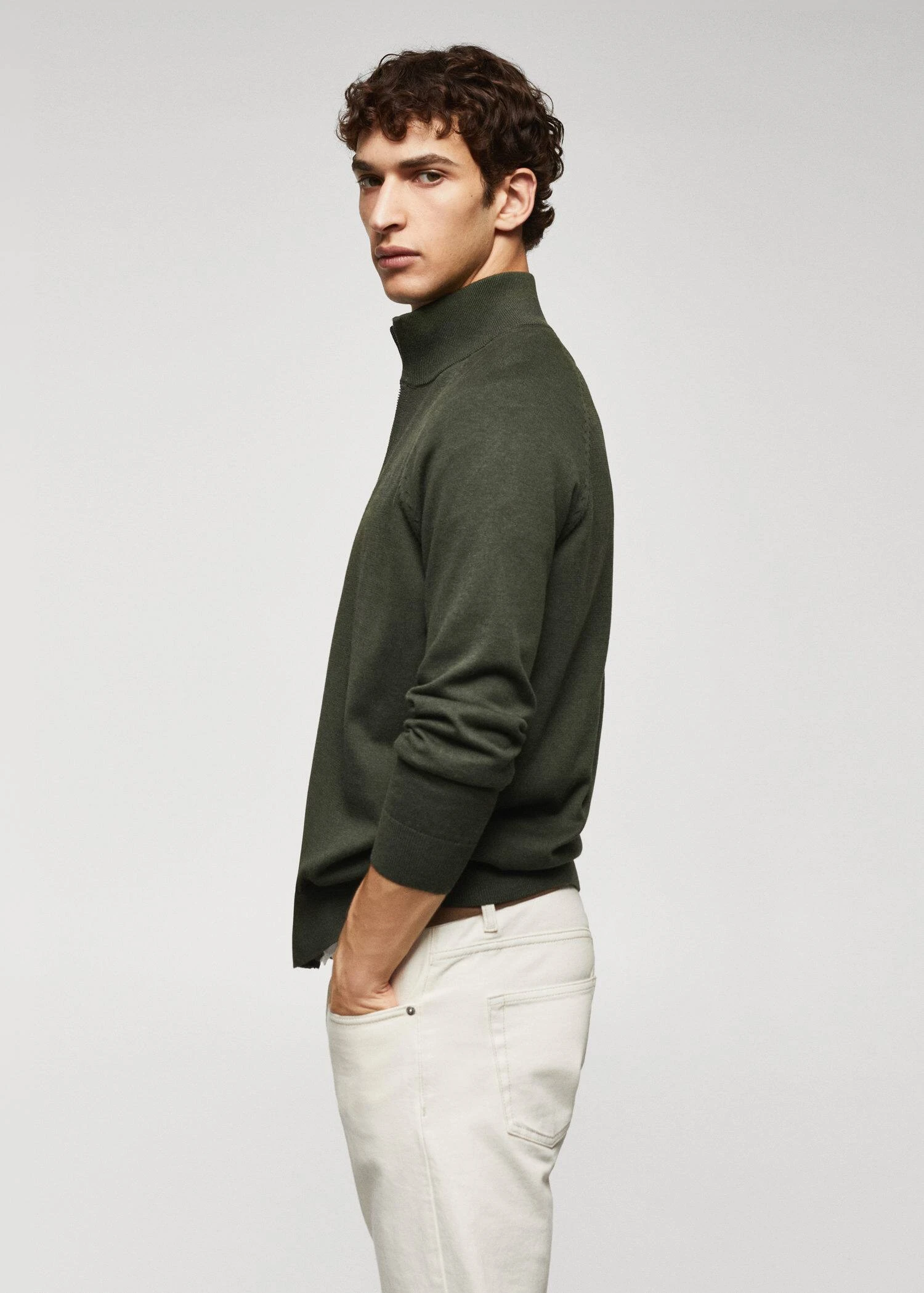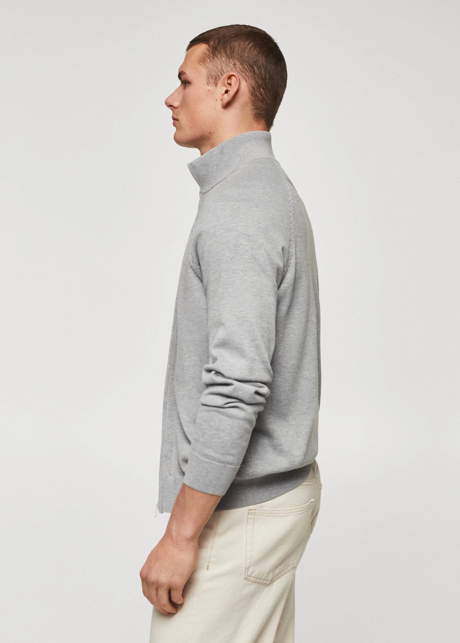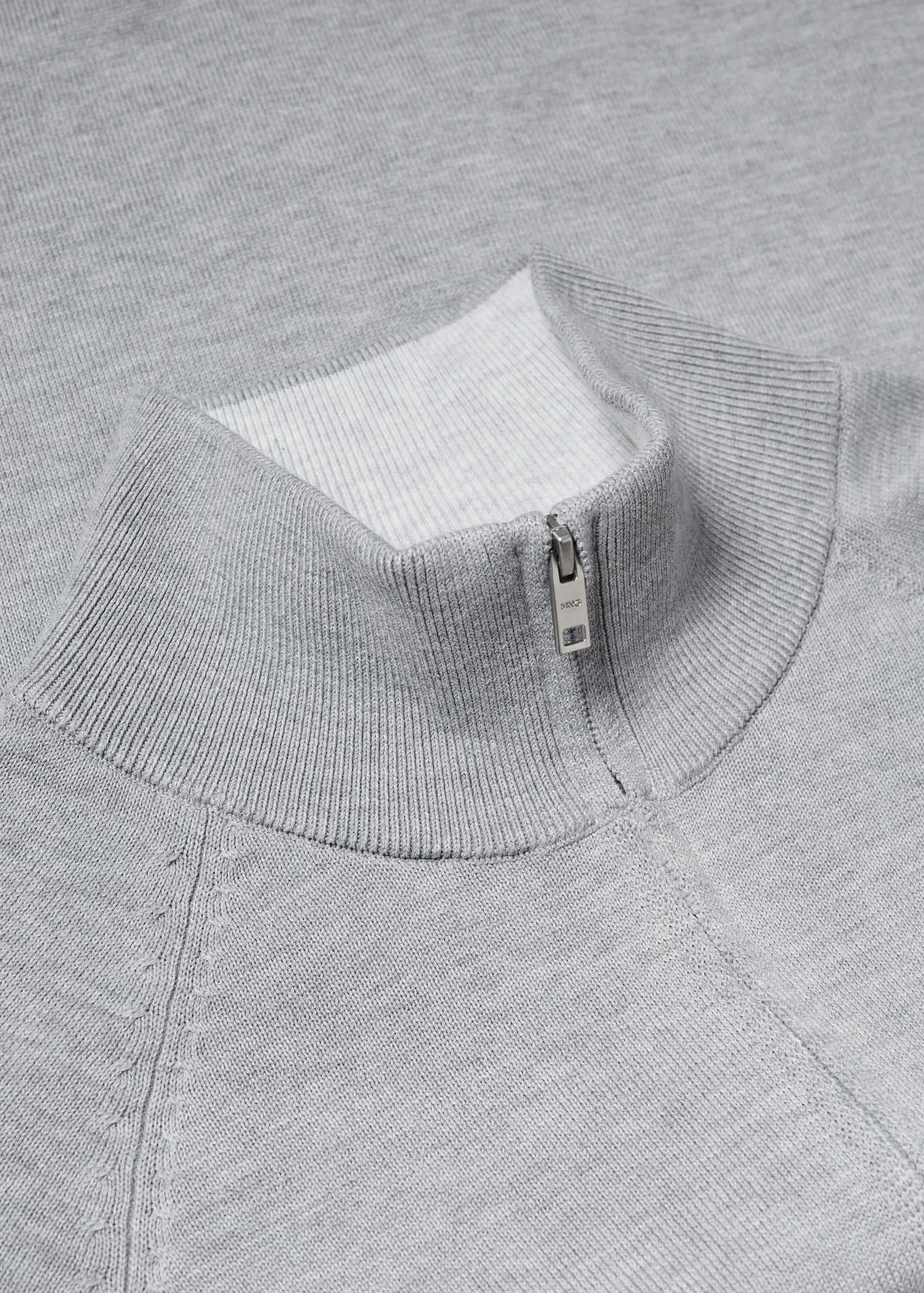 tissu en maille fine, col montant, manches longues, fermeture eclair, bords coteles elastiques, le mannequin porte une taille m, collection essentiels, le polyester recycle est obtenu a partir de dechets textiles de polyester, de dechets marins ou de bouteilles en plastique pet qui sont utilises pour produire de nouveaux tissus.Composition: 65% polyester recyclé,35% coton