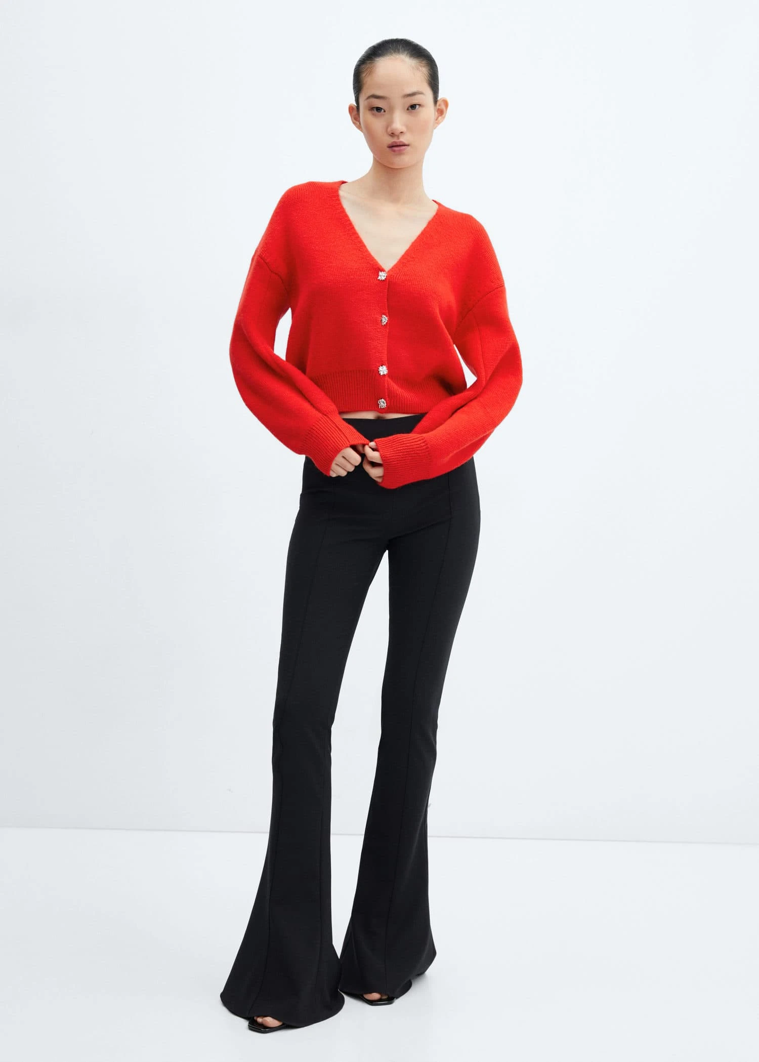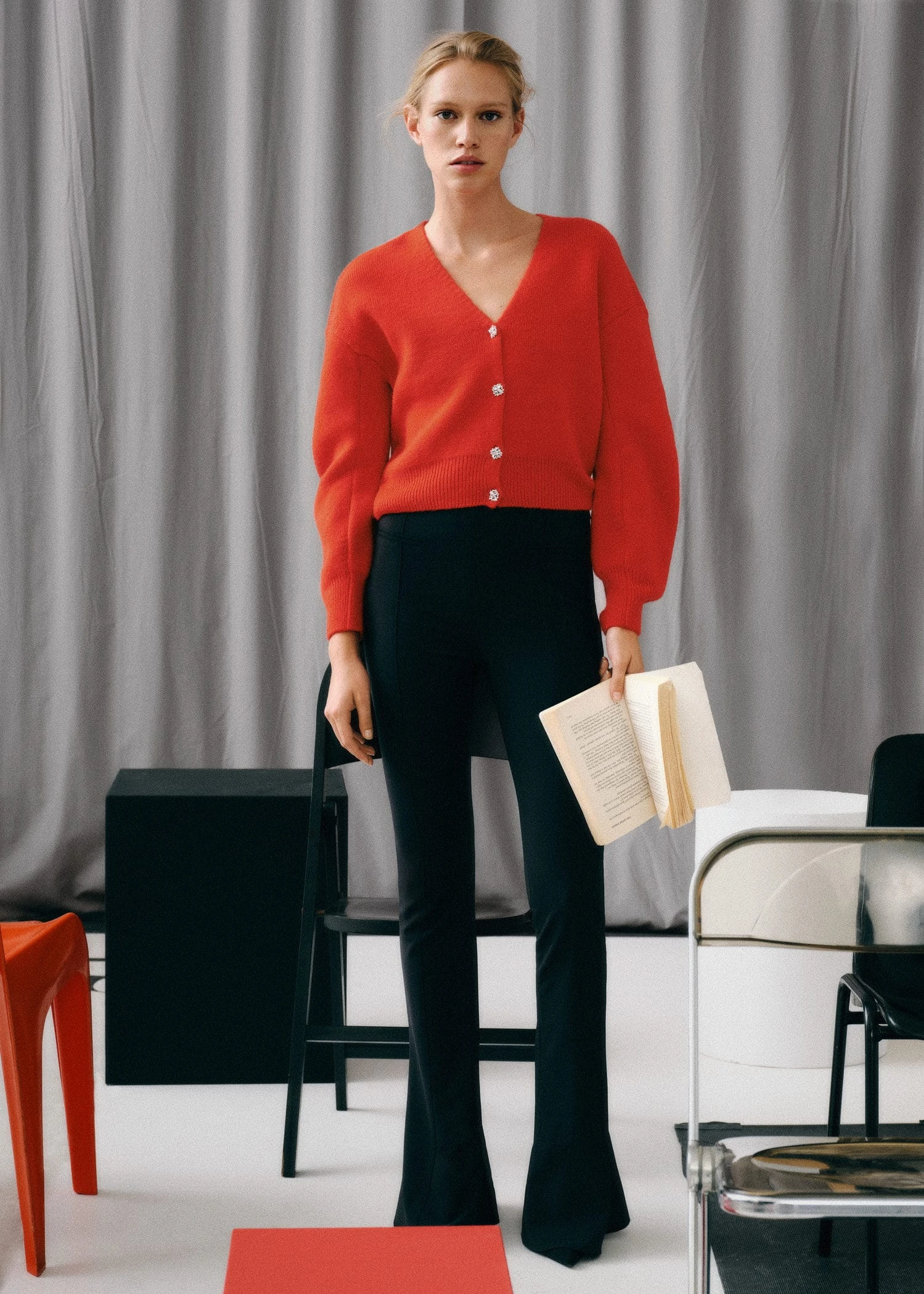 maille moyenne, coupe droite, col en v, manches longues, manches bouffantes, fermeture a boutons sur le devant, boutons effet bijoux, couture tombante sur l’epauleComposition: 85% acrylique,8% polyester,7% polyamide