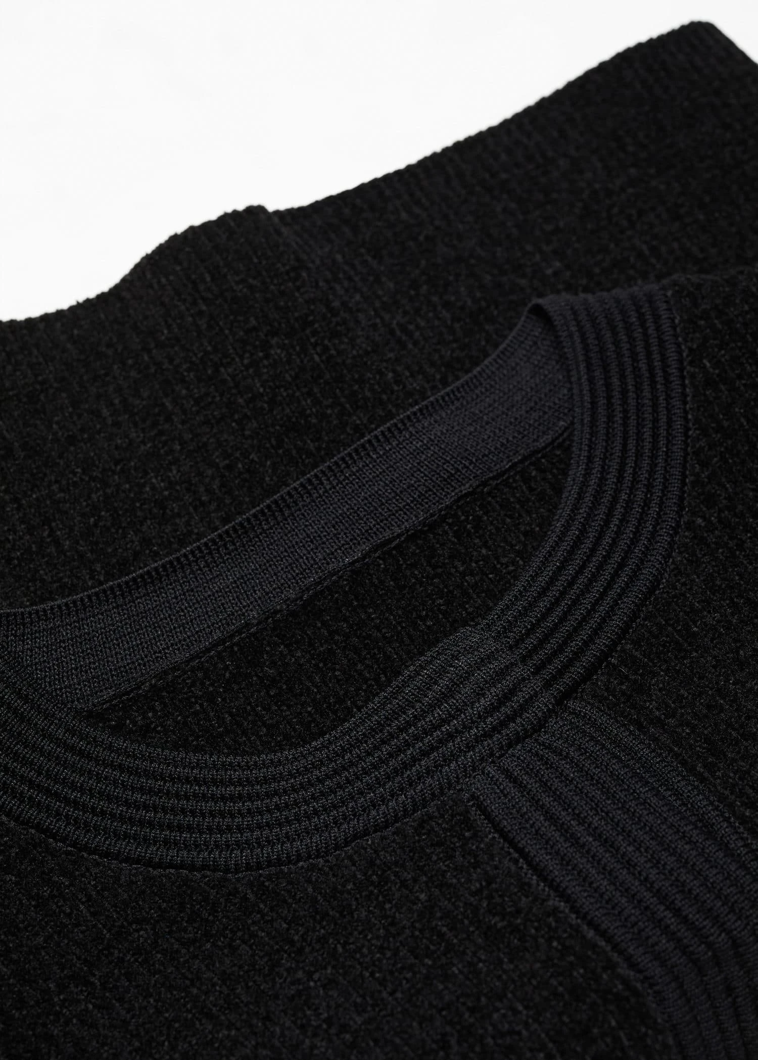 tissu en velours, tissu en maille fine, coupe courte, coupe droite, col rond, manches longues, fermeture a boutons dissimulee sur le devantComposition: 74% polyester,17% polyamide,7% viscose,2% elasthanne