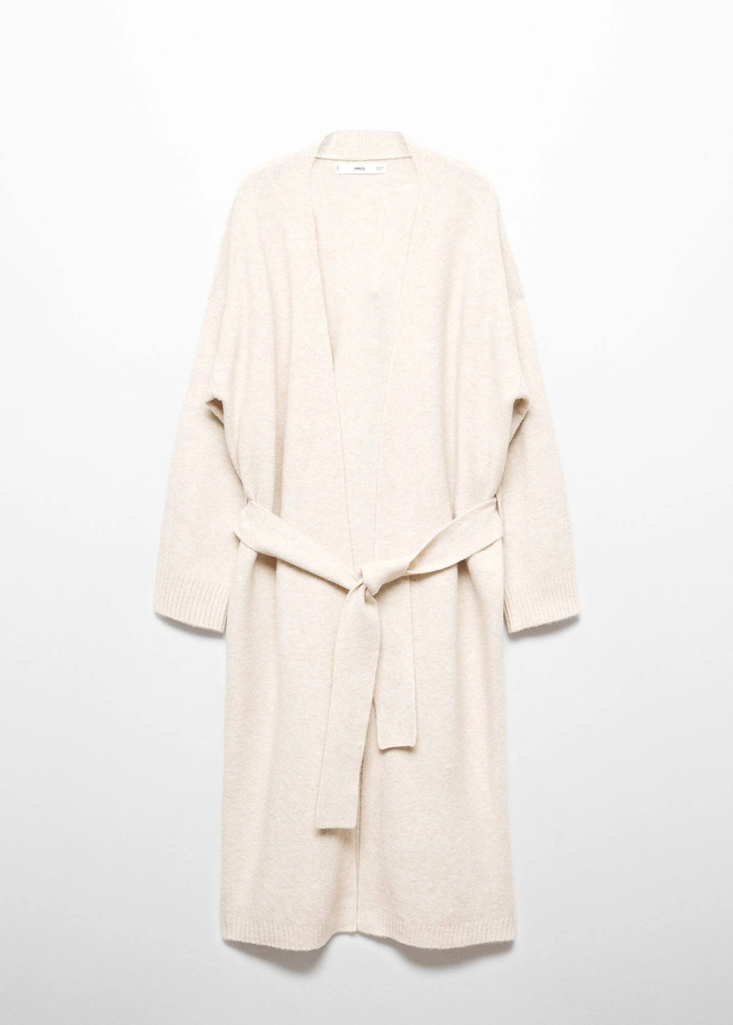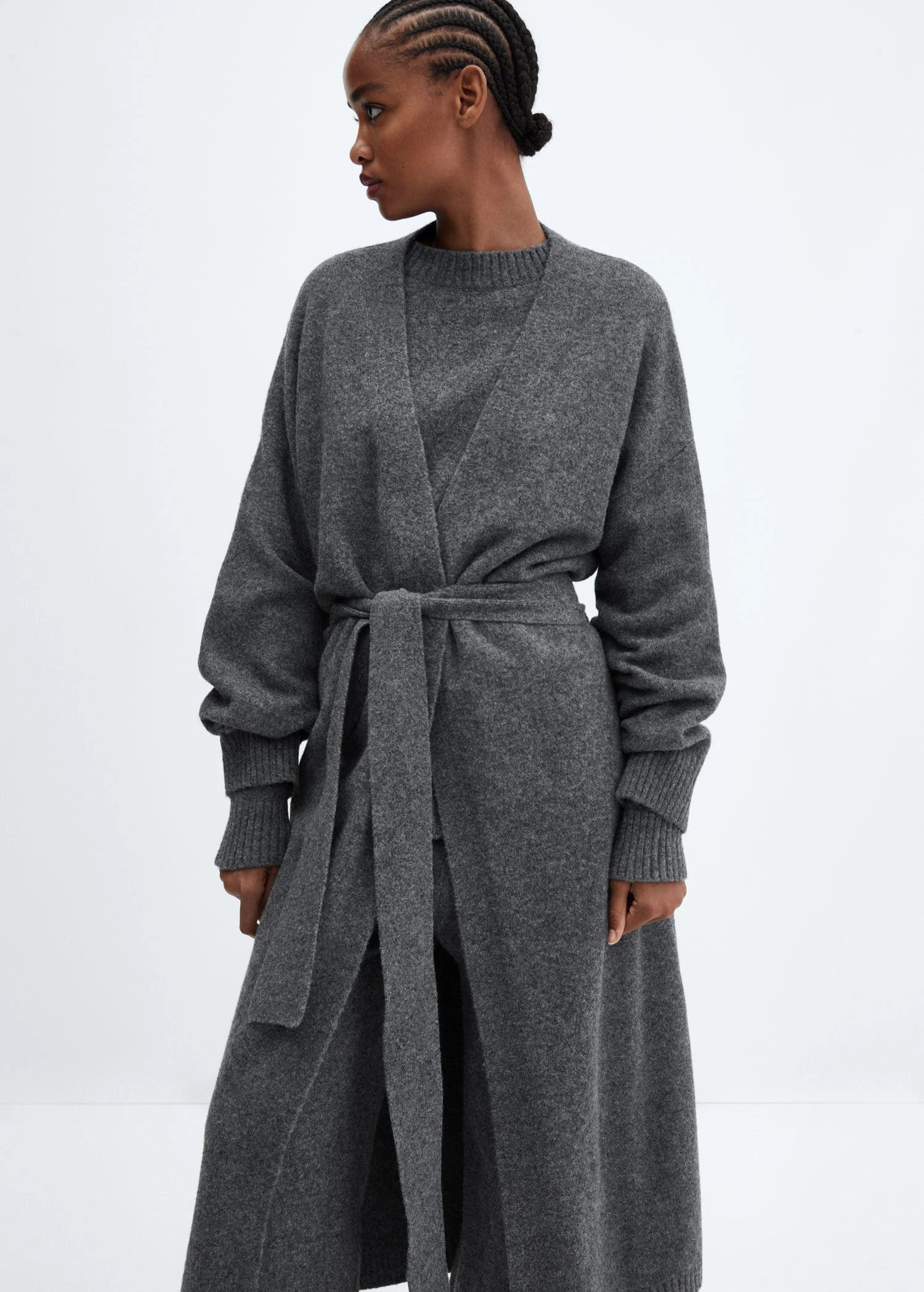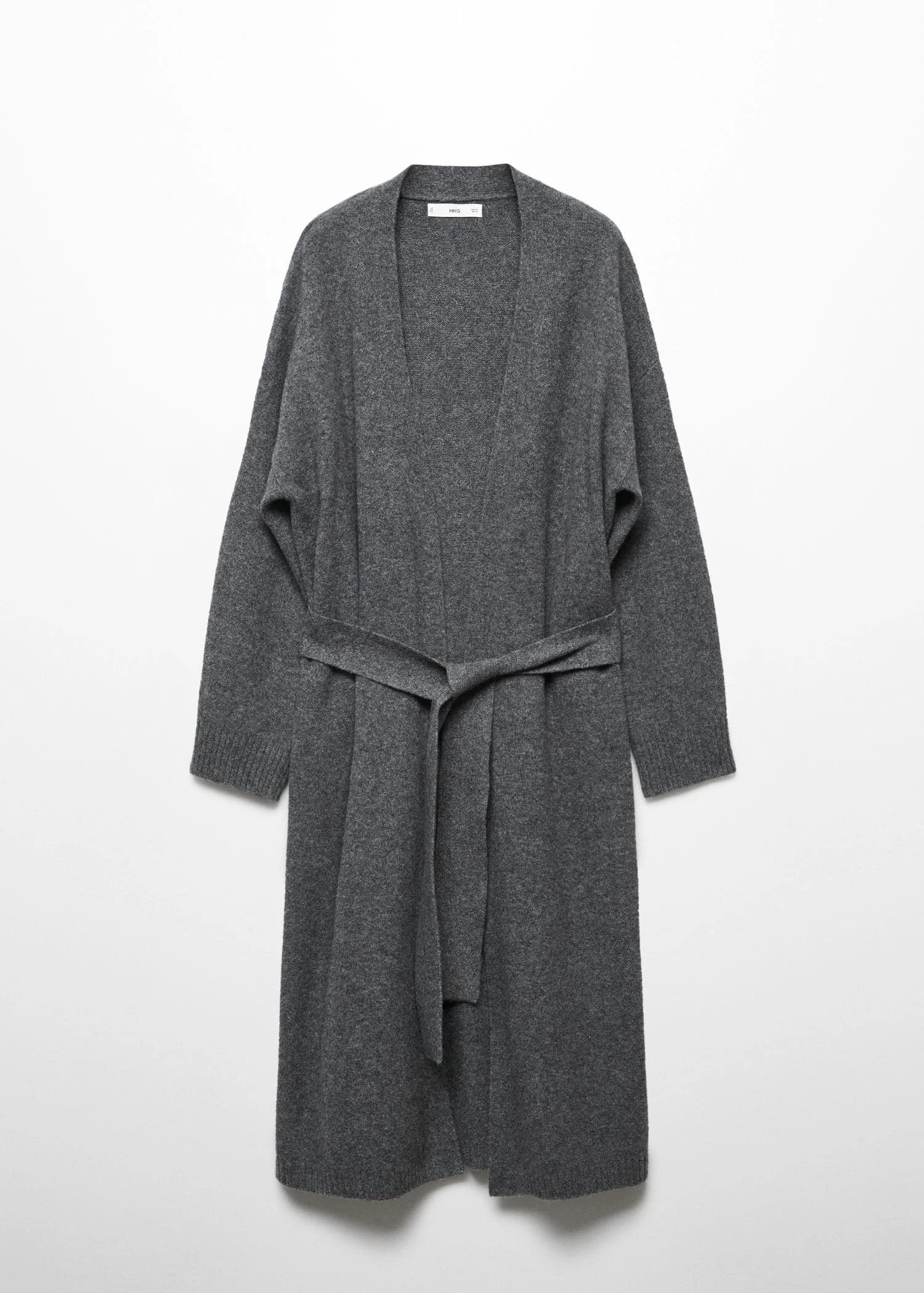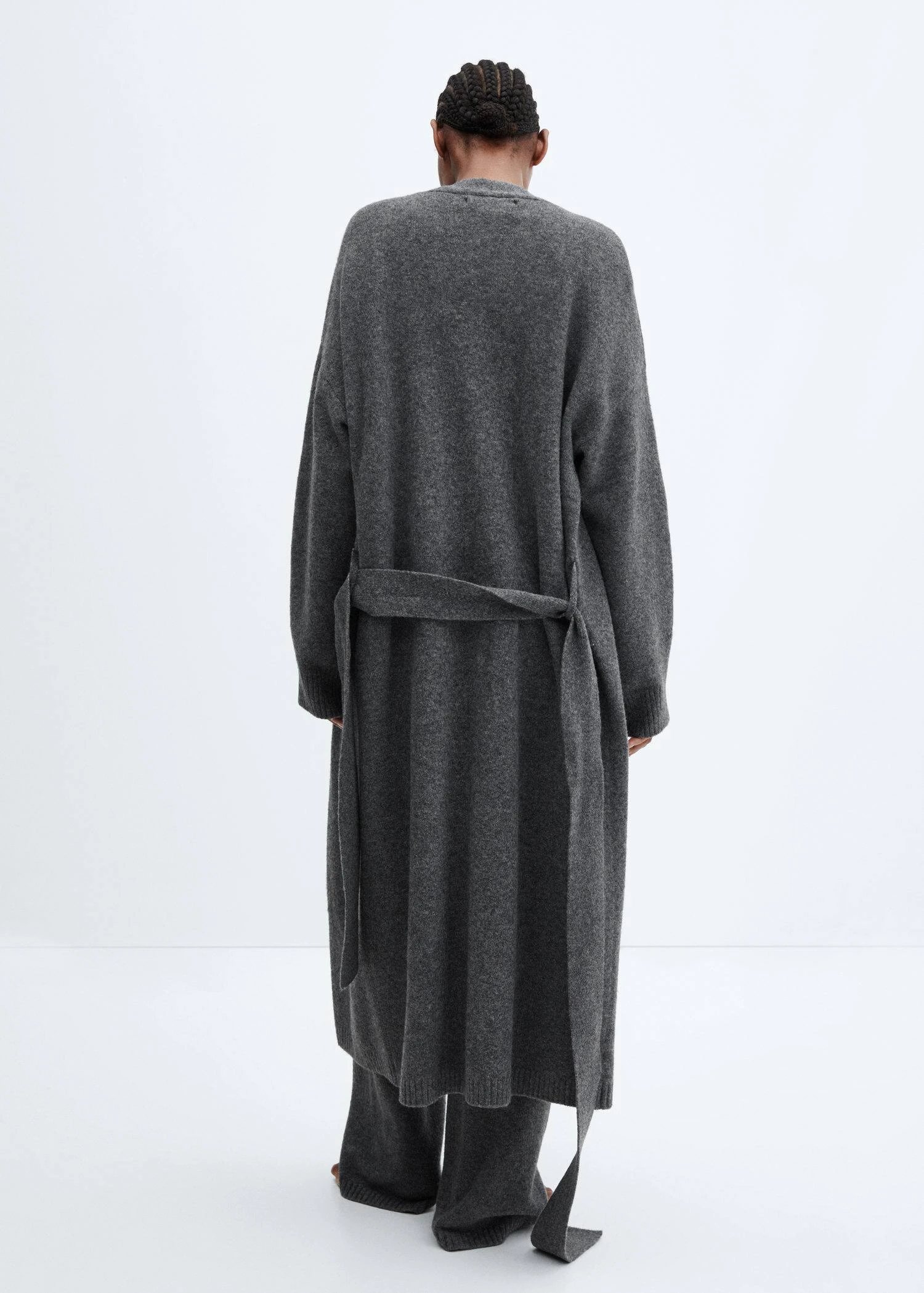 maille moyenne, coupe longue, col cache-cœur en v, manches longues, ceinture decorative, total lookComposition: 55% polyester recyclé,25% acrylique,18% polyamide,2% elasthanne