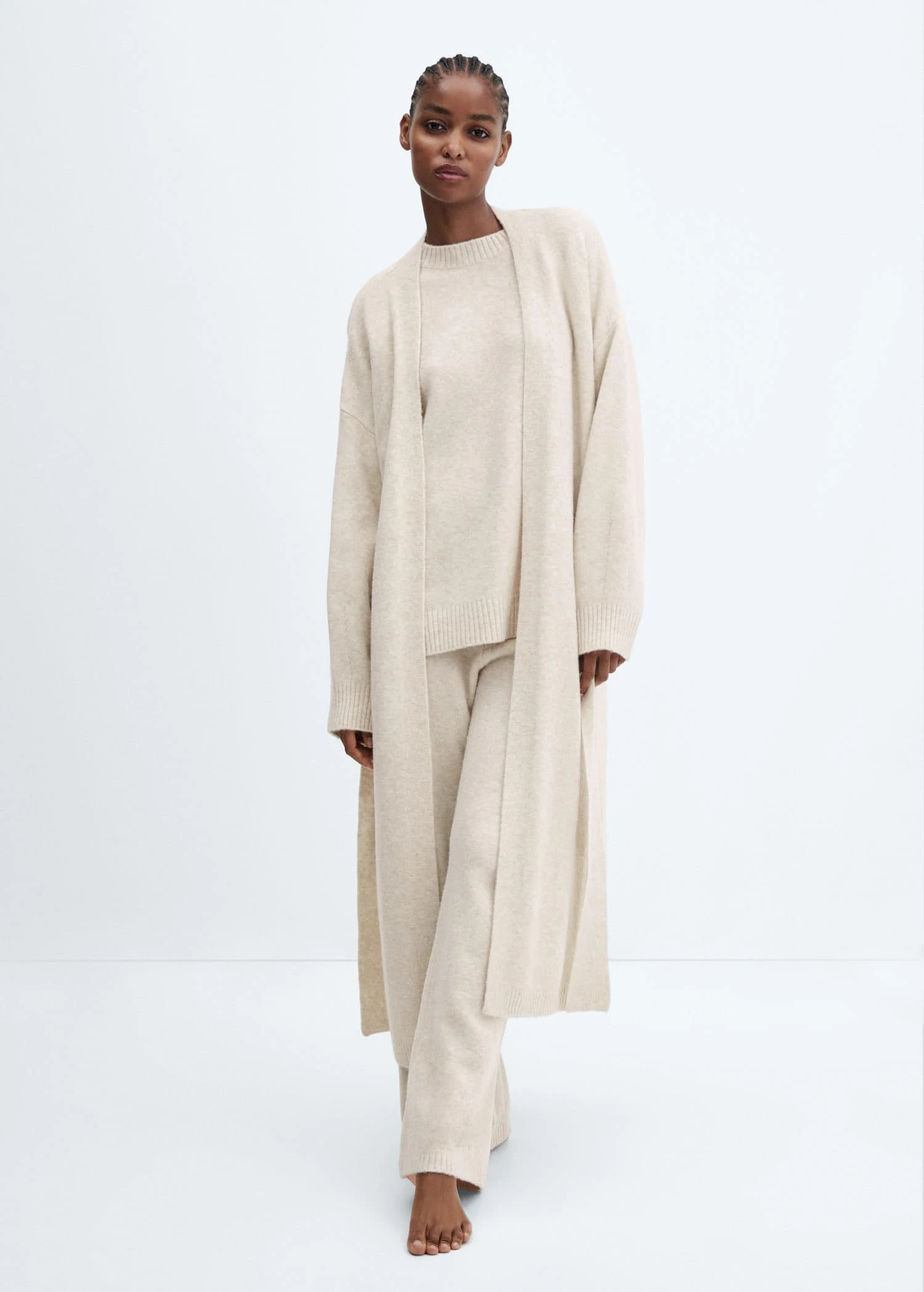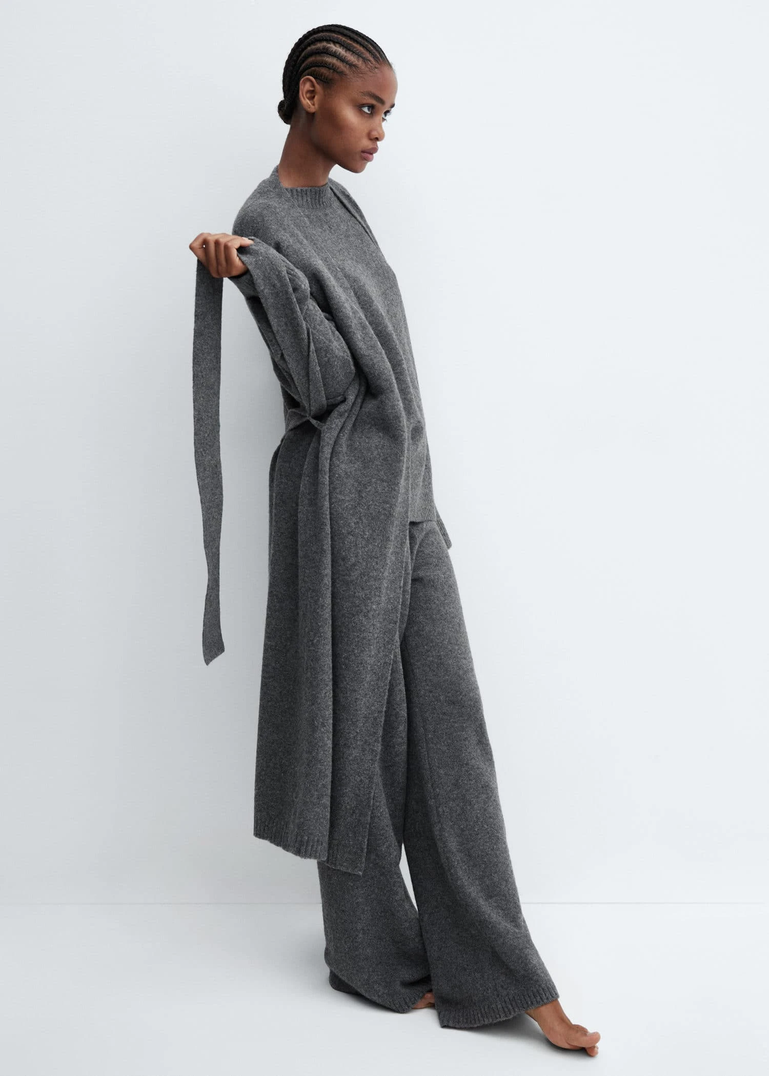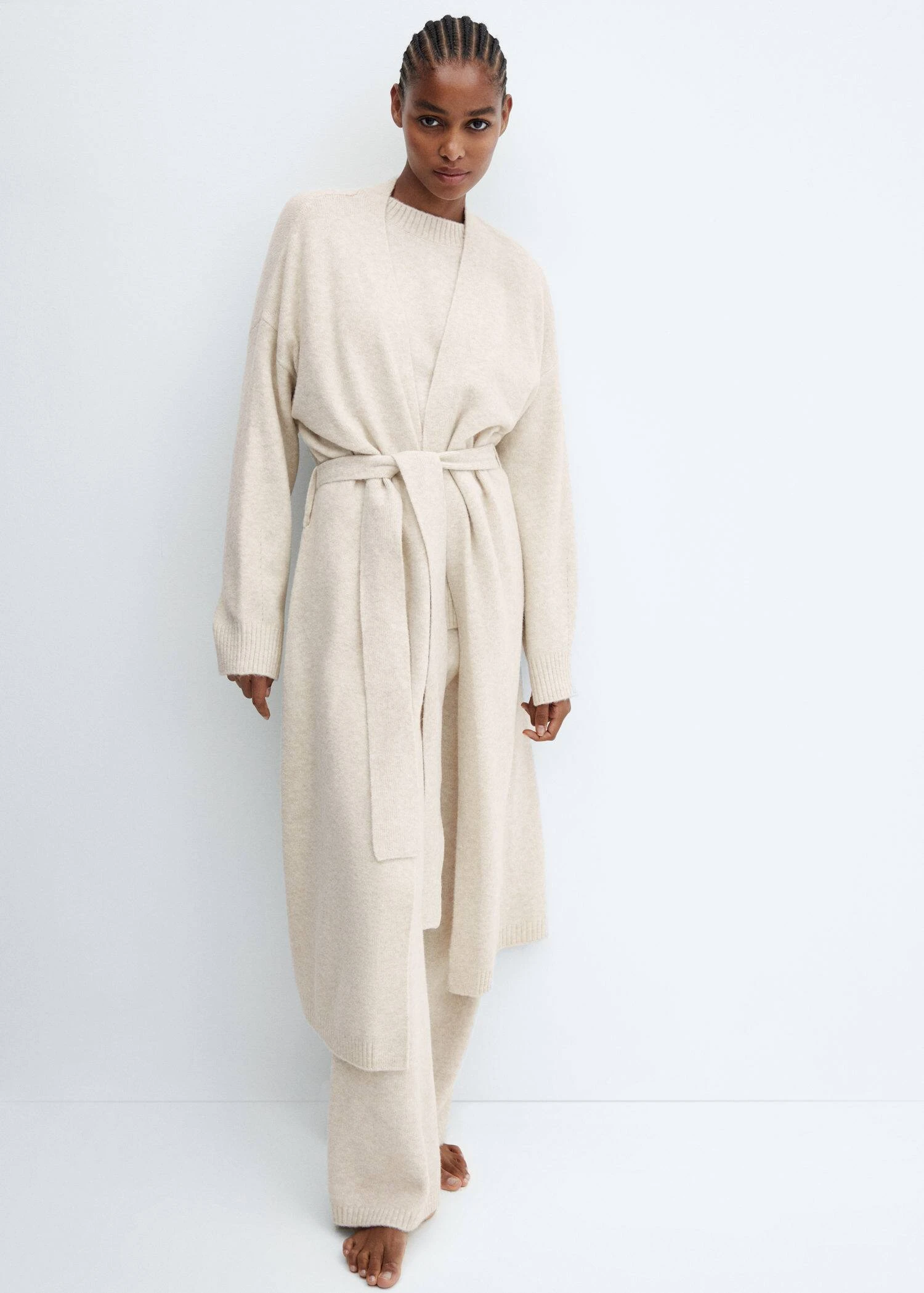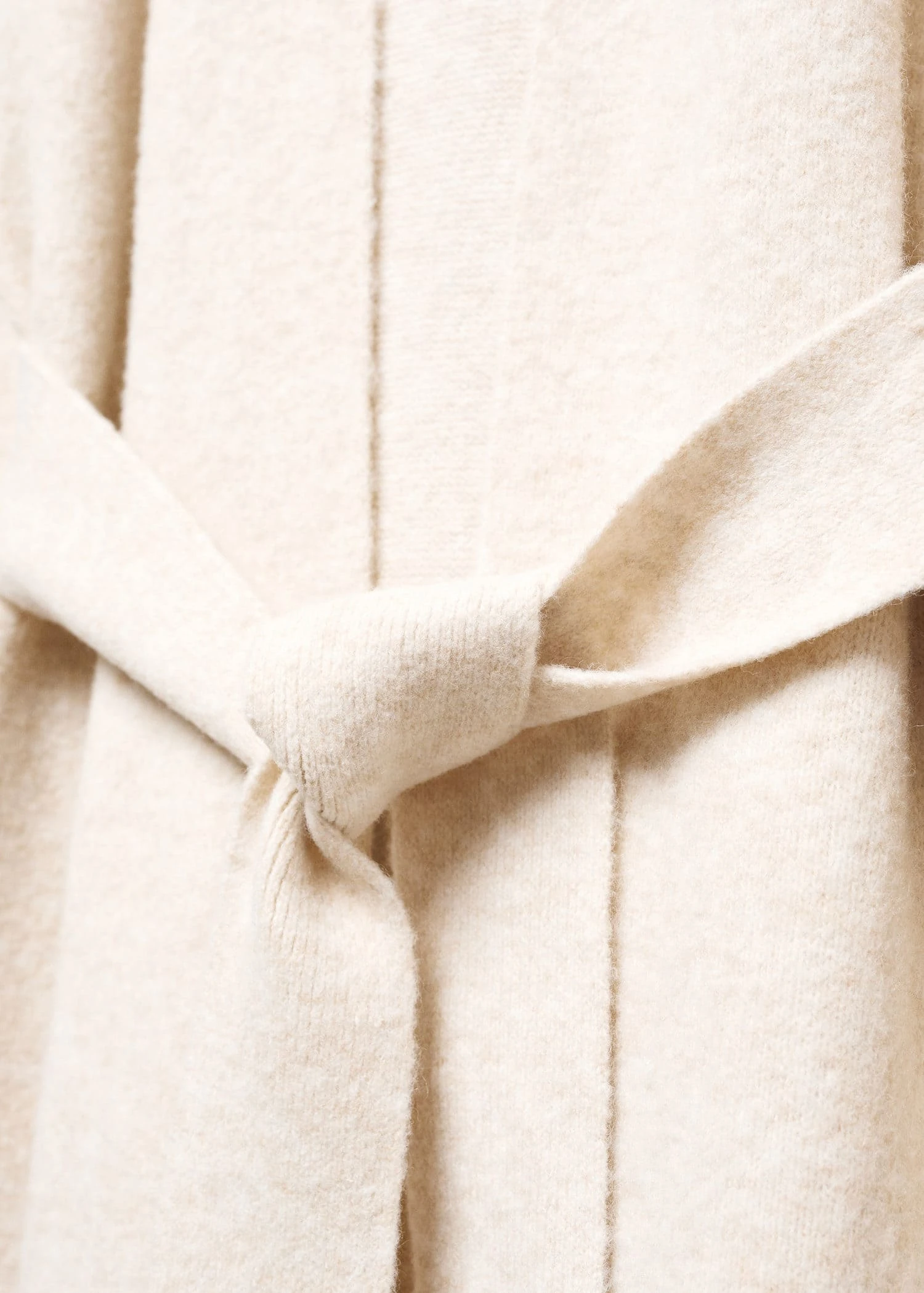 maille moyenne, coupe longue, col cache-cœur en v, manches longues, ceinture decorative, total lookComposition: 55% polyester recyclé,25% acrylique,18% polyamide,2% elasthanne