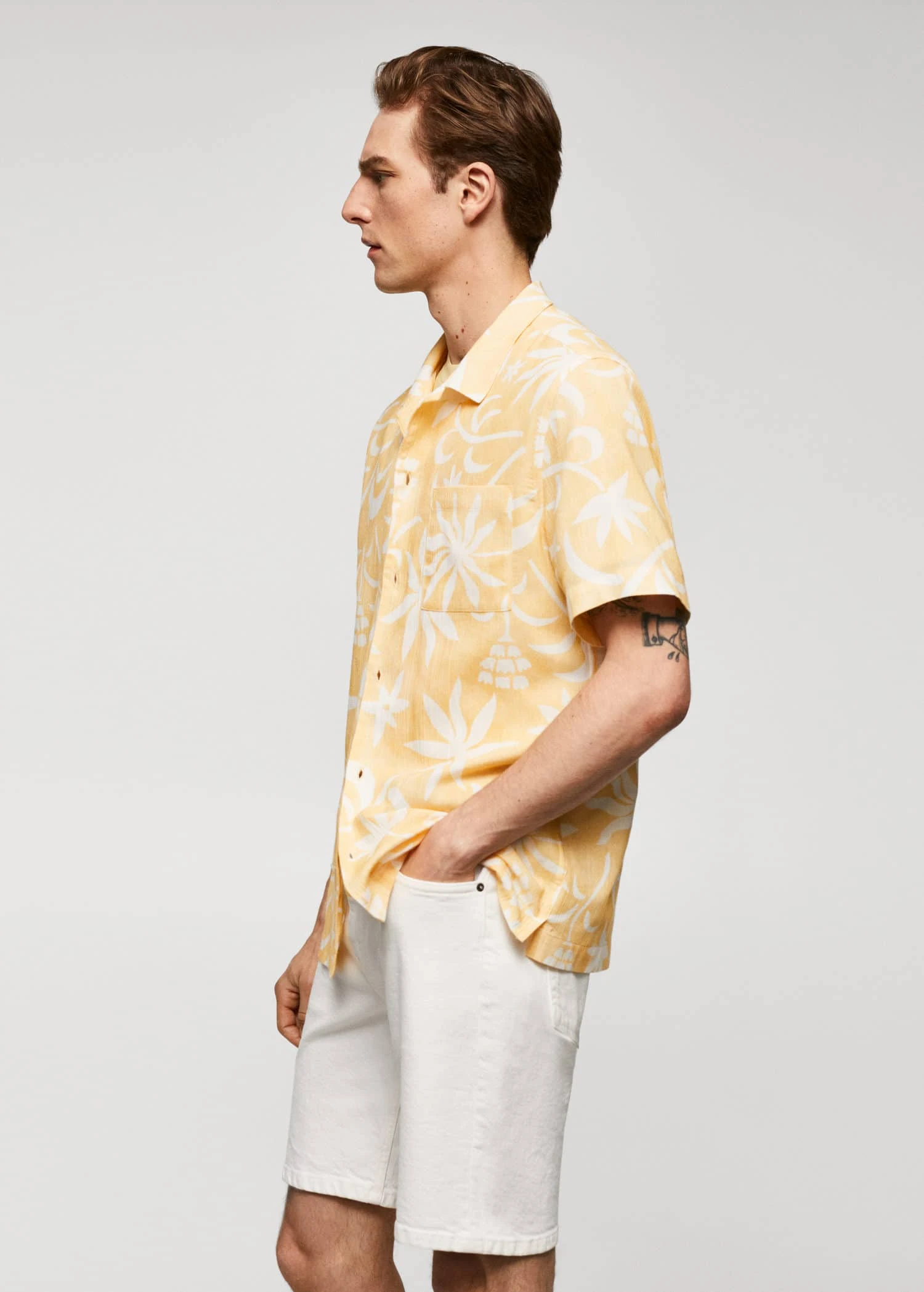 100 % coton, regular-fit, coupe standard, tissu plisse, imprime hawaien, col bowling boutonne, poche plaquee sur la poitrine, manches courtes, bas droit, fentes laterales a la base, le mannequin mesure 190 cm et porte une taille mComposition: 100% coton