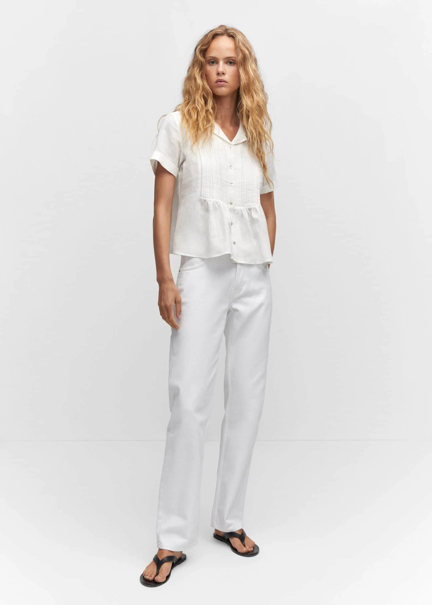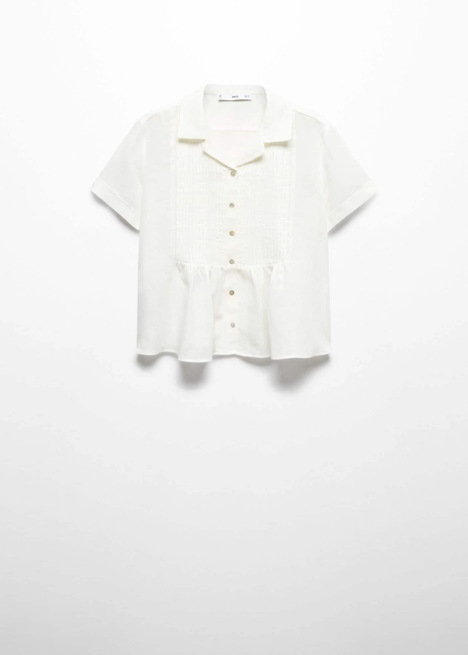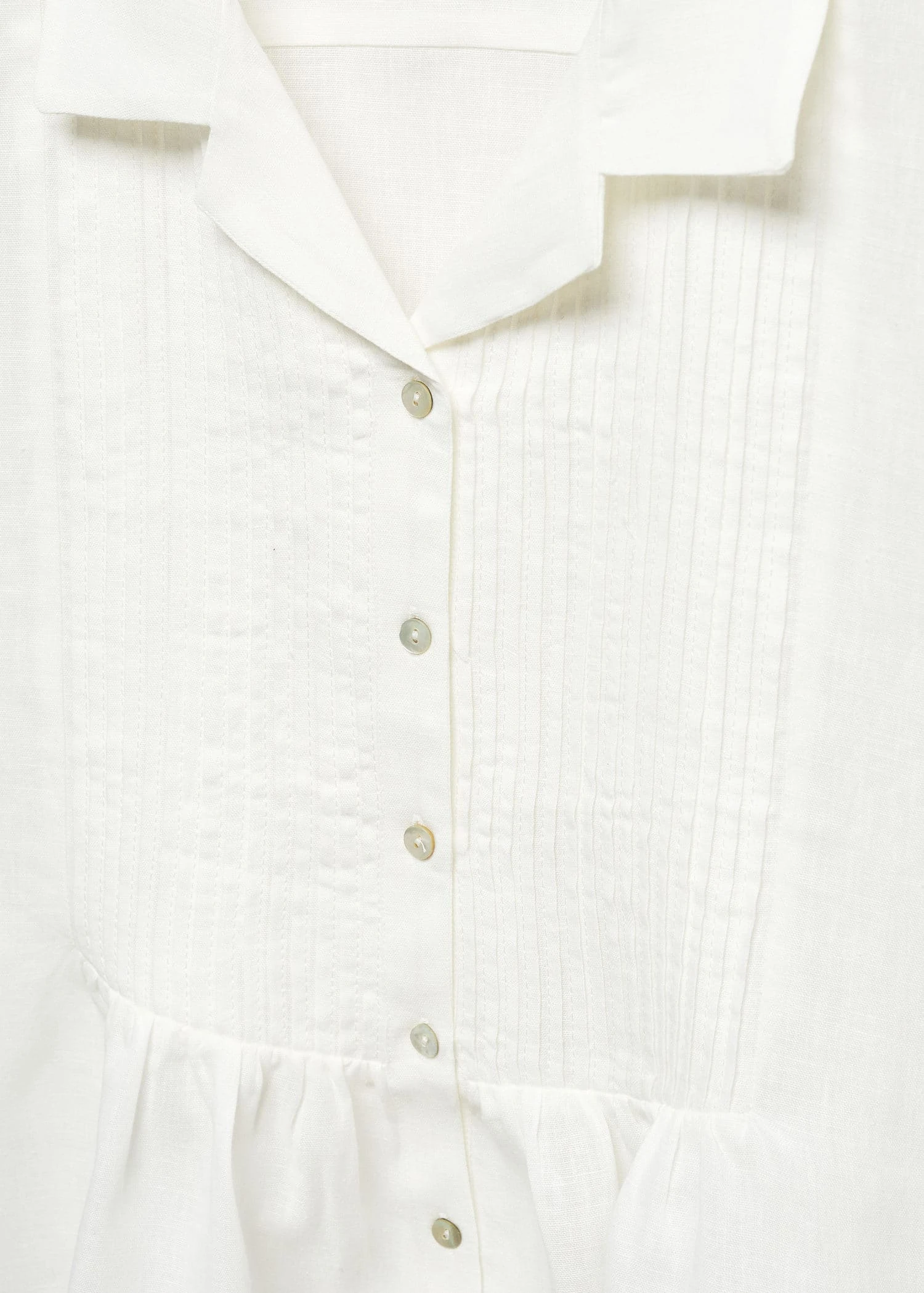 tissu de coton et lin melange, tissu fluide, coupe courte, coupe droite, gros plis, col chemise, manches courtes retournees, fermeture boutonnee sur le devant, boutons imitation nacre, detail fronce, fentes lateralesComposition: 59% lin,41% coton