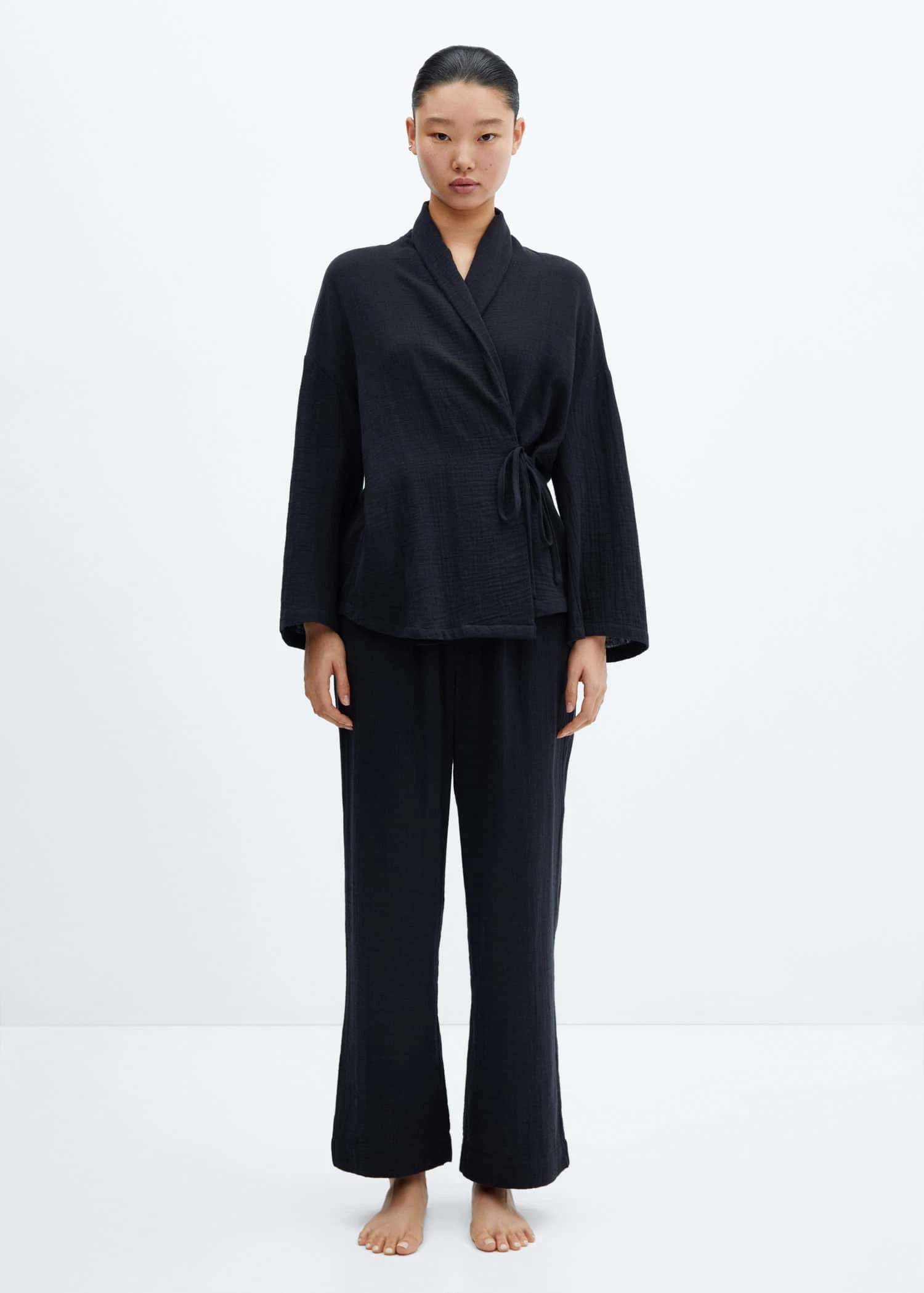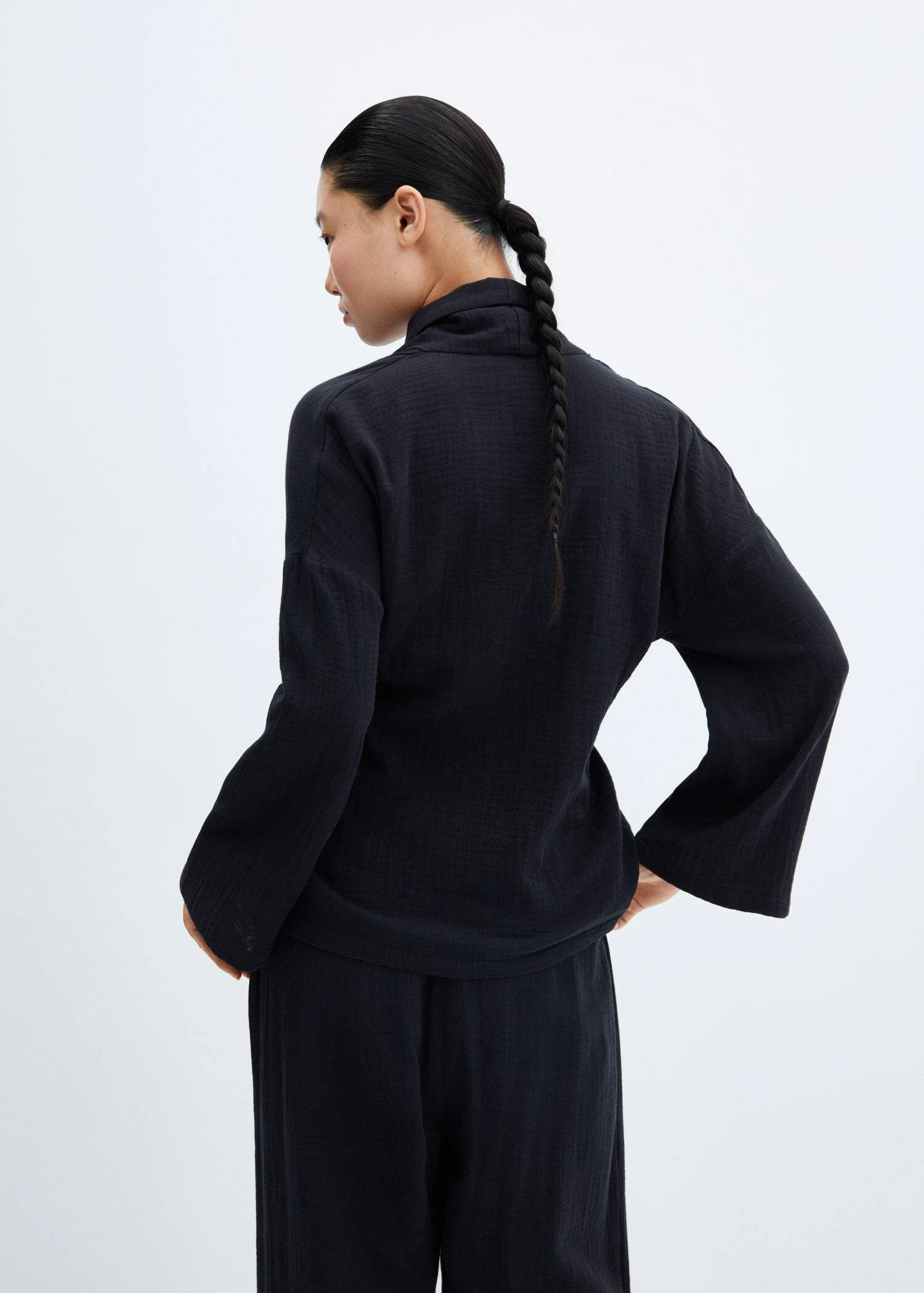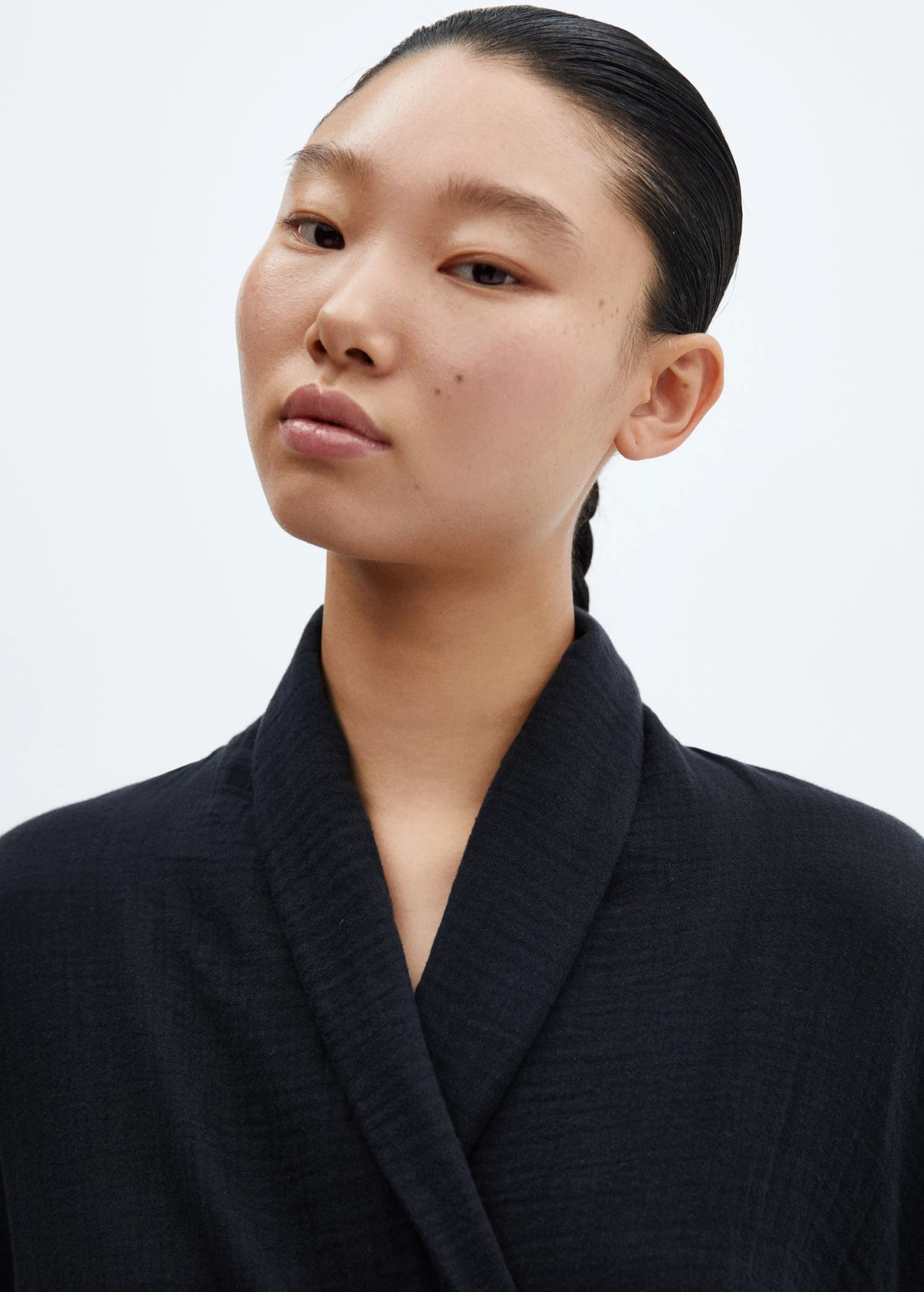 tissu 100 % coton, tissu fluide, droit, croise, col en v avec rabat, col cache-cœur, fermeture laterale a nœuds, manches longues cloche, total lookComposition: 100% coton