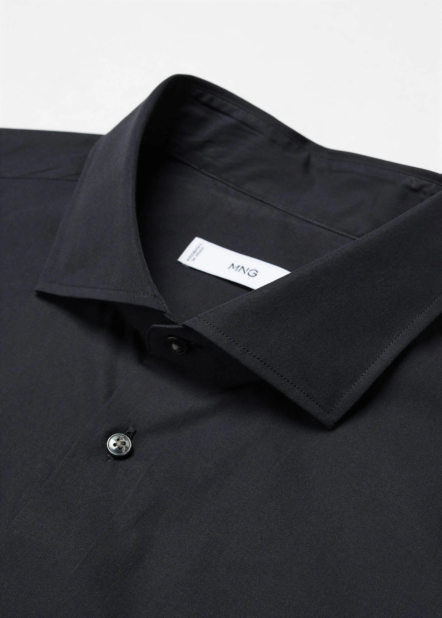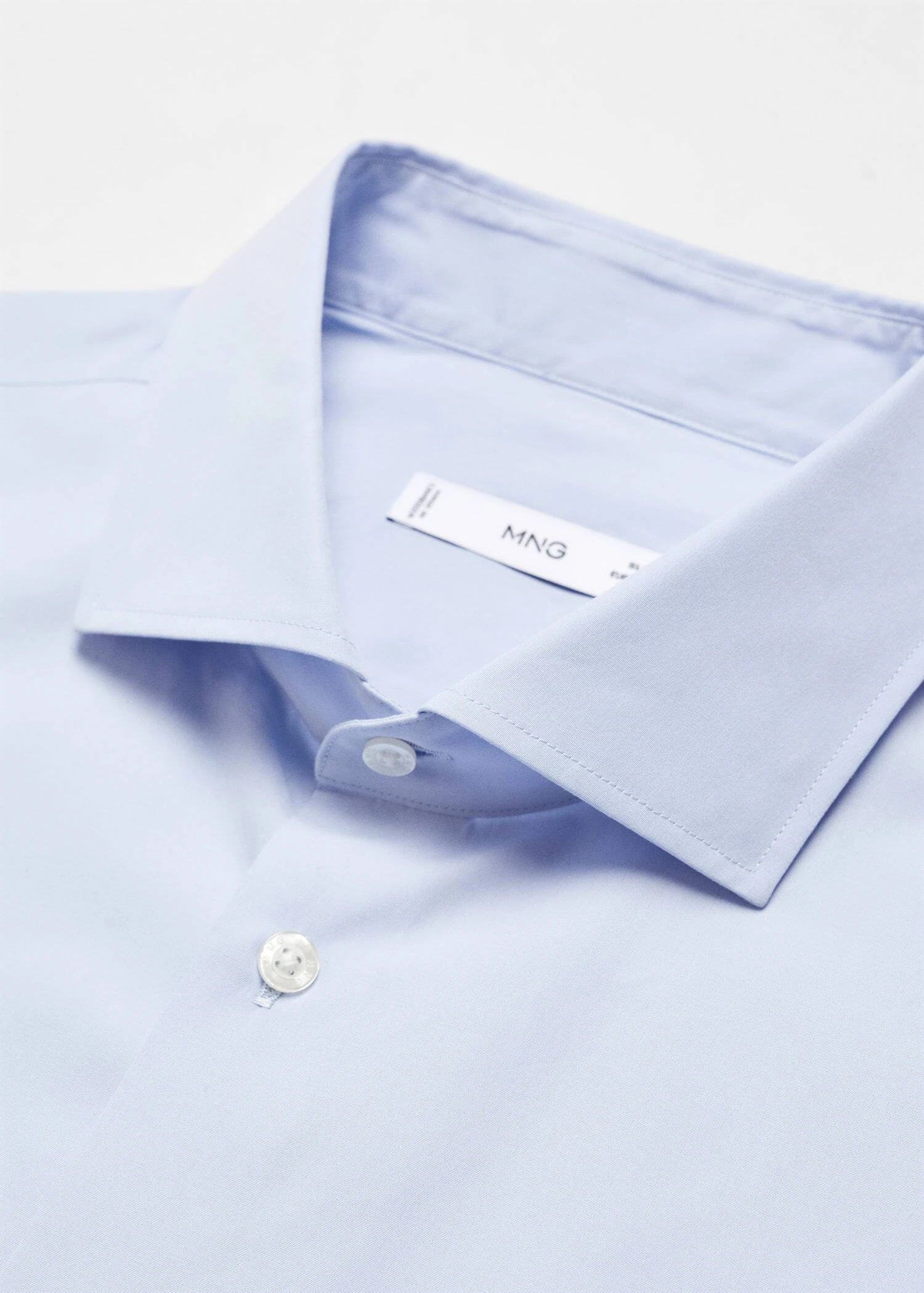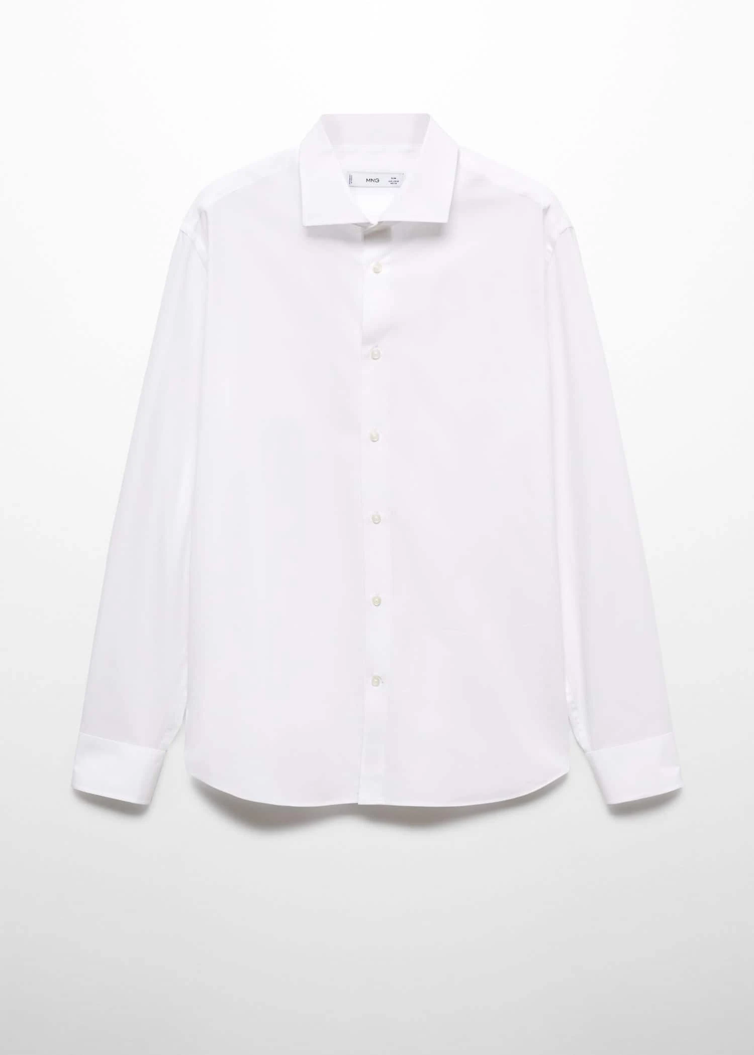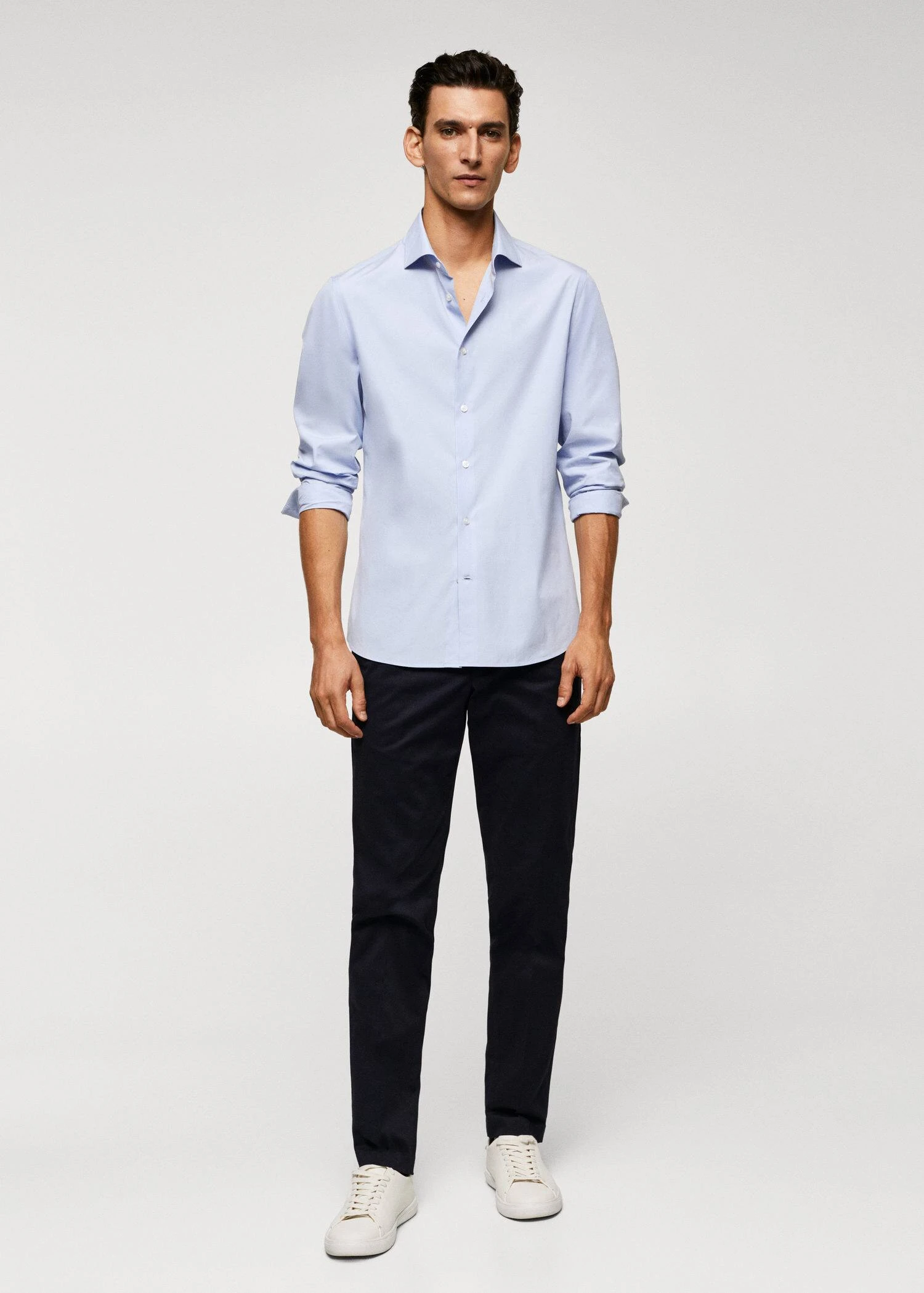 les essentiels : concus pour durer, tissu de popeline 100 % coton, slim-fit, col italien, fermeture a boutons sur le devant, manches longues boutonnees, bas arrondi, le mannequin mesure 190 cm et porte une taille mComposition: 100% coton
