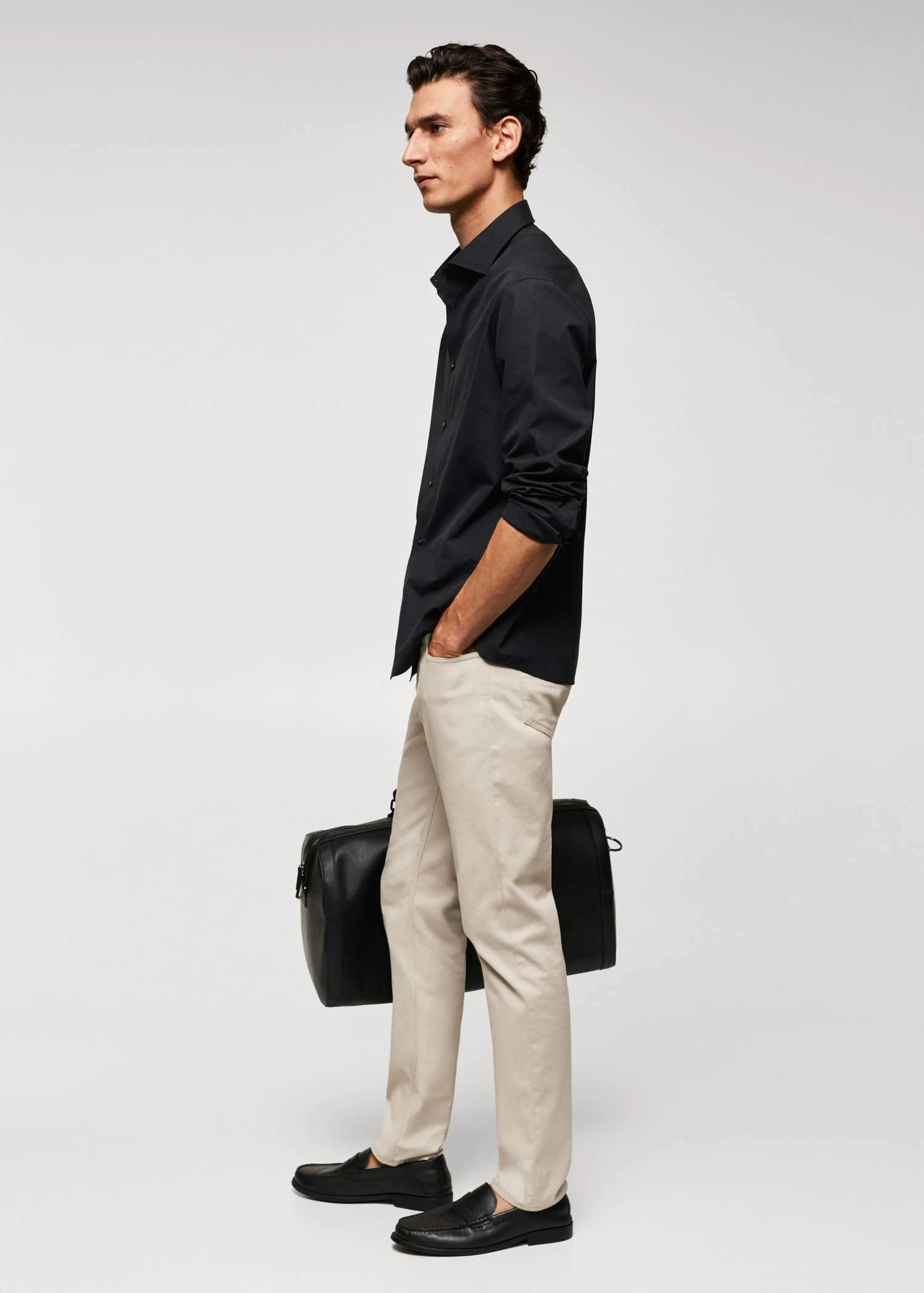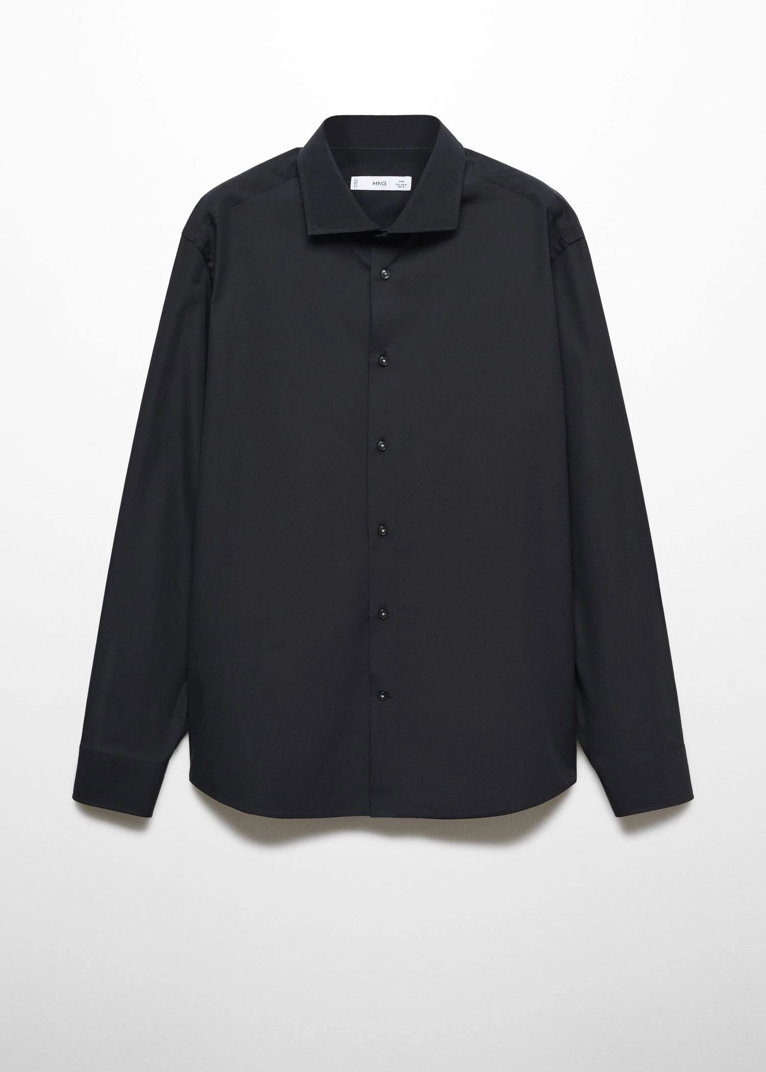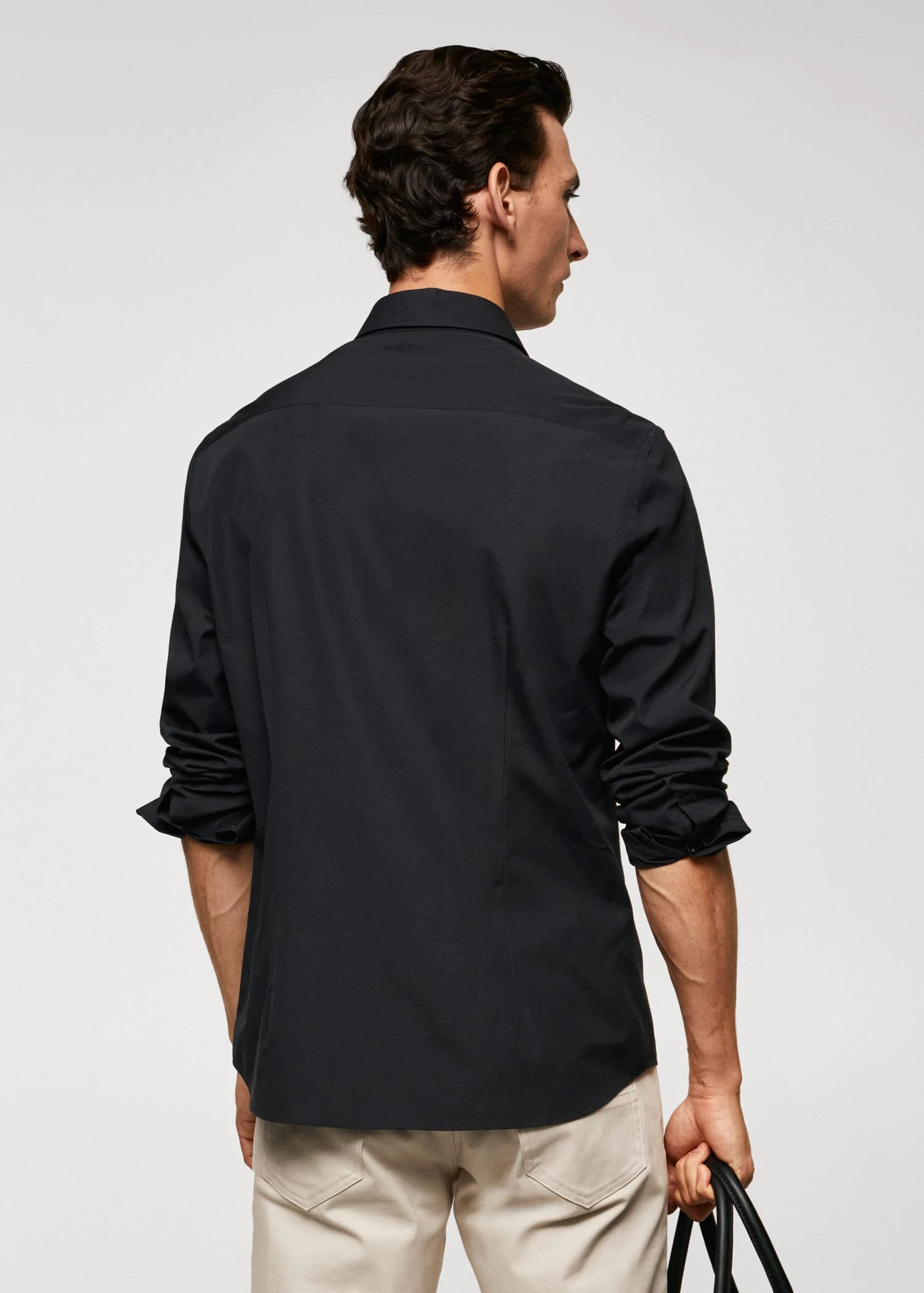 les essentiels : concus pour durer, tissu de popeline 100 % coton, slim-fit, col italien, fermeture a boutons sur le devant, manches longues boutonnees, bas arrondi, le mannequin mesure 190 cm et porte une taille mComposition: 100% coton