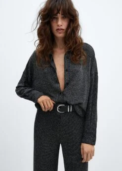 tissu lurex, coupe longue, droit, col chemise, manches longues avec poignets boutonnes, fermeture a boutons sur le devant, total look, disponible plus, collection fetes et ceremonies.Composition: 84% polyamide,7% polyester,6% elasthanne,3% polyester avec revêtement de cuivre