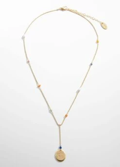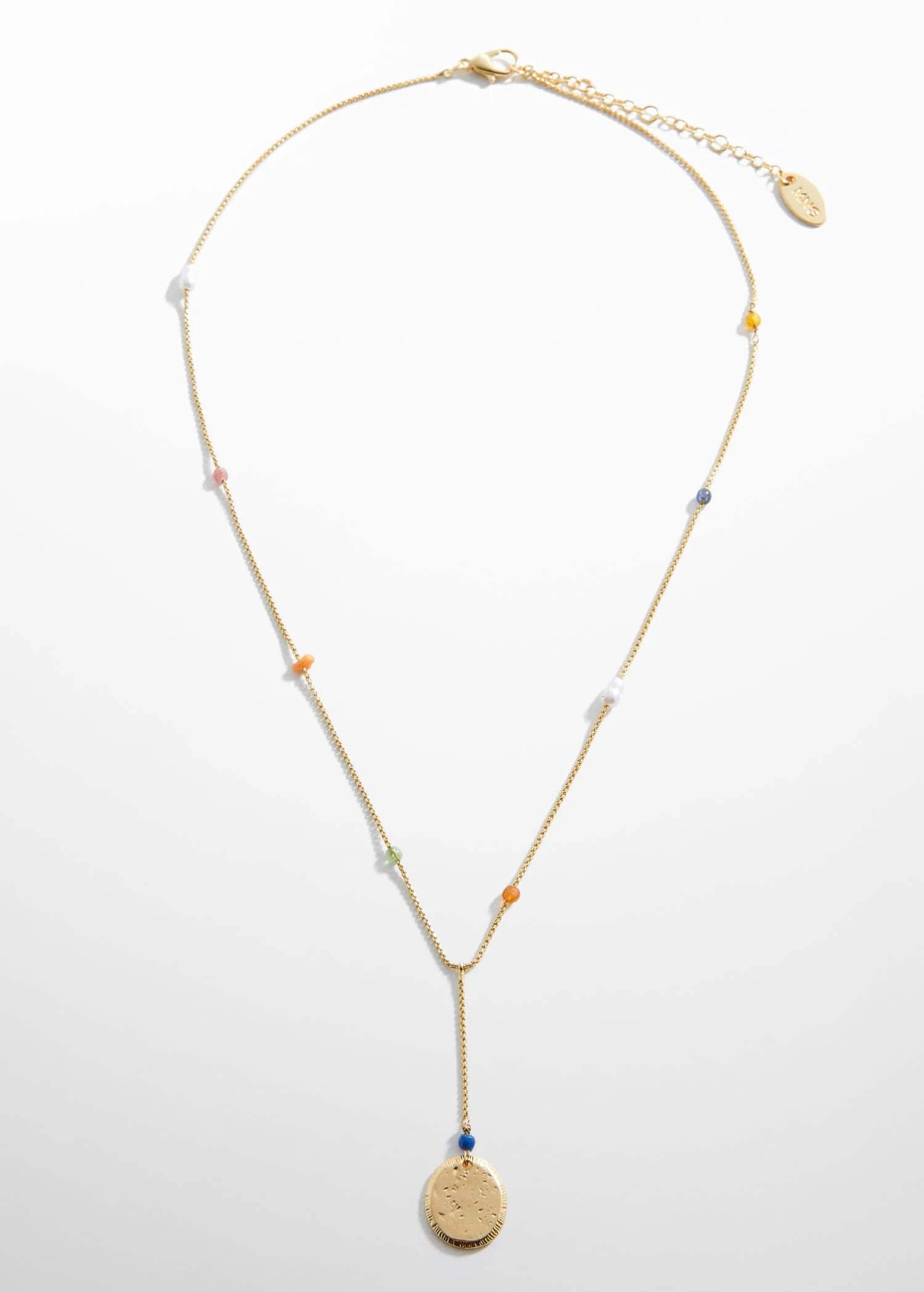 detail perle, pendentif en forme de piece, fermoir a chainette et mousquetonComposition: 40% laiton,40% zinc,20% acrylique