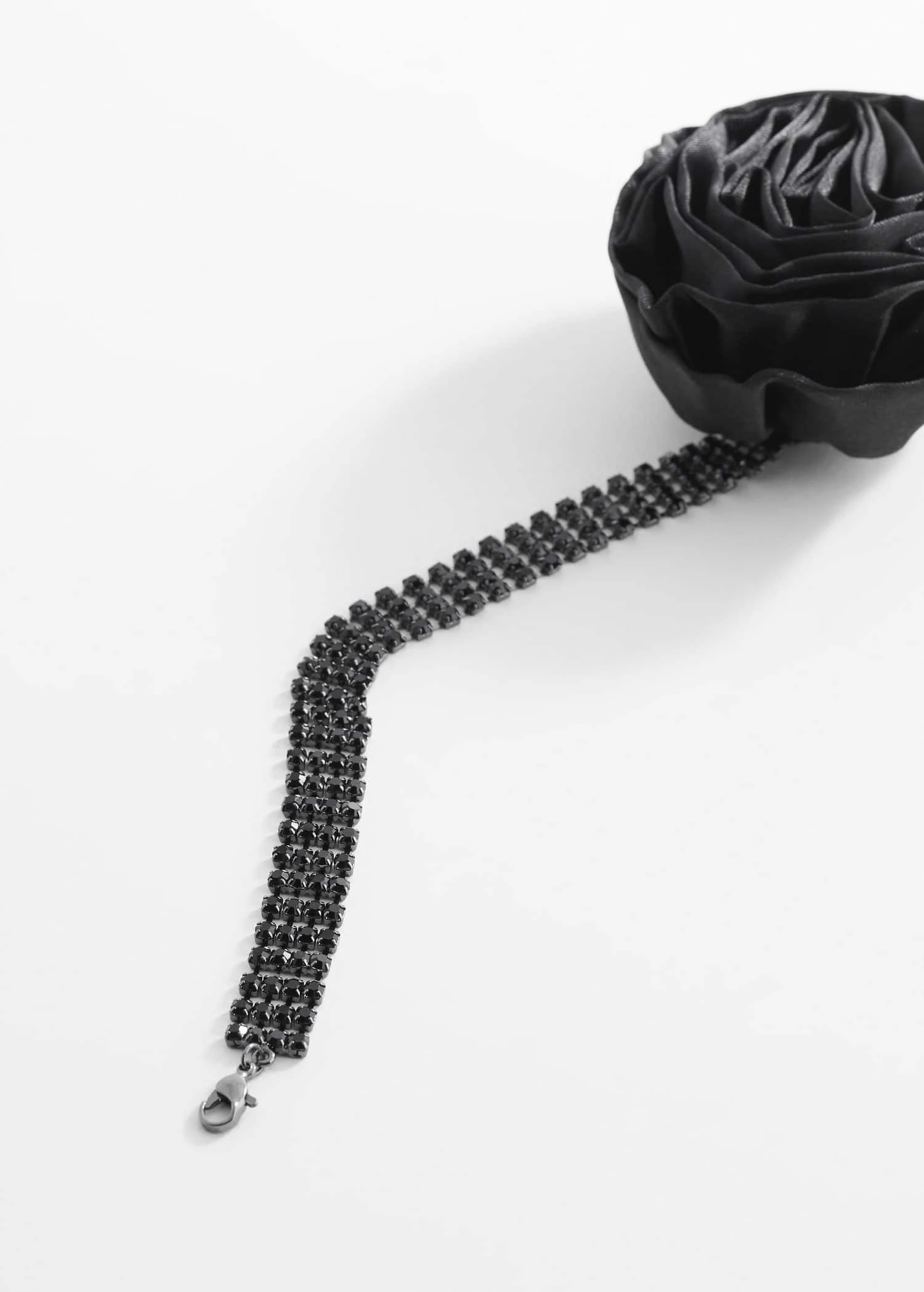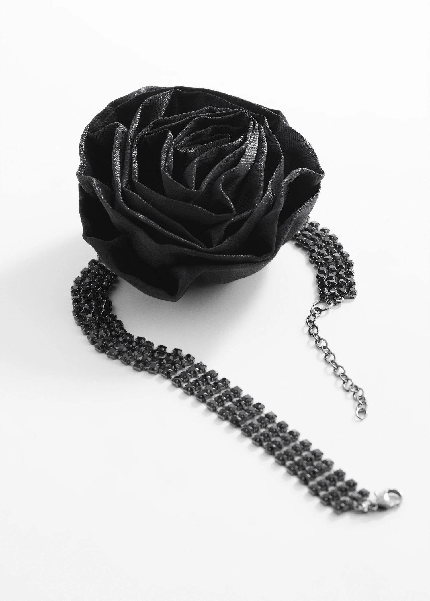 tissu satine, style choker, maxifleur, detail cristaux decoratifs, fermoir a chainette et mousqueton, collection fetes et ceremonies.Composition: 40% fer,35% polyester,25% verre