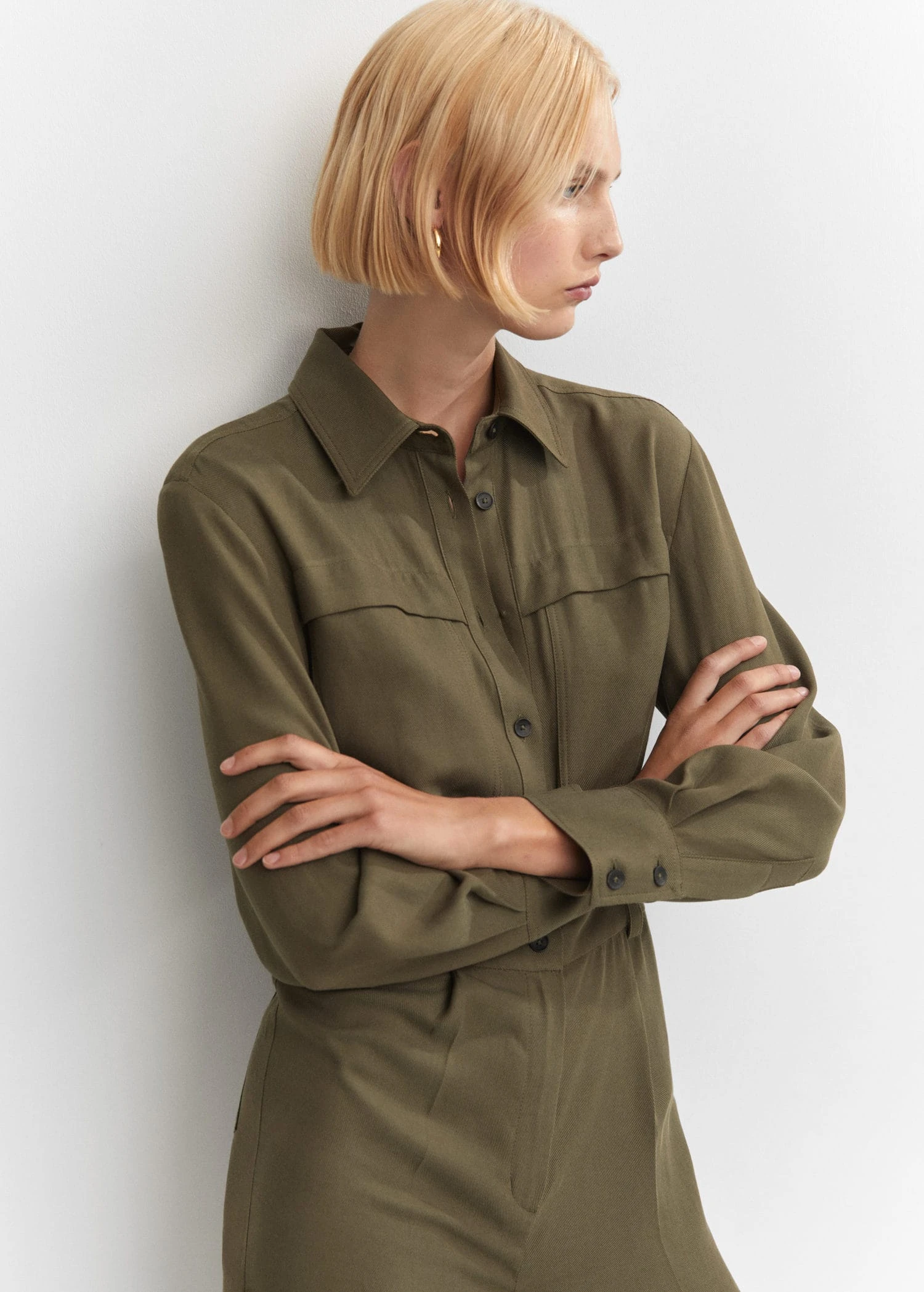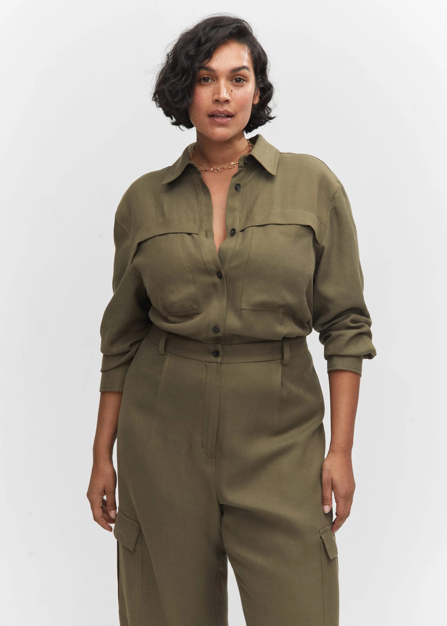 tissu de coton melange, coupe longue, col chemise, manches longues avec poignets boutonnes, deux poches plaquees a l’arriere, deux poches plaquees sur la poitrine, deux poches a rabat sur les cotes, fermeture eclair avec bouton, fermeture a boutons sur le devant, passants pour la ceinture, disponible plusComposition: 55% lyocell,45% coton