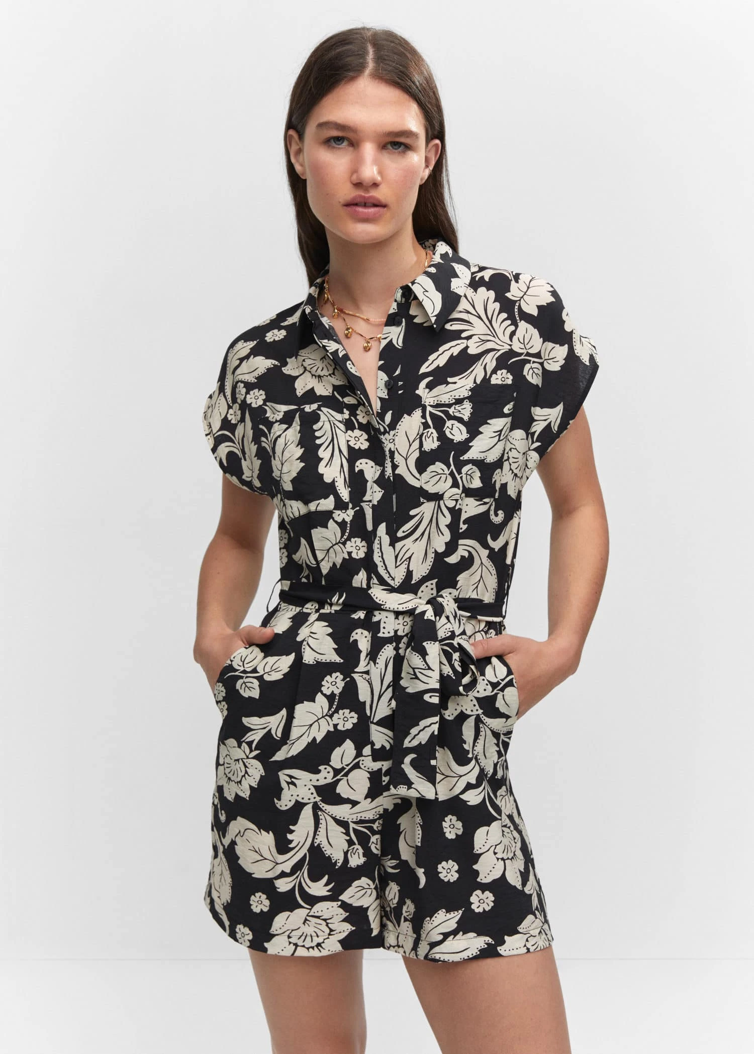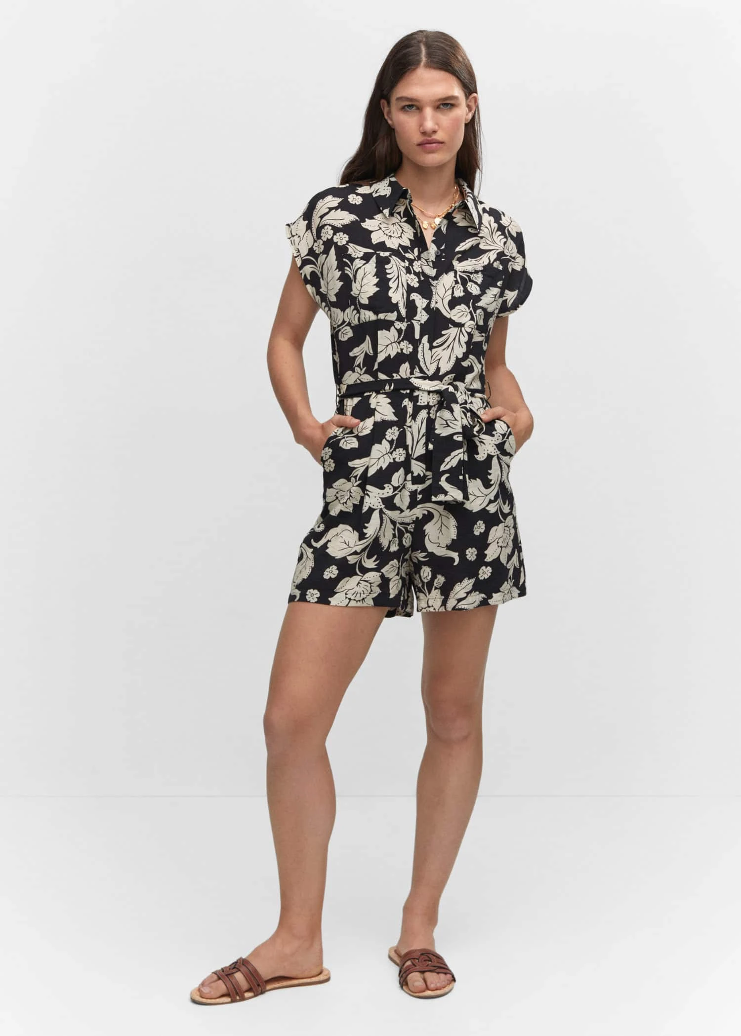 tissu fluide, coupe droite, coupe courte, imprime floral, col chemise, sans manches, ceinture a nouer a la taille, fermeture boutonnee sur le devantComposition: 85% viscose,15% polyamide