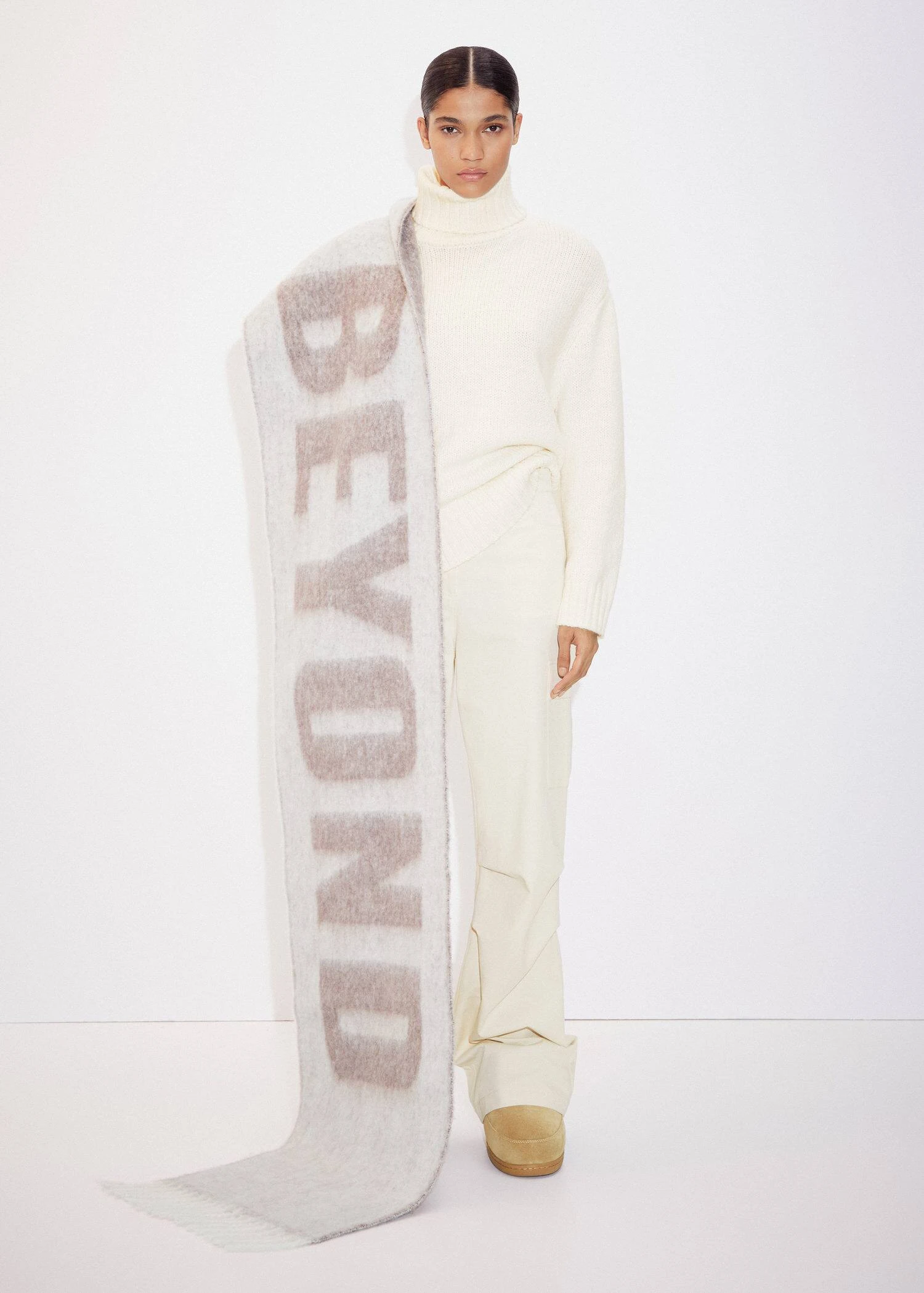 tissu de laine melange, bicolore, message imprime, bord frangeComposition: 77% polyester,23% laine