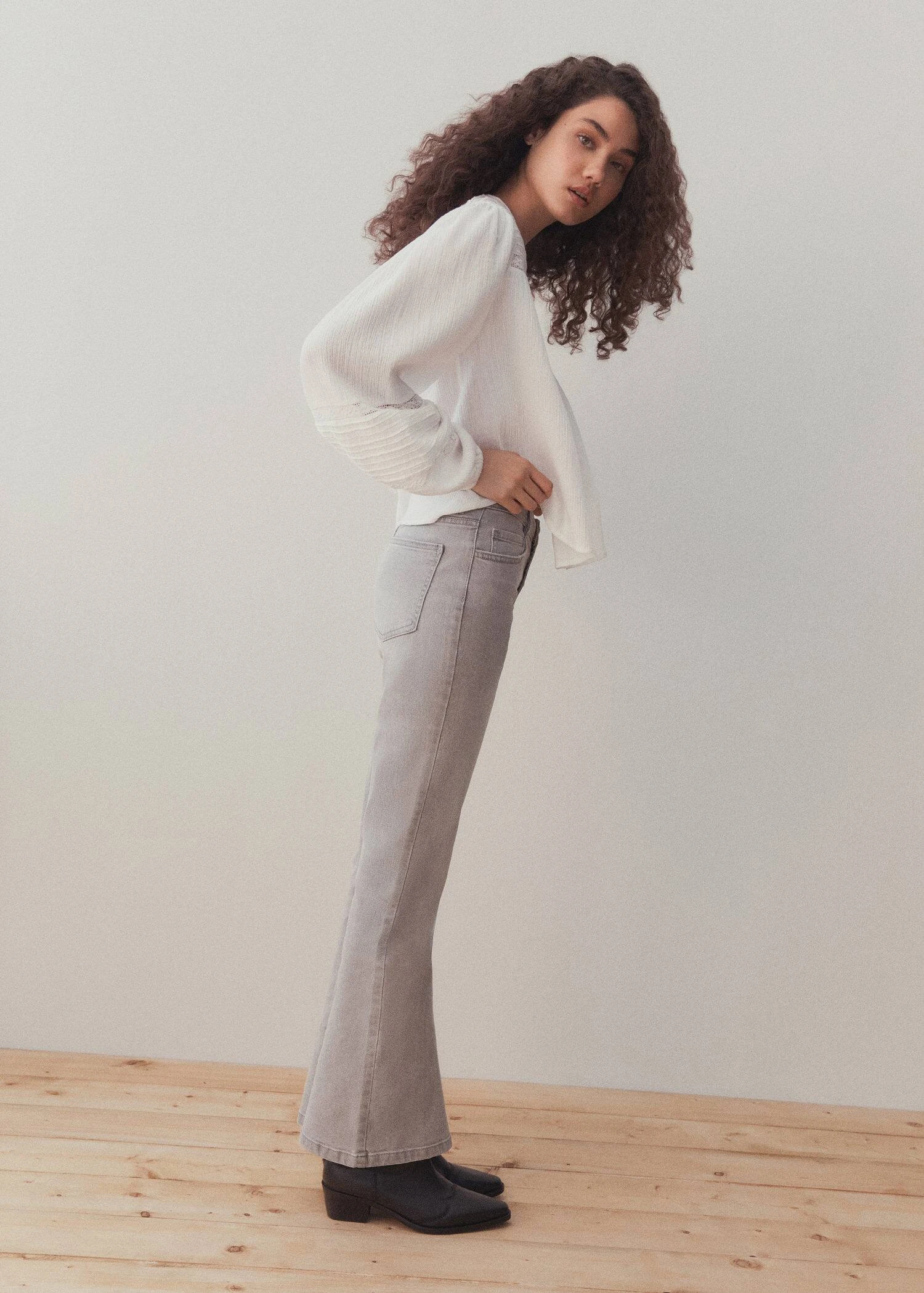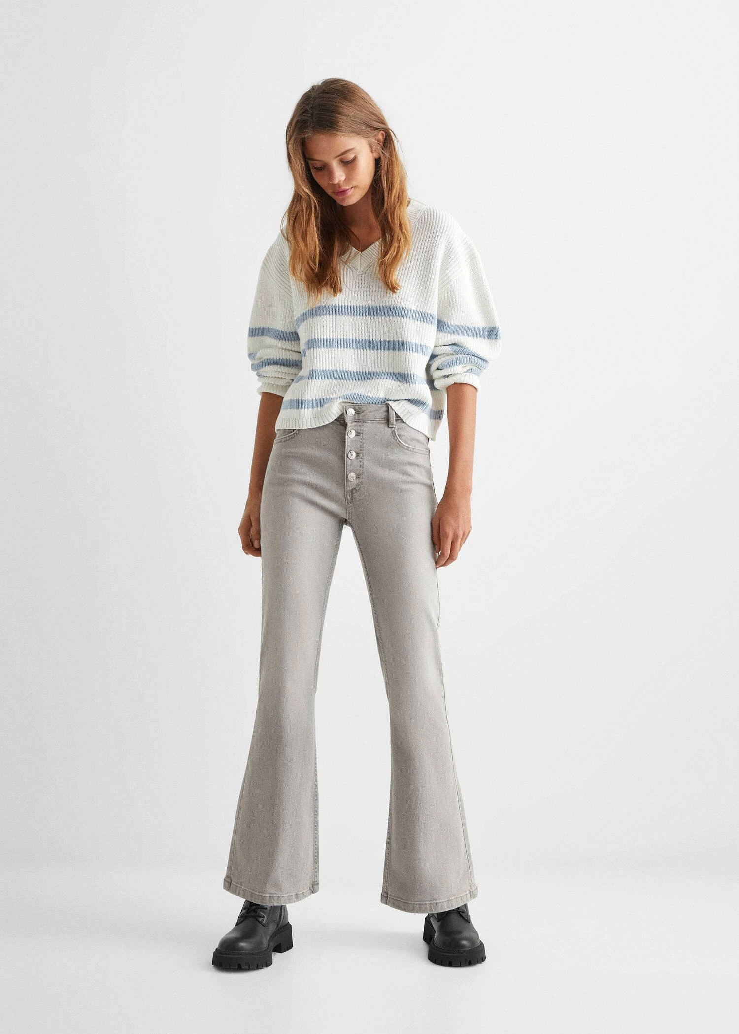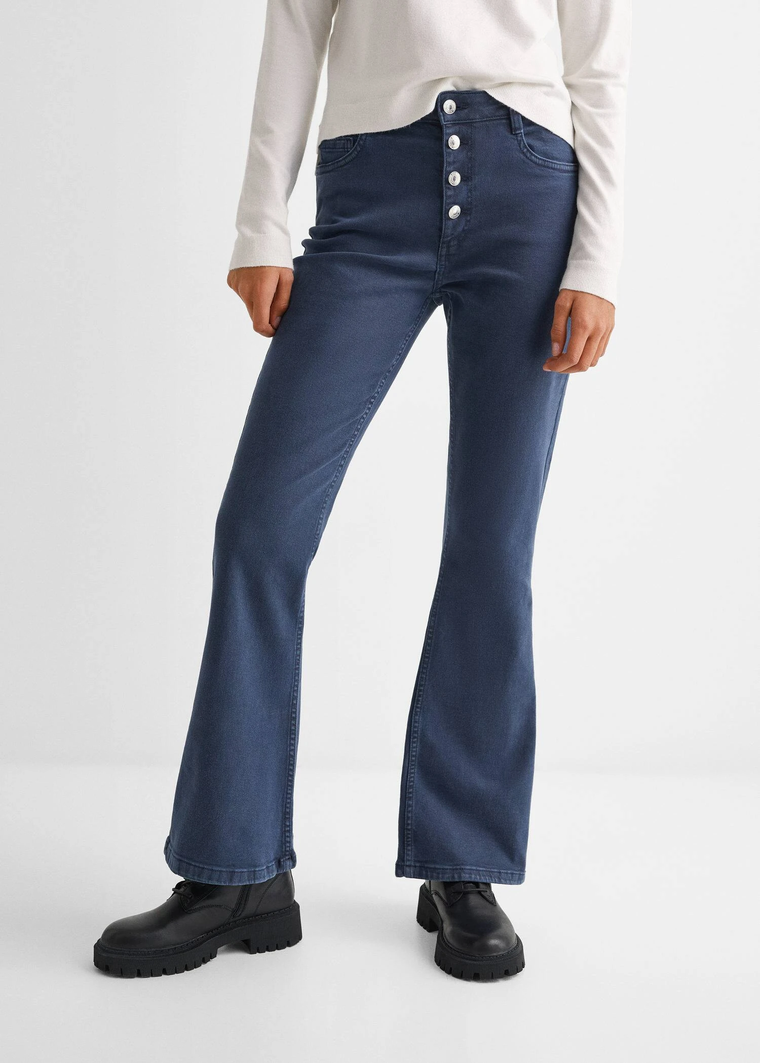 tissu en coton, tissu elastique, style flare, taille haute, cinq poches, fermeture boutonnee, le mannequin mesure 172 cm et porte une taille mComposition: 98% coton,2% elasthanne