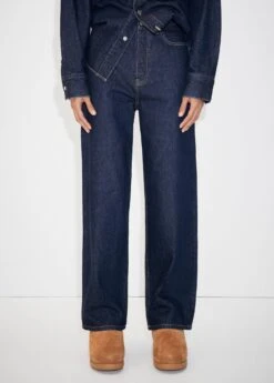 tissu en coton de style jean, tissu en coton organique recycle melange, coupe longue, coupe wideleg, taille normale, cinq poches, passants pour la ceinture, fermeture boutonneeComposition: 100% coton