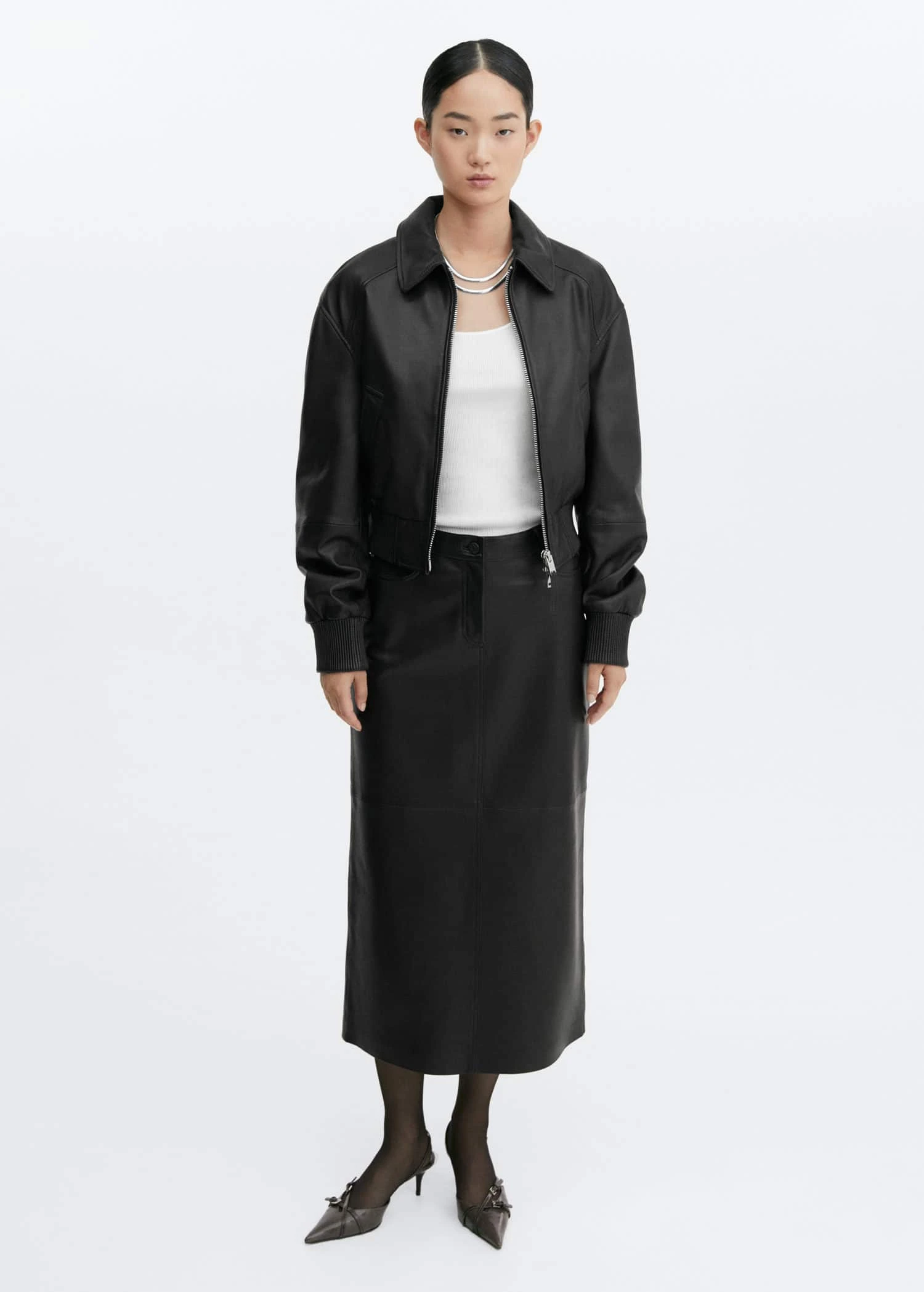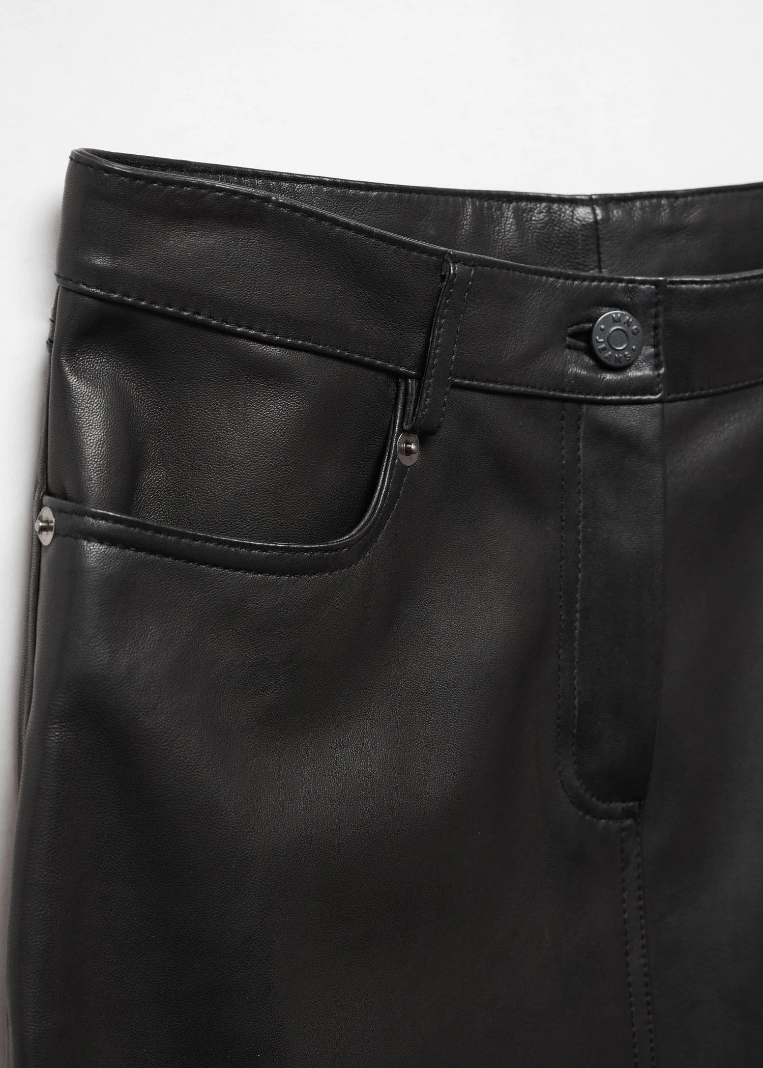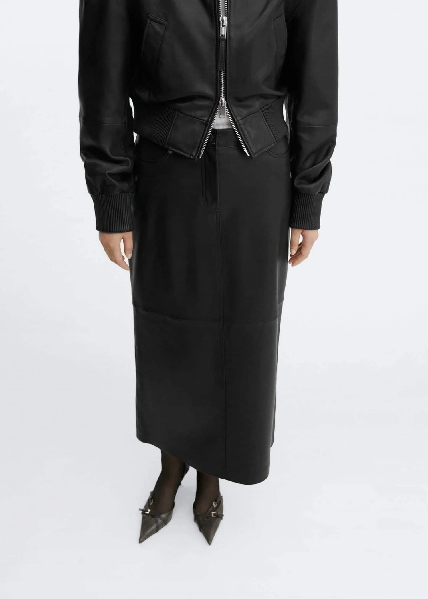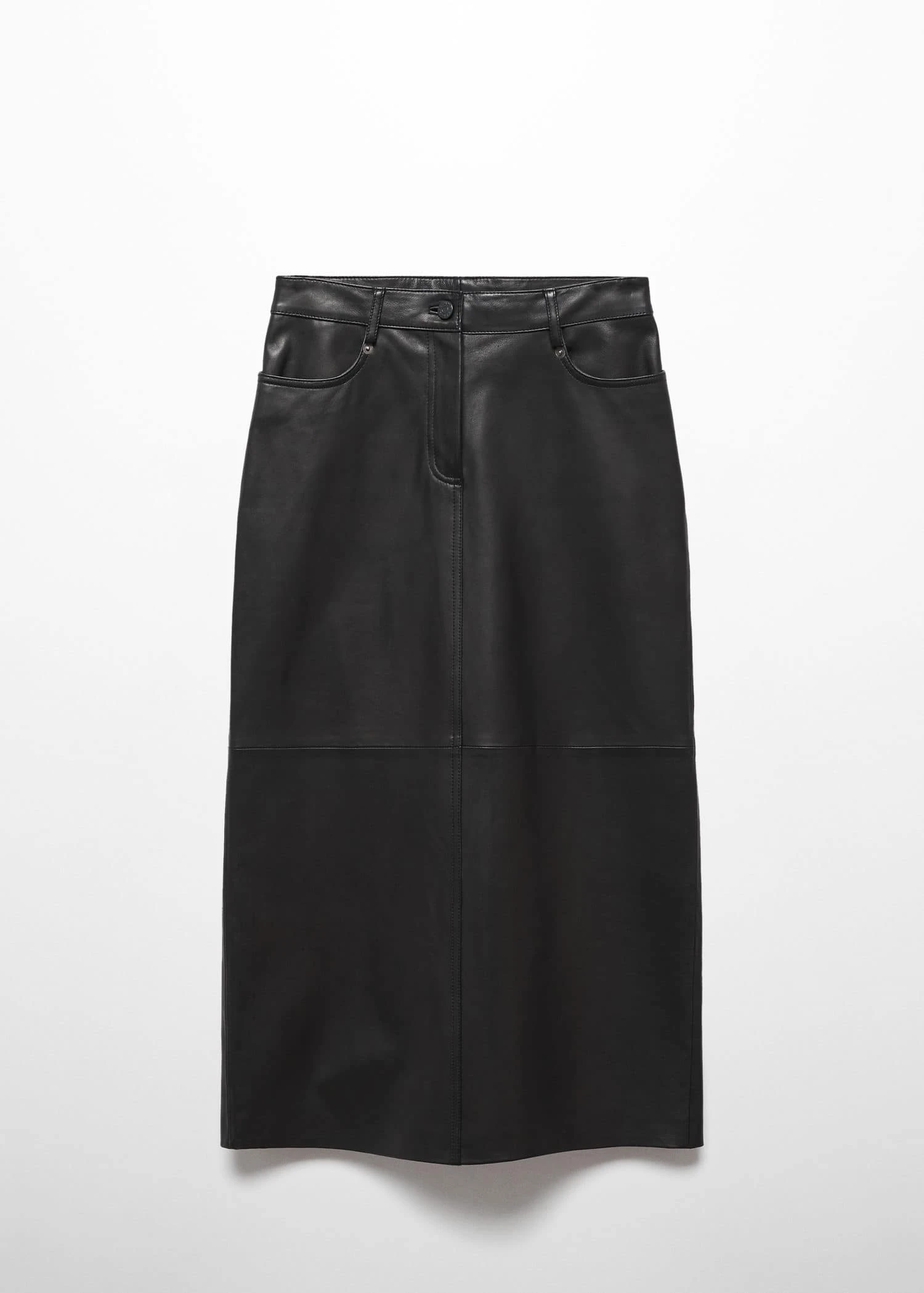 collection selection, 100 % cuir ovin, coupe midi, coupe droite, deux poches laterales, deux poches plaquees a l’arriere, fermeture eclair avec bouton, passants de ceinture , bas fendu a l’arriere, coutures decoratives, doublure, total look, une selection de pieces qui vous accompagneront lors du retour au bureau. confectionnee avec des matieres de qualite pour creer une garde-robe feminine et contemporaine pour votre quotidien.