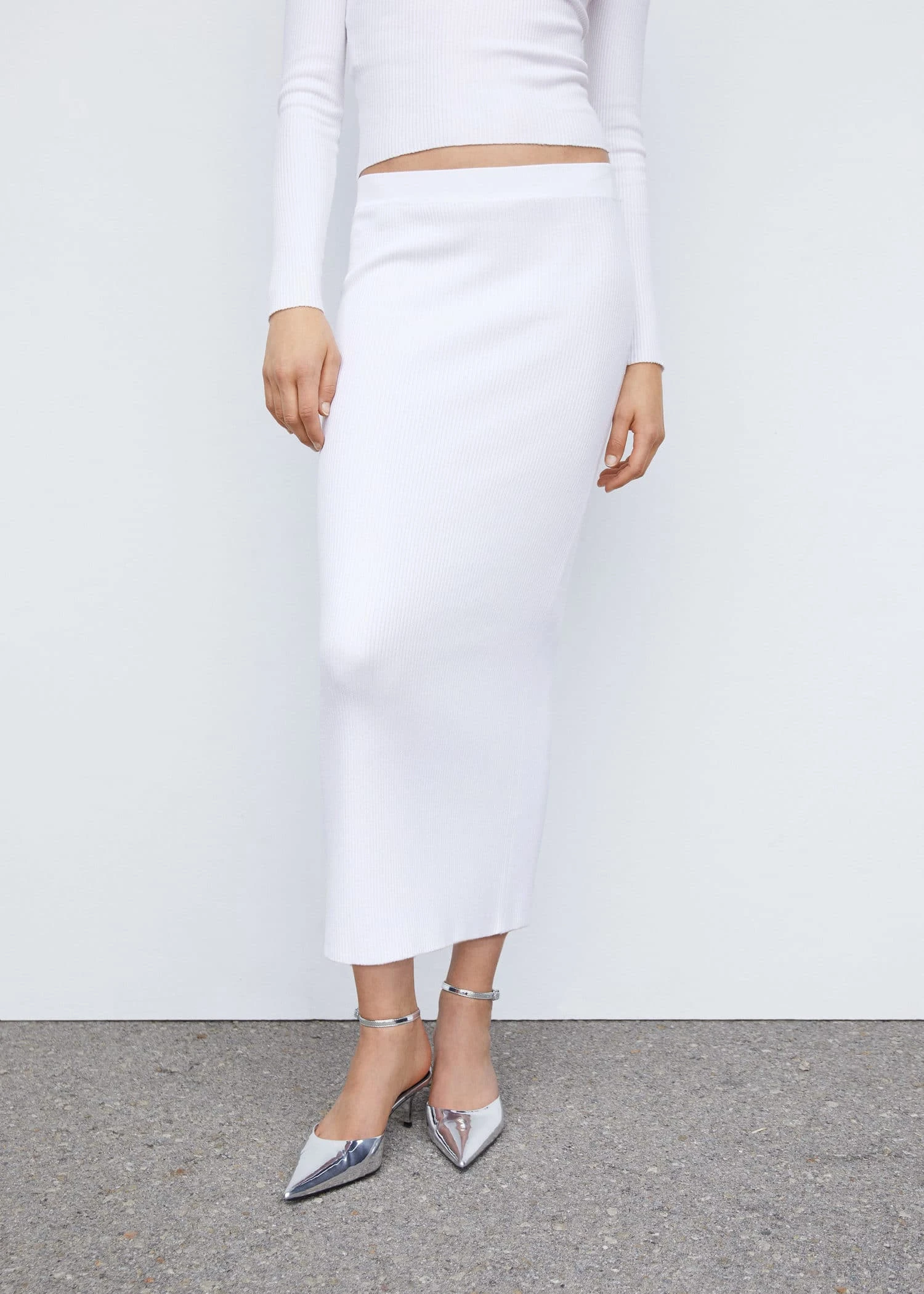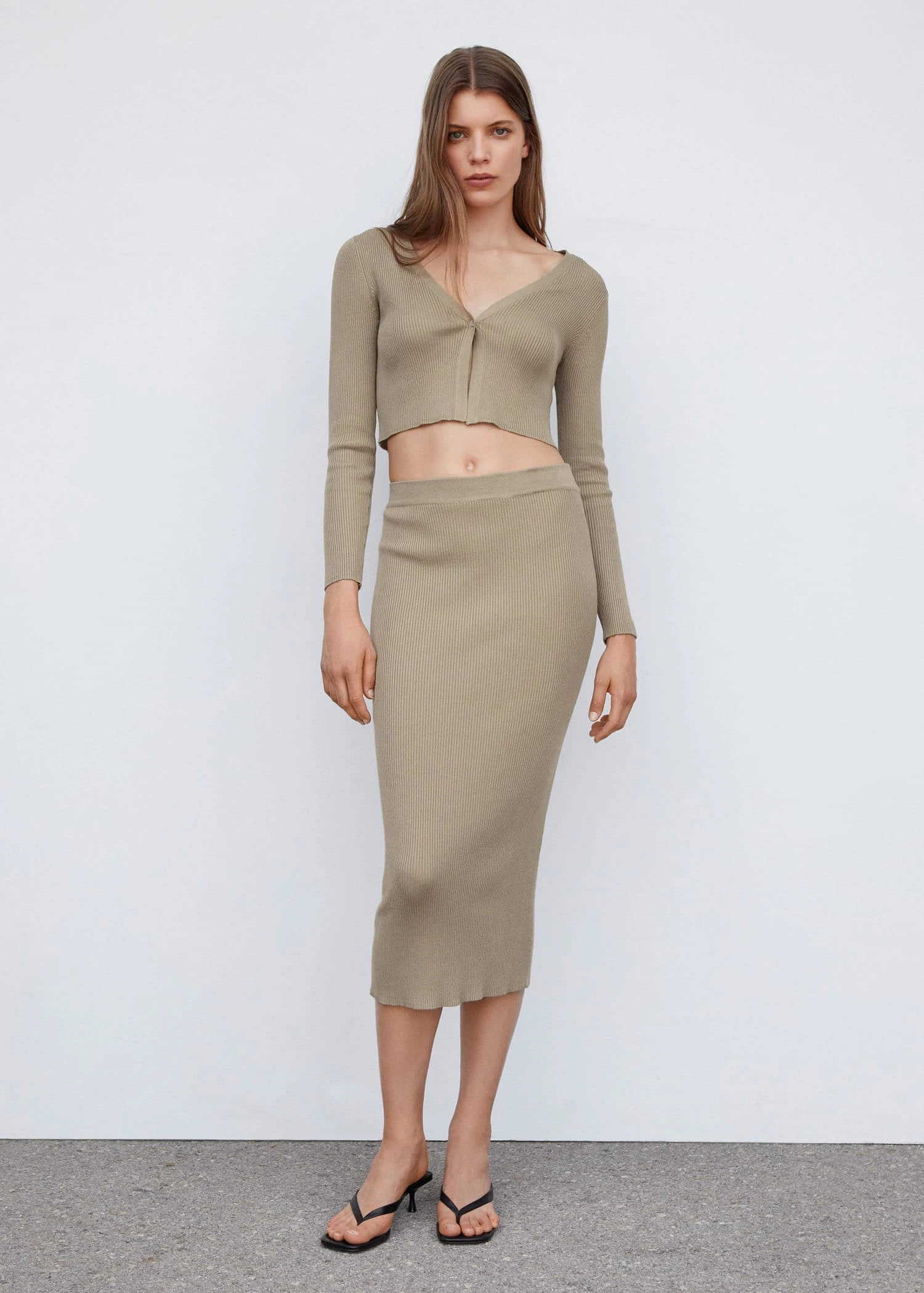 tissu en maille fine, tissu en maille cotelee, crayon, coupe midi, taille normale, taille elastiquee, total lookComposition: 72% viscose,28% polyamide