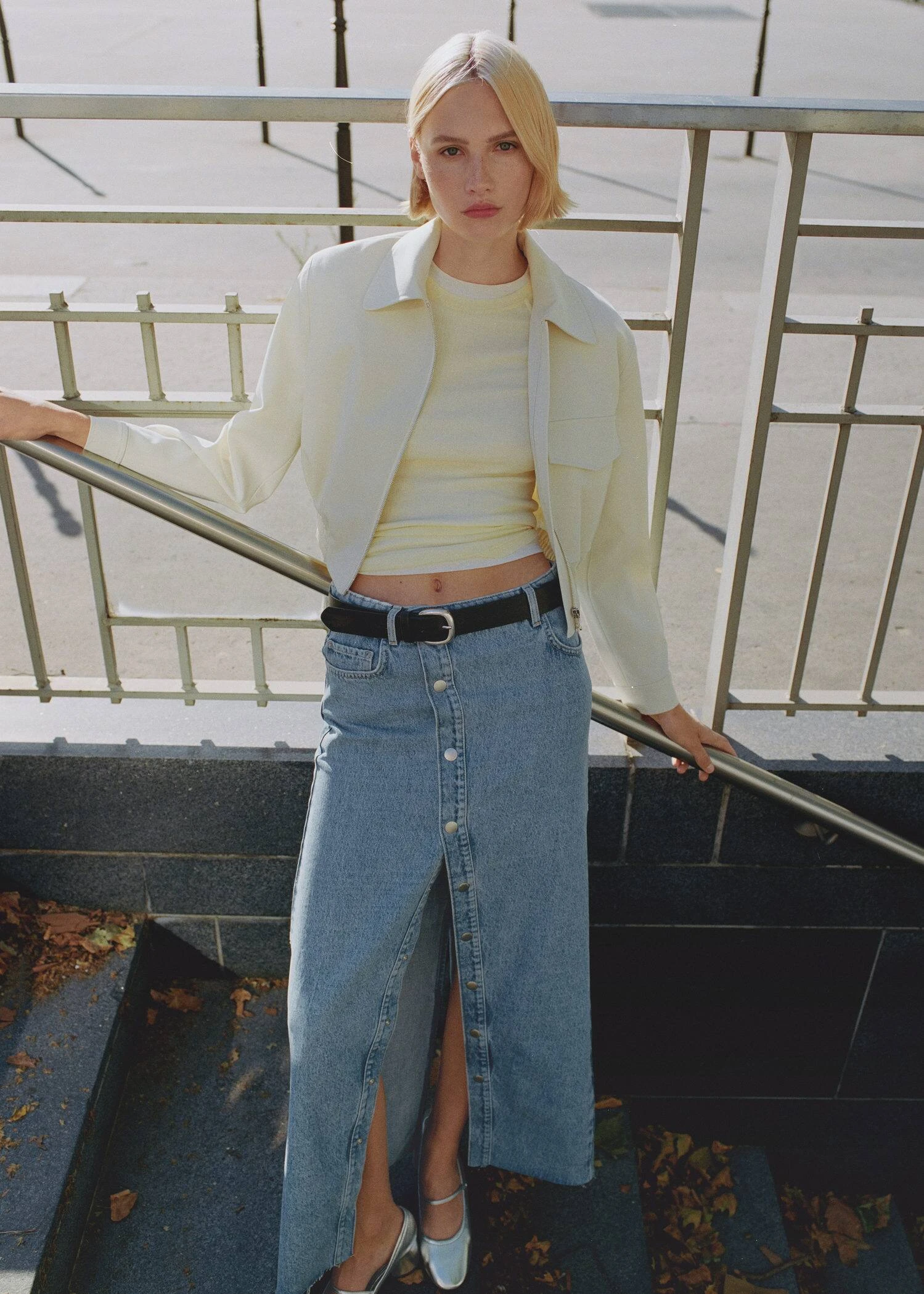 tissu en coton de style jean, coupe asymetrique, droit, coupe longue, taille normale, passants pour la ceinture, cinq poches, fermeture boutonnee sur le devant, bas effilocheComposition: 100% coton