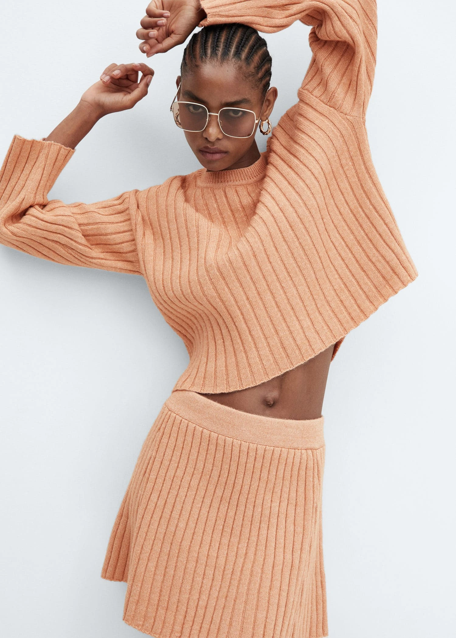 maille moyenne, tissu en maille cotelee, coupe courte, evase, taille elastique, sans fermeture, total lookComposition: 63% acrylique,29% polyester,8% polyamide