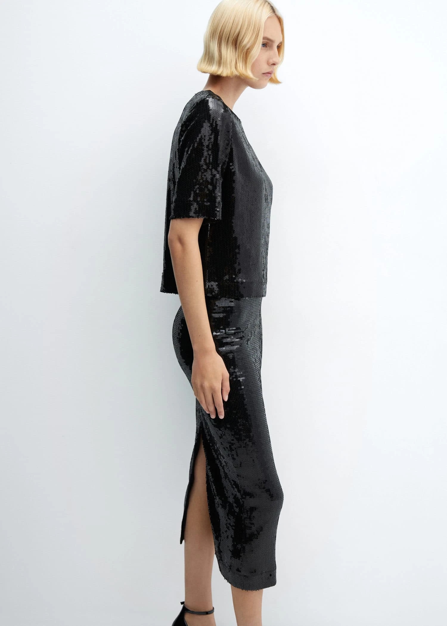 tissu en sequins, coupe midi, ajuste, sans fermeture, taille elastique, doublure, total look, collection fetes et ceremonies.Composition: 93% polyester,7% elasthanne. Doublure: 100% polyester. Sequin: 100% poly(téréphtalate d’éthylène)