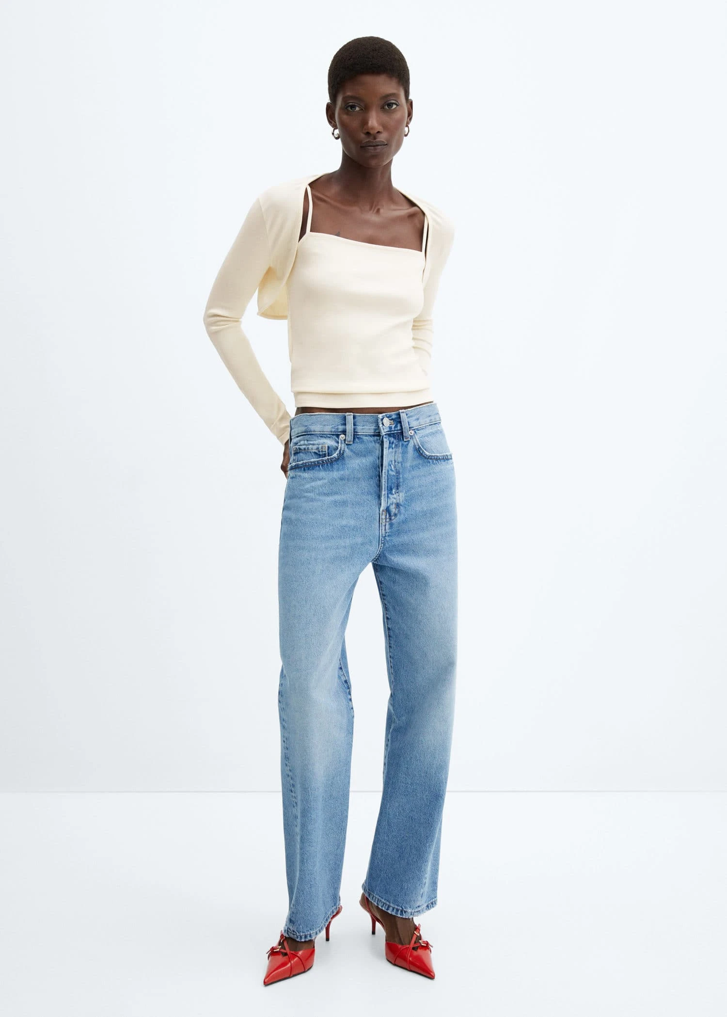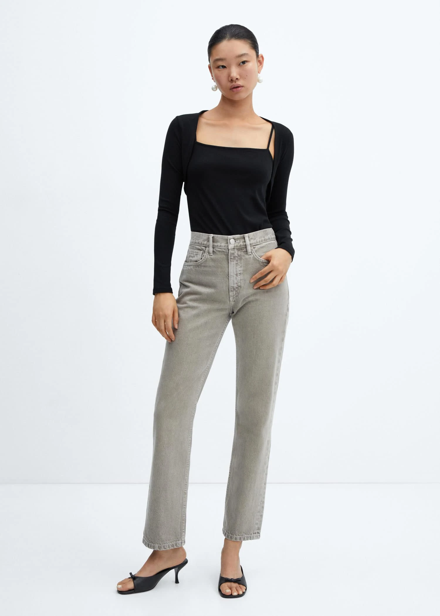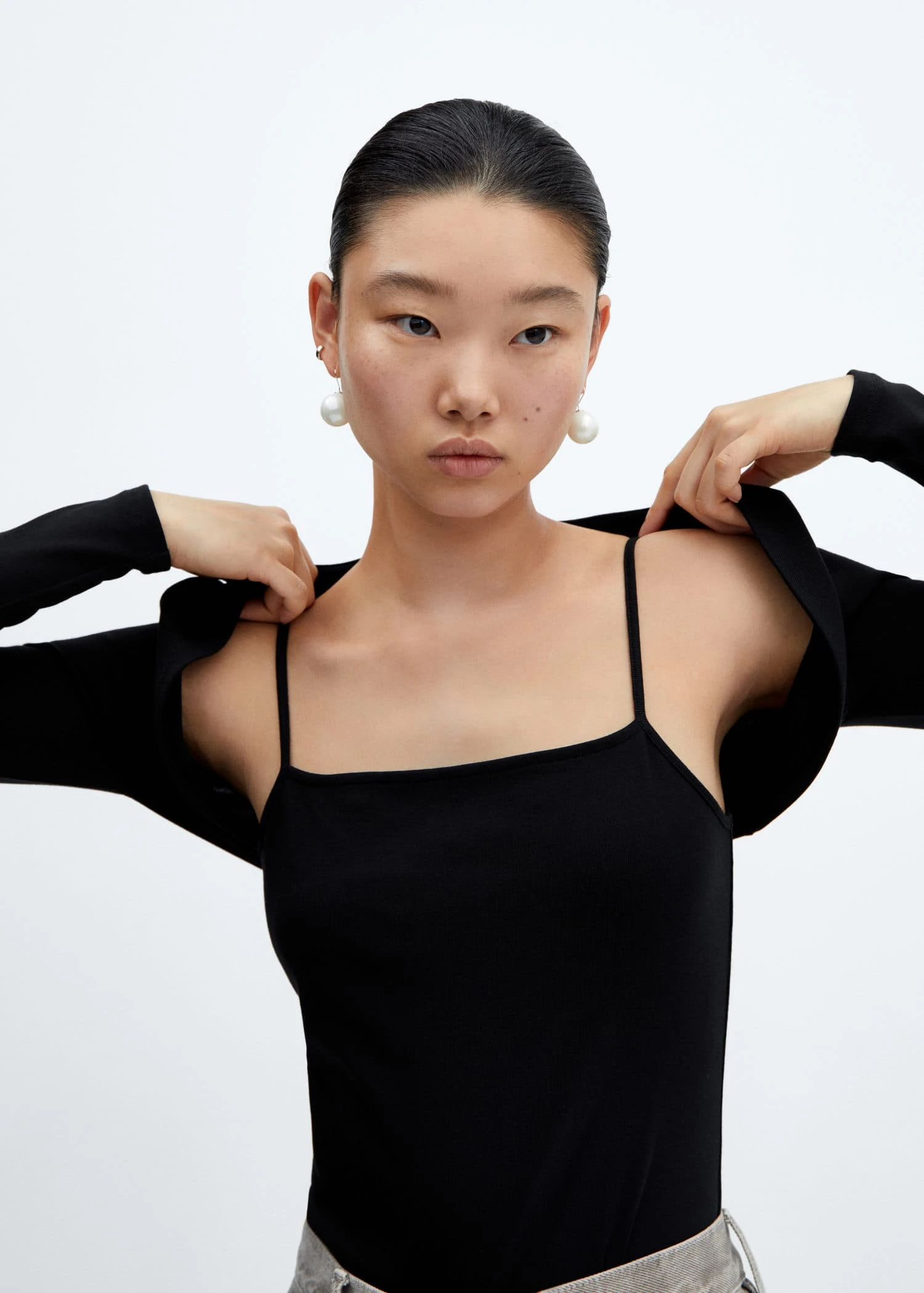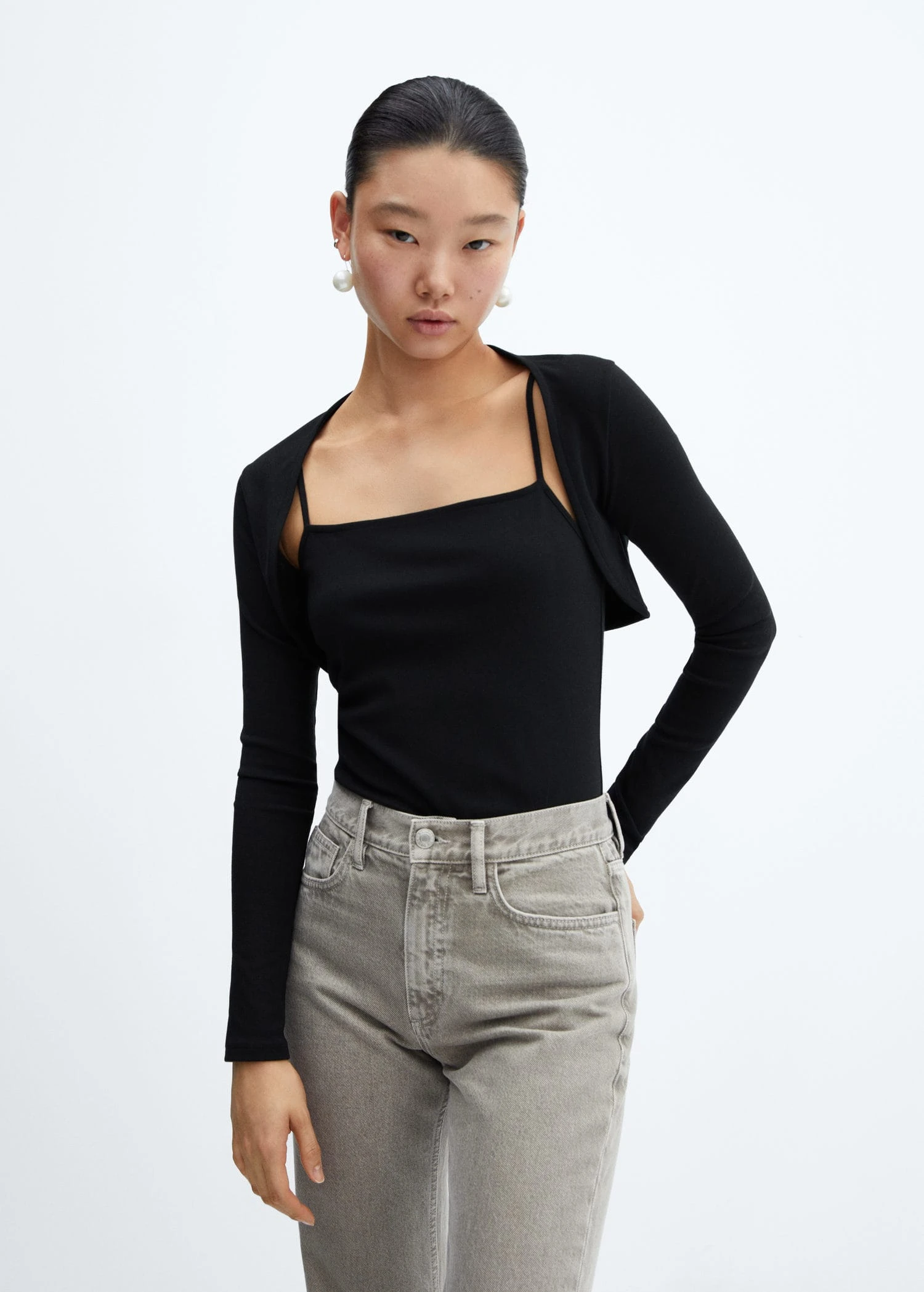 tissu en maille fine, tissu en coton organique recycle melange, ensemble, coupe droite, coupe courte, col carre, bretelles, manches longuesComposition: 46% modal,46% coton,8% elasthanne