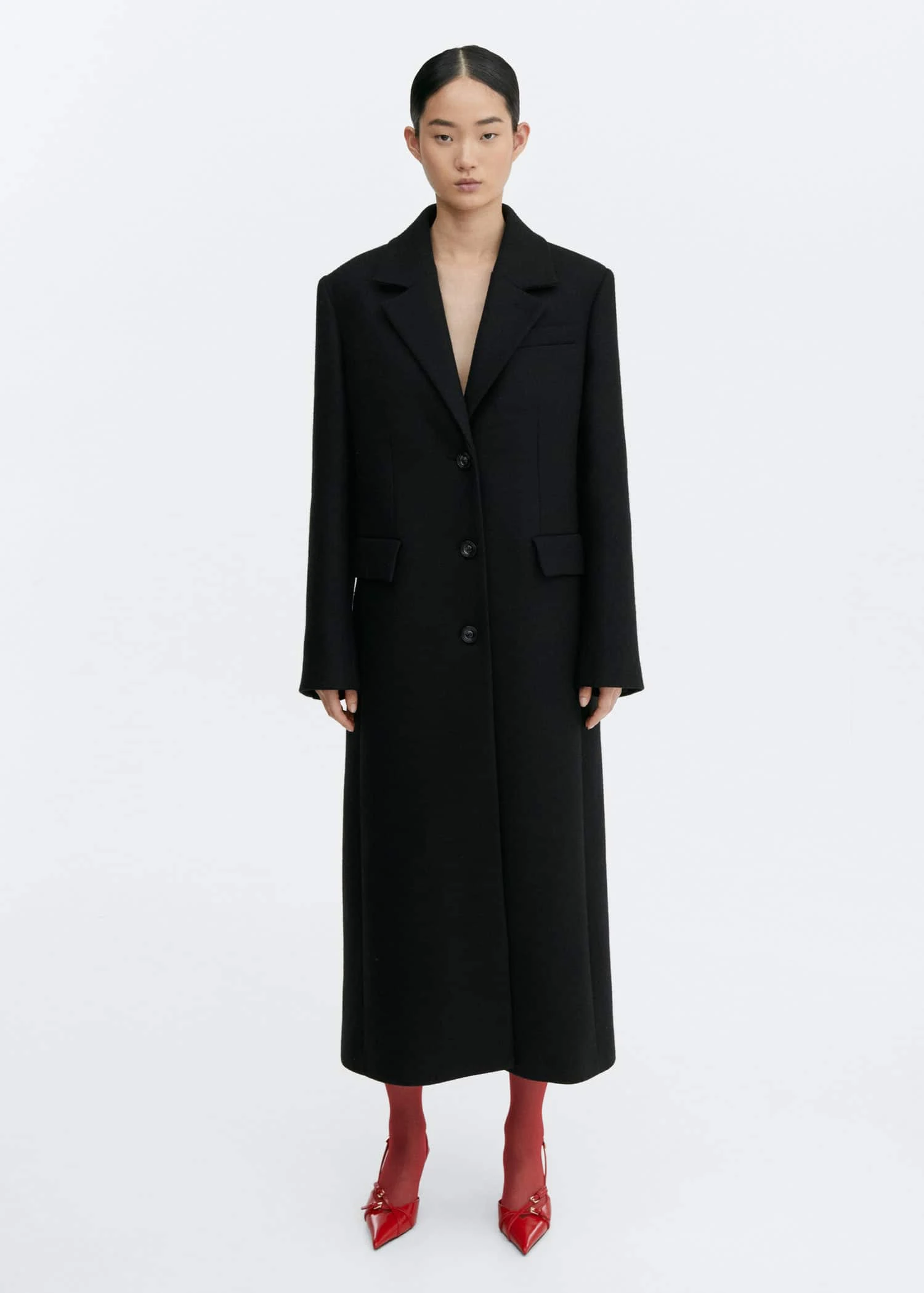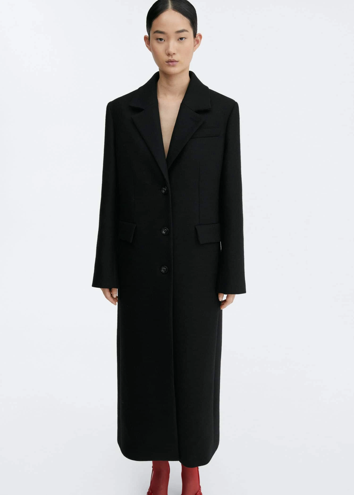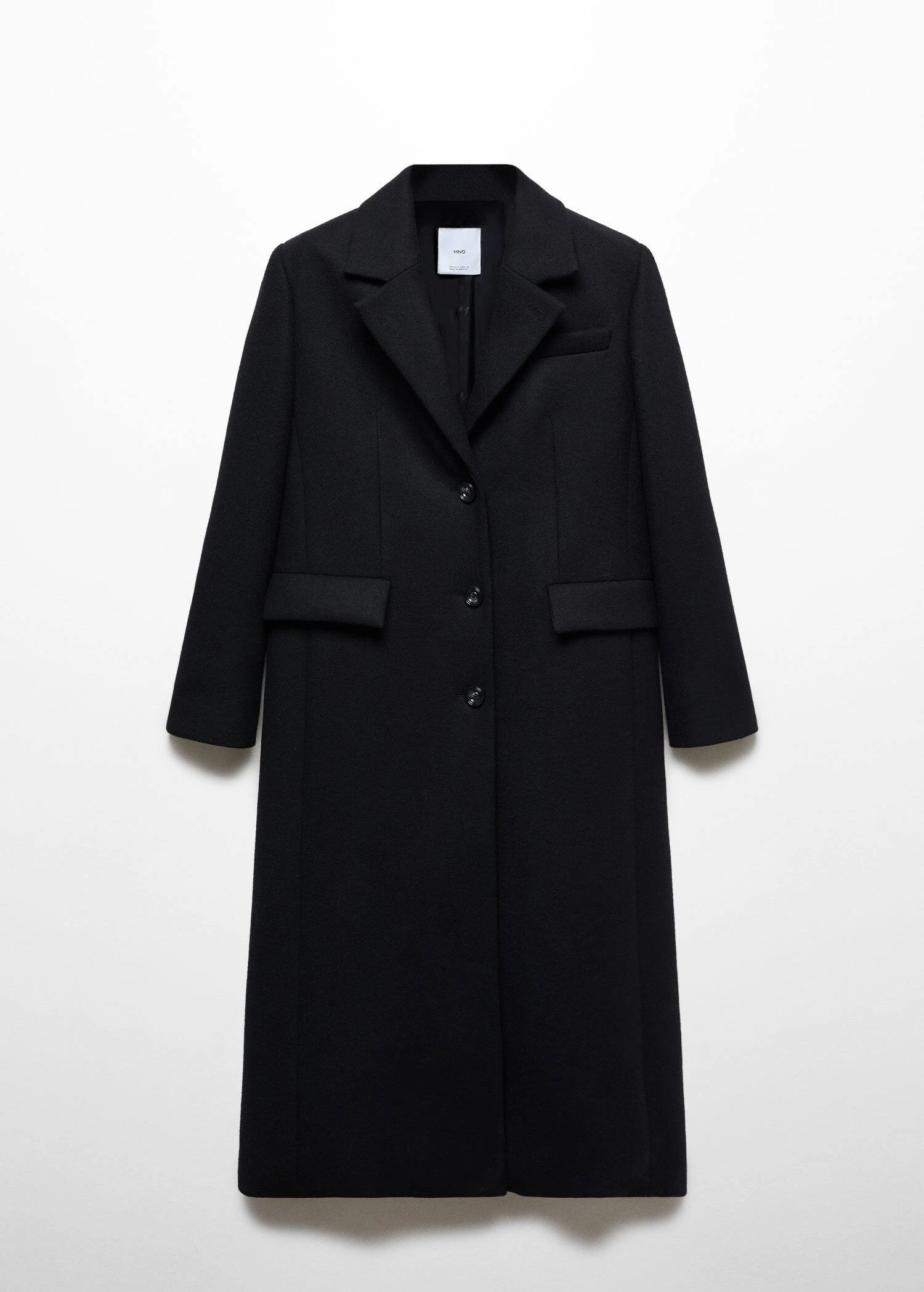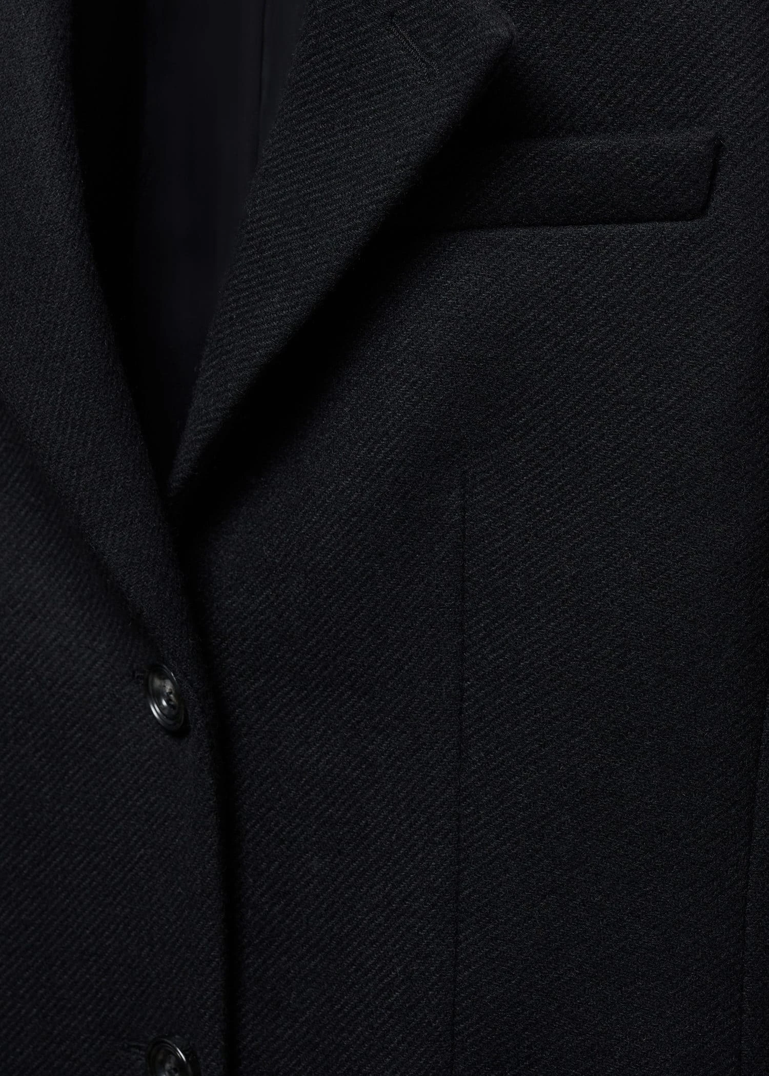tissu de laine melange, coupe droite, structure lourde, coupe longue, col en v avec rabat, revers crantes, manches longues avec poignets boutonnes, fermeture boutonnee sur le devant, deux poches a rabat a l’avant, bas fendu a l’arriere, doublure, collection selection, une selection de pieces qui vous accompagneront lors du retour au bureau. confectionnee avec des matieres de qualite pour creer une garde-robe feminine et contemporaine pour votre quotidien.
