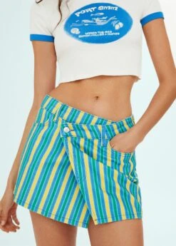 tissu en coton de style jean, asymetrique, coupe droite, coupe courte, motif raye, multicolore, taille normale, passants pour la ceinture, deux poches plaquees sur le devant, fermeture eclair avec bouton, saison des festivals, simonmiller mango : nous nous sommes associes a la marque de los angeles pour vous proposer une collection d’ete rafraichissante qui mele le meilleur des styles californien et mediterraneen. avec des tissus de qualite et des imprimes vibrants, les vetements de cette collaboration speciale debarquent dans votre dressing pour devenir vos favoris de l’ete.Composition: 100% coton