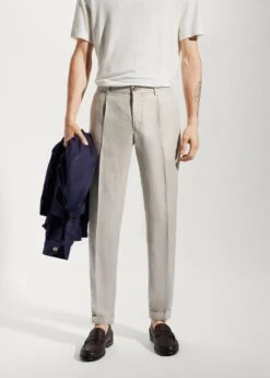 tissu 100 % lin, regular-fit, pinces sur le devant et a l’arriere, double bouton et fermeture eclair, deux poches avant, deux poches passepoilees boutonnees a l’arriere, revers, le mannequin mesure 190 cm et porte une taille 42Composition: 100% lin. Doublure poches: 65% polyester,35% coton