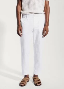 regular-fit, tissu de coton et lin melange, taille elastique, cordon reglable interieur ou exterieur, passants a la taille, double bouton et fermeture eclair, deux poches plaquees sur le devant, poche plaquee avec fermeture a bouton, le mannequin mesure 190 cm et porte une taille 42, ensemble avec veste disponibleComposition: 57% coton,43% lin