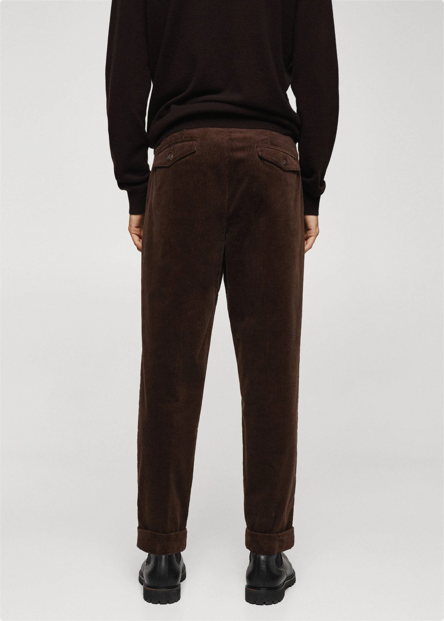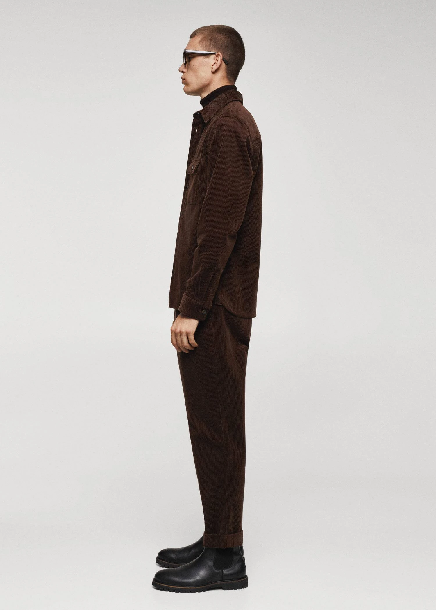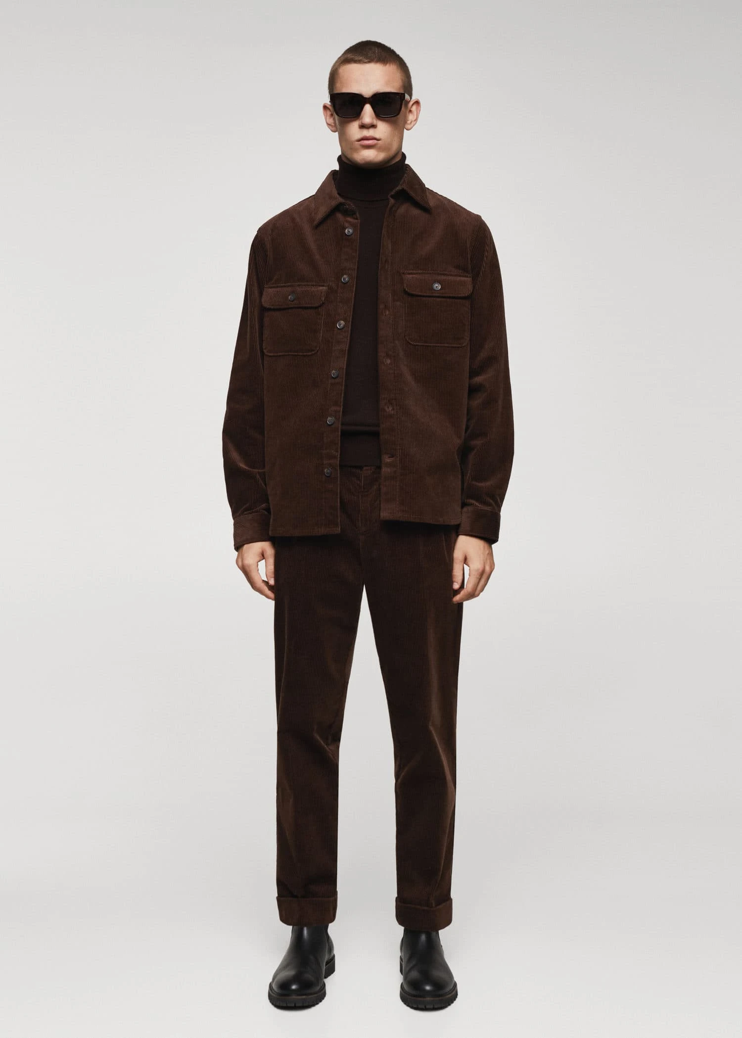 ensemble disponible en total look, regular-fit, tissu en velours cotele, tissu en coton, pinces sur le devant, fermeture eclair avec bouton, passants de ceinture , poche gousset, deux poches avant, deux poches a rabat boutonnees a l’arriere, le mannequin mesure 190 cm et porte une taille 42Composition: 98% coton,2% elasthanne. Doublure poches: 65% polyester,35% coton