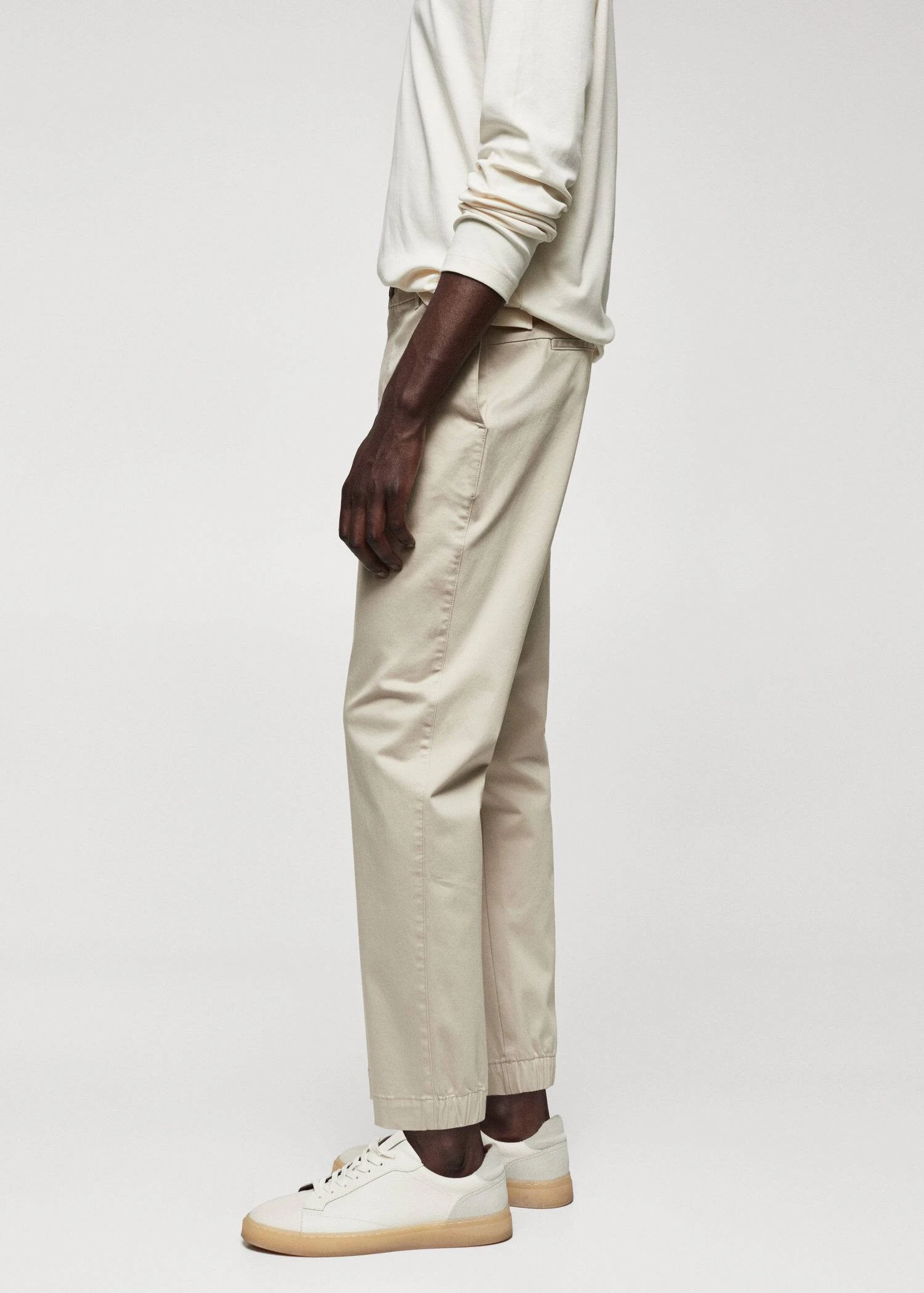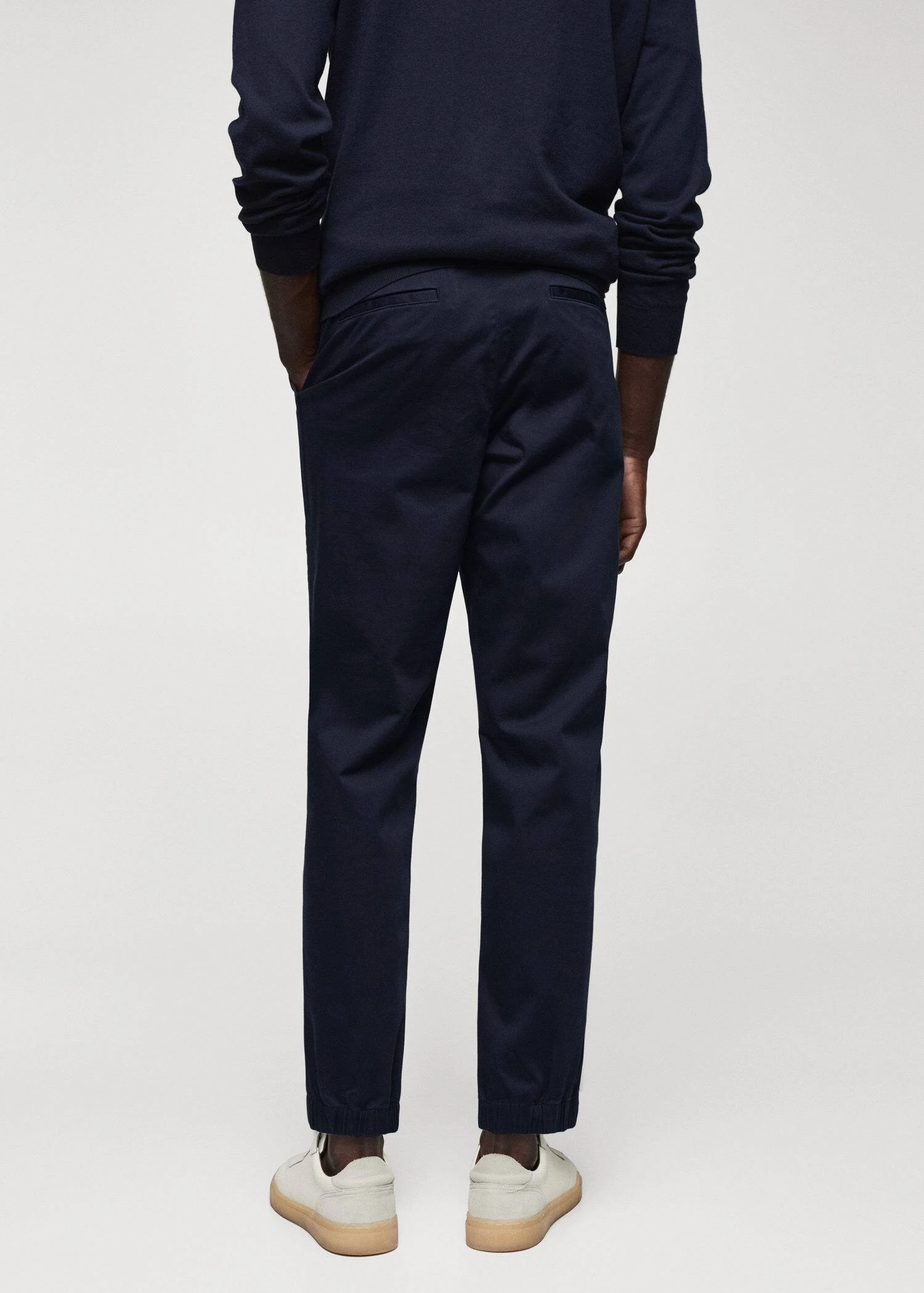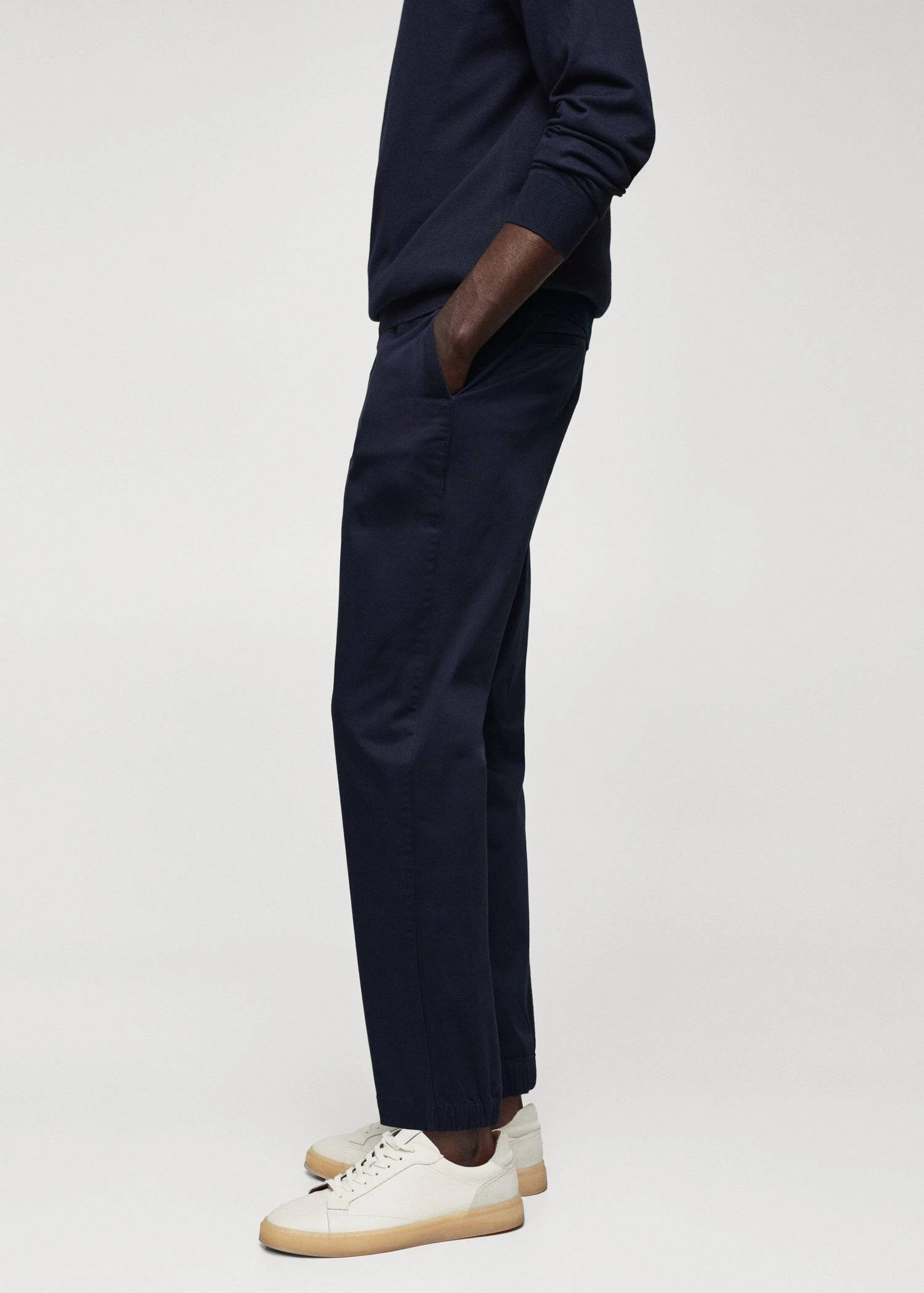 tissu de coton legerement extensible, slim-fit, fermeture eclair avec bouton, cordon interieur de serrage a la taille, taille elastiquee a l’arriere, passants de ceinture , deux poches laterales, bas elastique a l’arriere, le mannequin mesure 190 cm et porte une taille 42Composition: 98% coton,2% elasthanne. Doublure poches: 65% polyester,35% coton