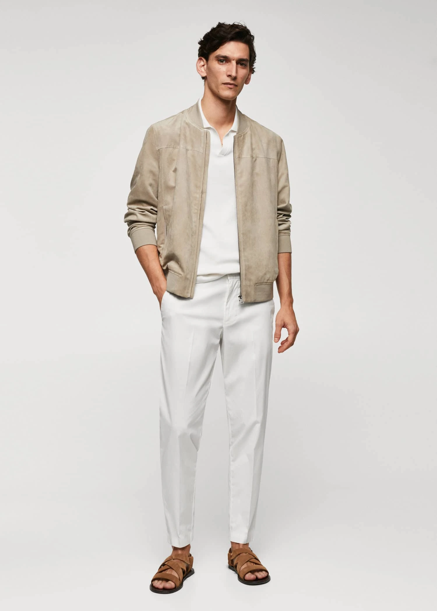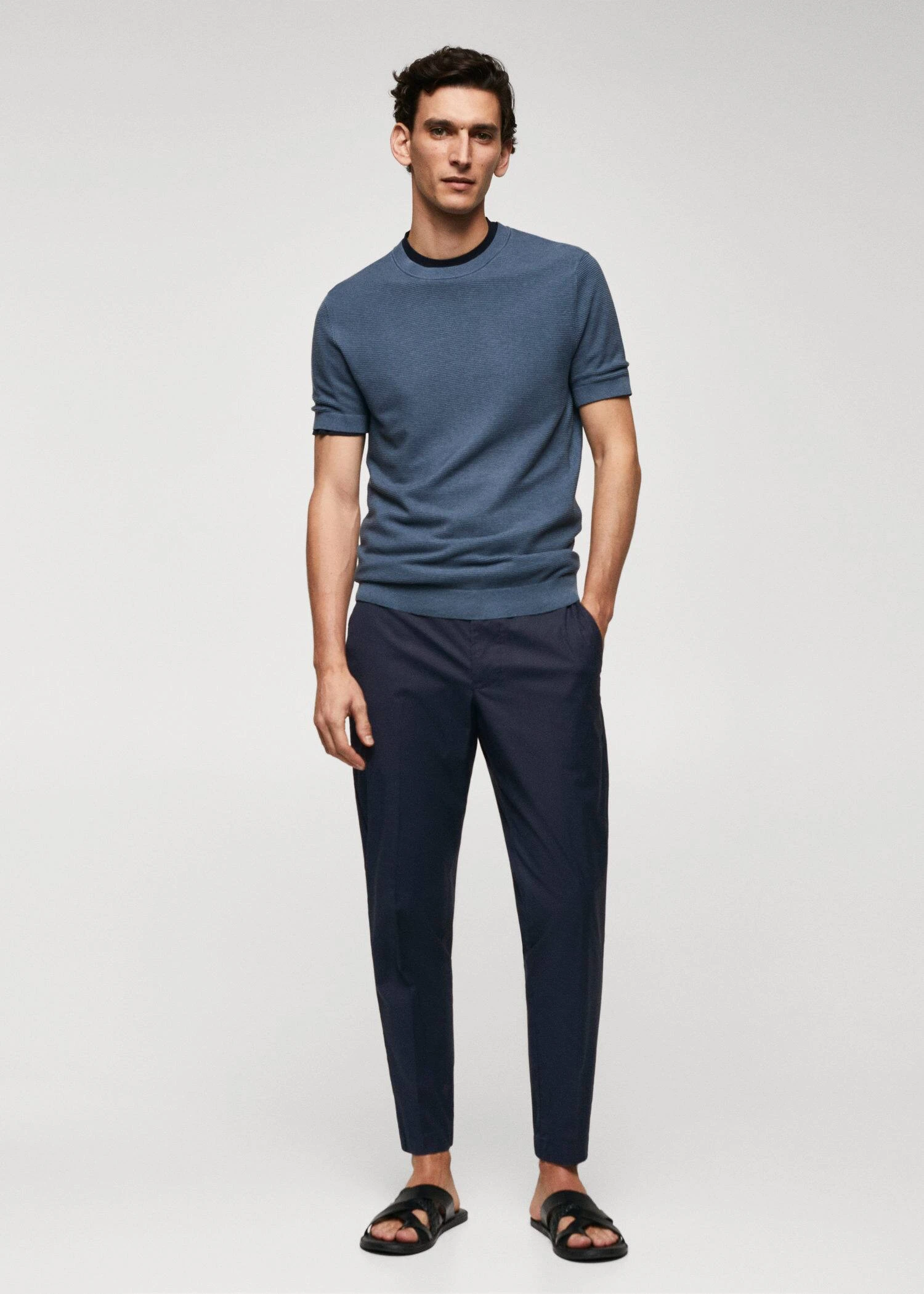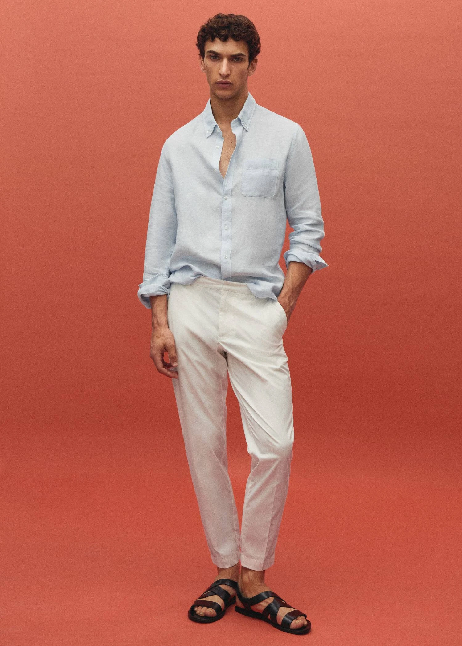 tissu en coton, slim-fit, coupe standard, fermeture eclair avec crochet et bouton dissimules, passants de ceinture , pinces sur le devant et a l’arriere, deux poches avant, deux poches passepoilees a l’arriere, bas elastique a l’arriere, le mannequin mesure 190 cm et porte une taille 42Composition: 96% coton,4% elasthanne. Doublure poches: 100% coton