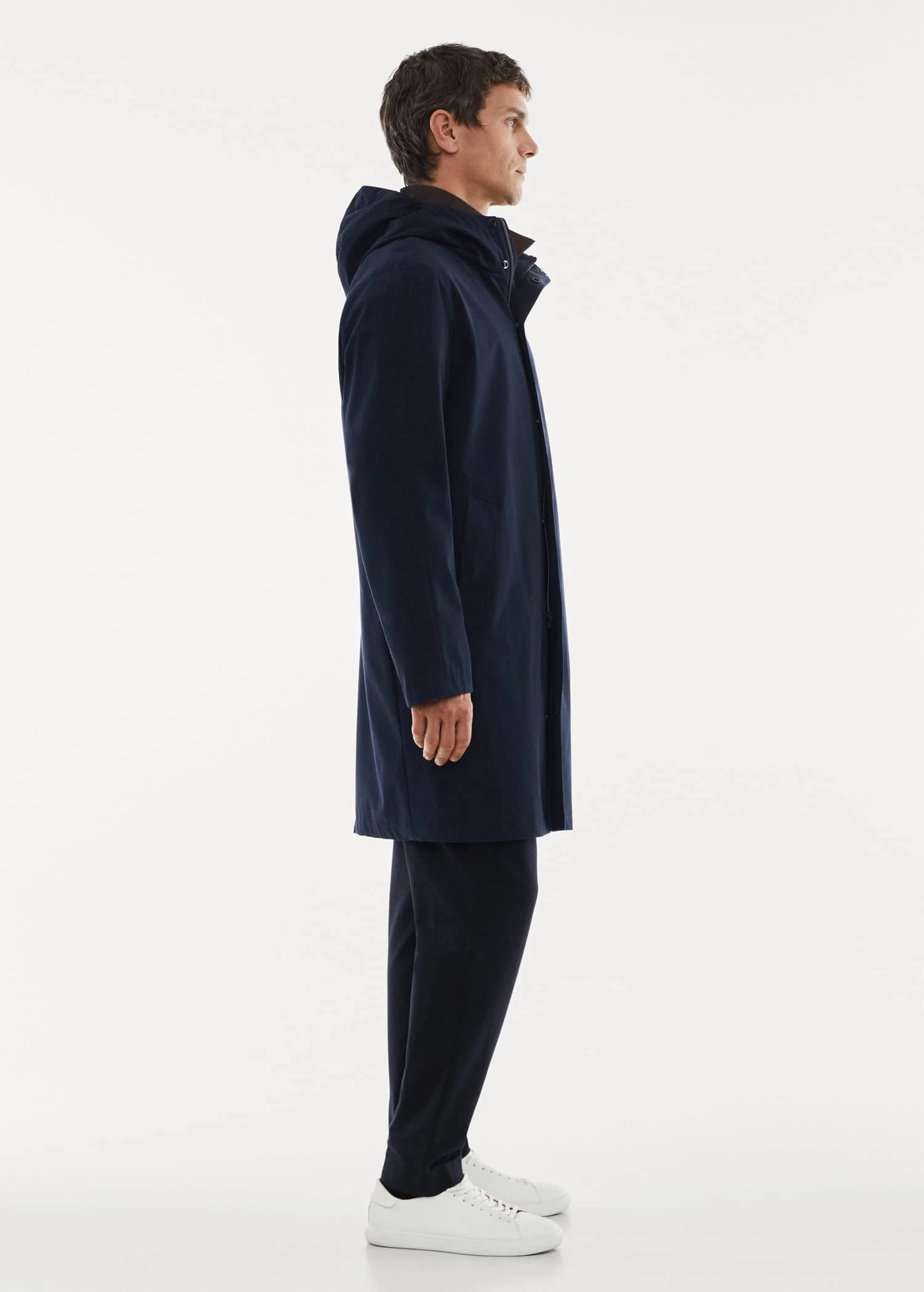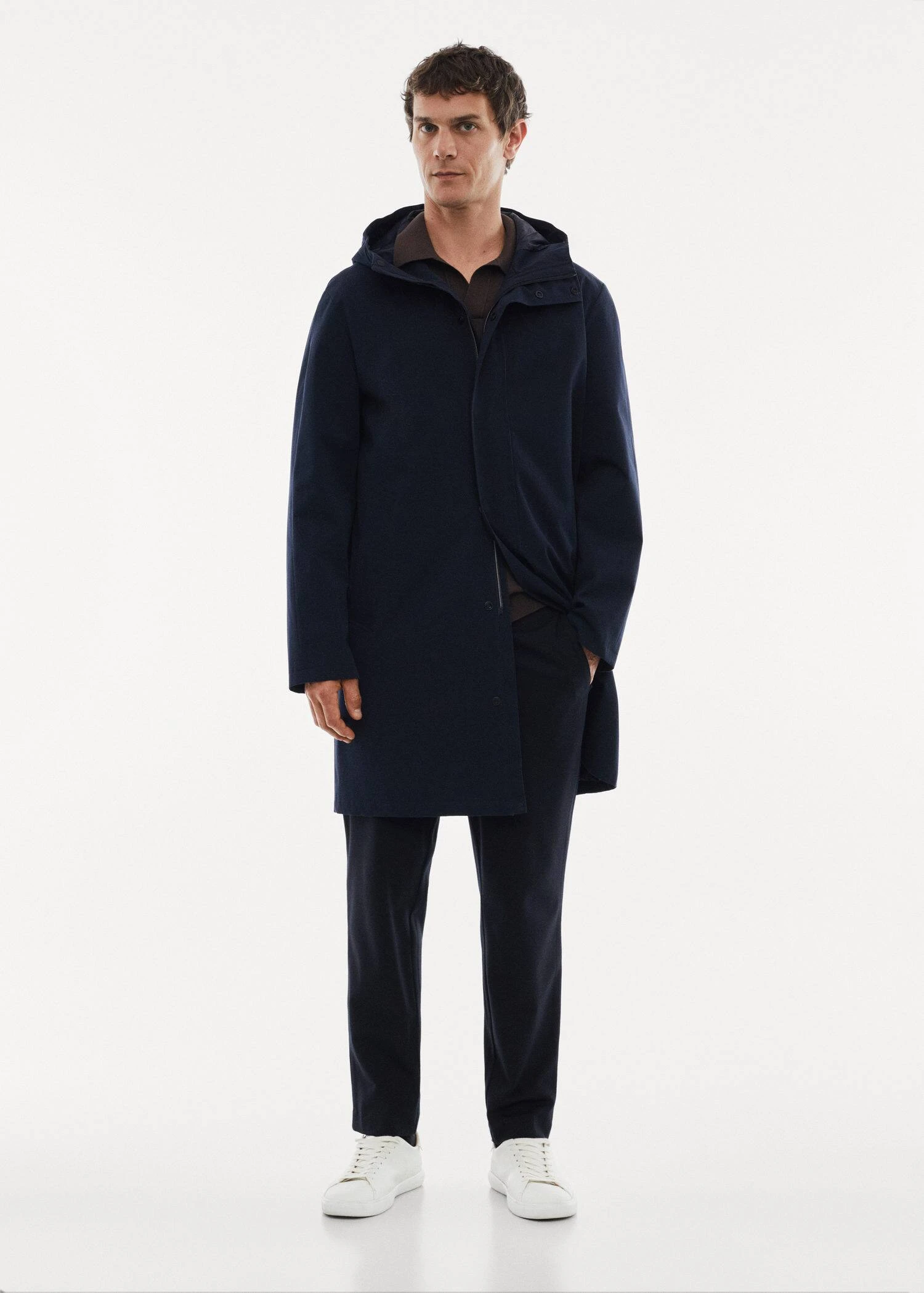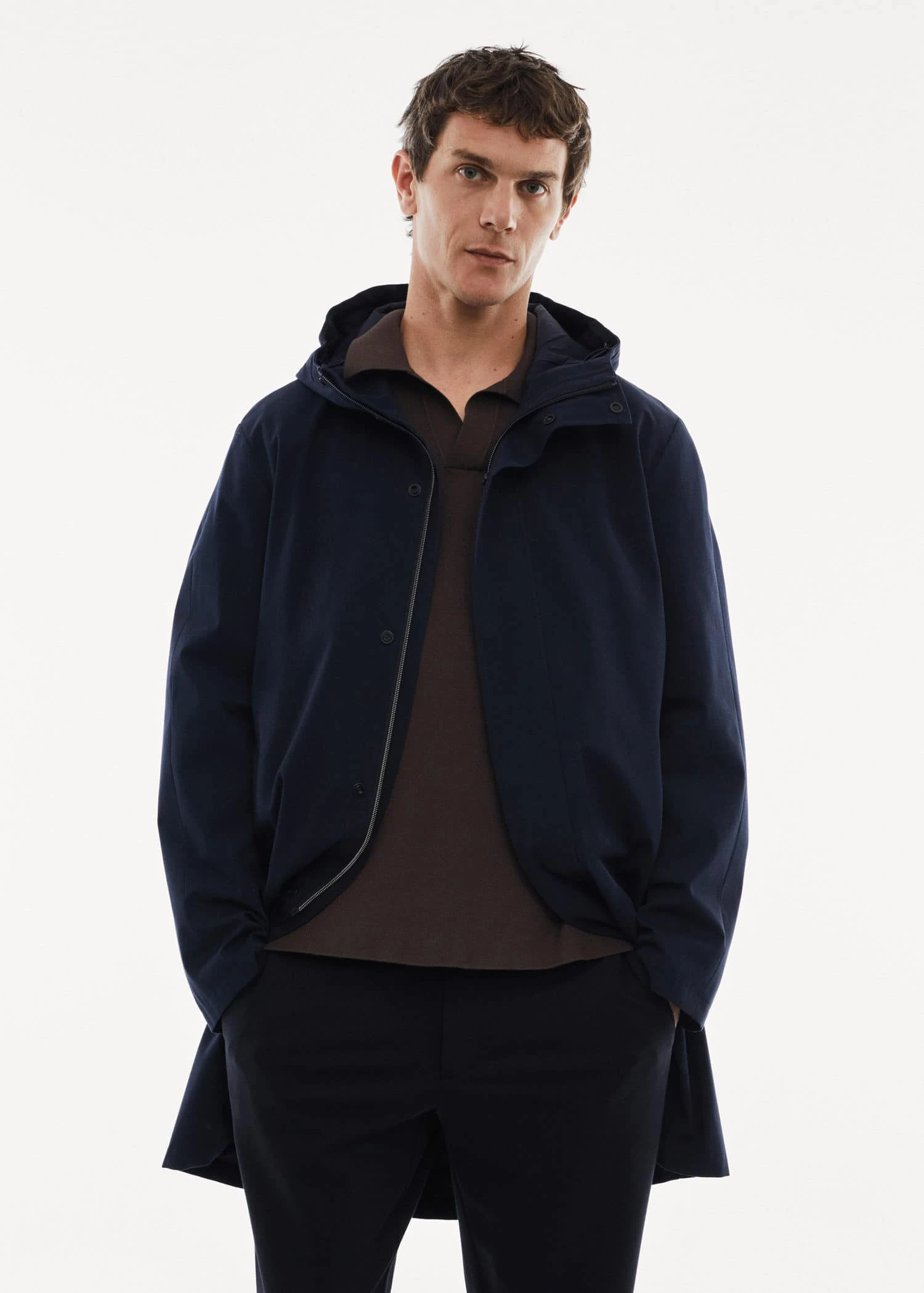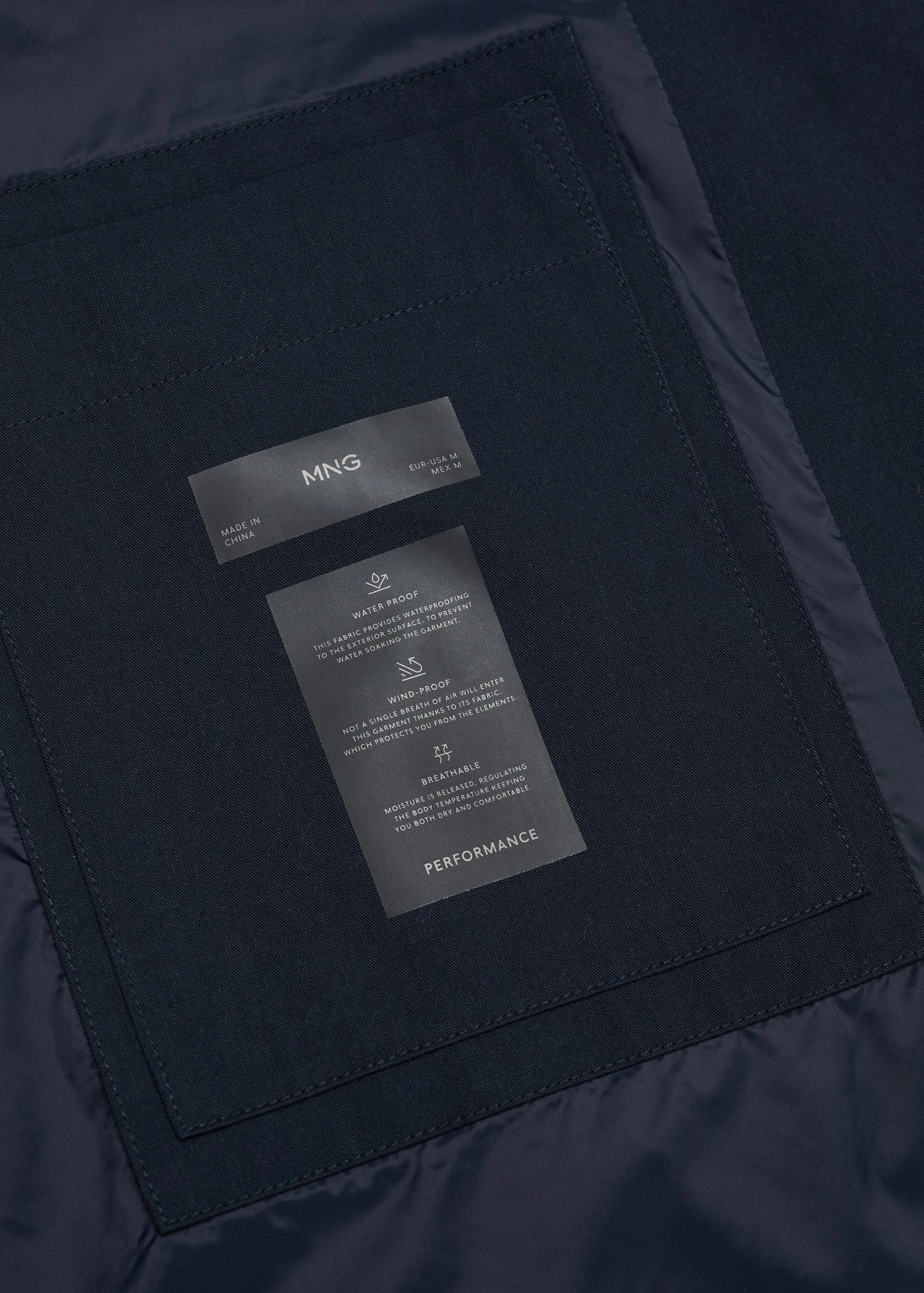 windproof : tissu coupe-vent, waterproof : tissu technique impermeable, respirant : tissu qui evapore l’humidite et vous garde au sec, fermeture eclair et boutons-pression a l’avant, capuche avec cordon de serrage, manches longues, ouverture en bas avec fermeture a boutons, poche interieure, le mannequin mesure 190 cm et porte une taille m, la couleur bleue est une exclusivite en ligne, « la selection performance propose des vetements fabriques a partir de fibres techniques qui vous permettront de rester impeccable et a l’aise toute la journee, quoi que vous fassiez et ou que vous alliez. cette selection haute performance presente une vaste gamme de caracteristiques avancees telles que des tissus bi-stretch, a sechage rapide, faciles a repasser, thermoregulateurs, respirants ou resistants a l’eau, organises en quatre categories generales : thermoregulateur, fonctionnel, facile d’entretien et confortable. « Composition: 65% polyester recyclé,35% coton. Doublure: 100% polyamide