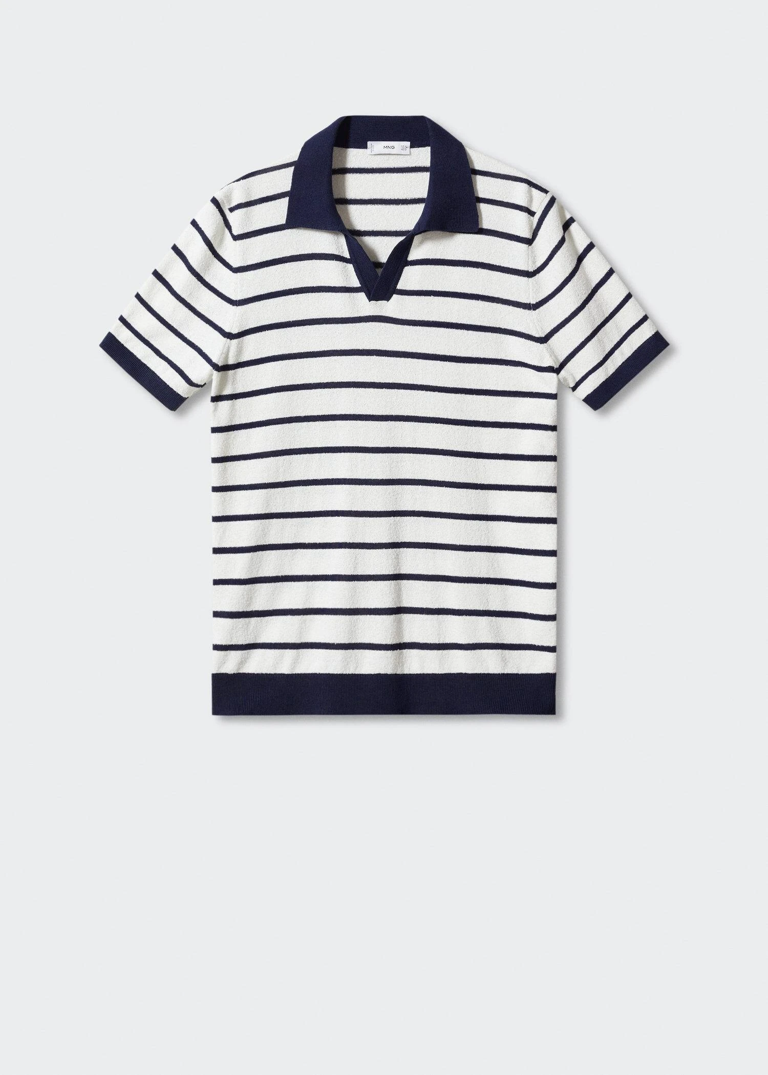 fabrique en tissu de coton melange, effet gratte avec structure bouclette, coupe droite, regular-fit, imprime a rayures horizontales, col polo en v sans fermeture, manches courtes, bas droit, bords coteles contrastes au niveau du col, des manches et sur le bas, le mannequin mesure 190 cm et porte une taille mComposition: 73% coton,27% polyamide