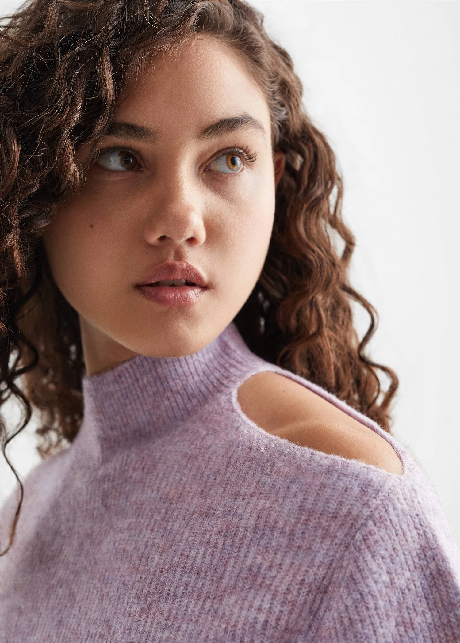tissu en maille, maille moyenne, coupe droite, ouvertures sur l’epaule, col montant, manches longues, sans fermetureComposition: 54% polyester,38% acrylique,5% laine,3% elasthanne