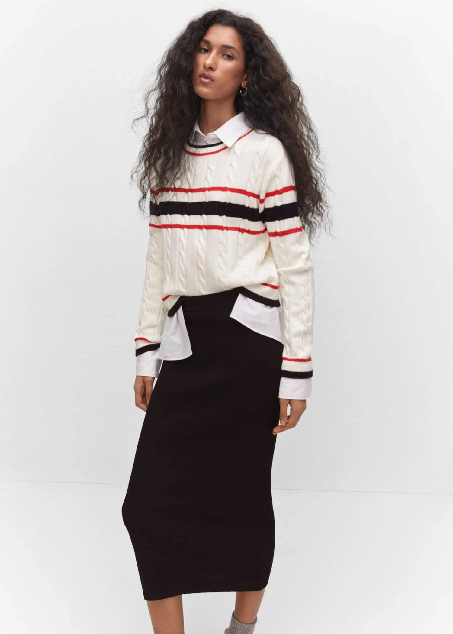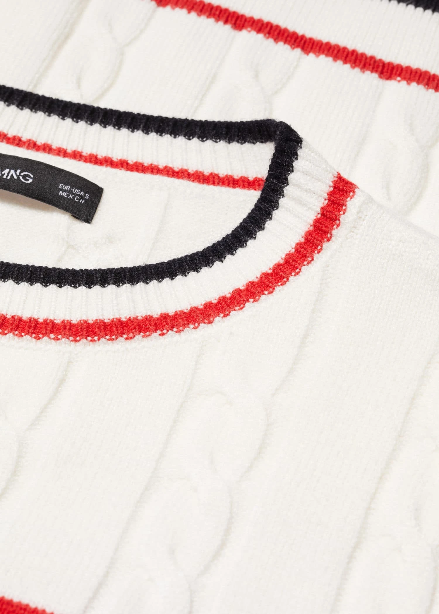 tissu en grosse maille, tissu maille torsadee, coupe droite, motif raye, col rond, manches longuesComposition: 50% viscose,28% polyester,22% polyamide