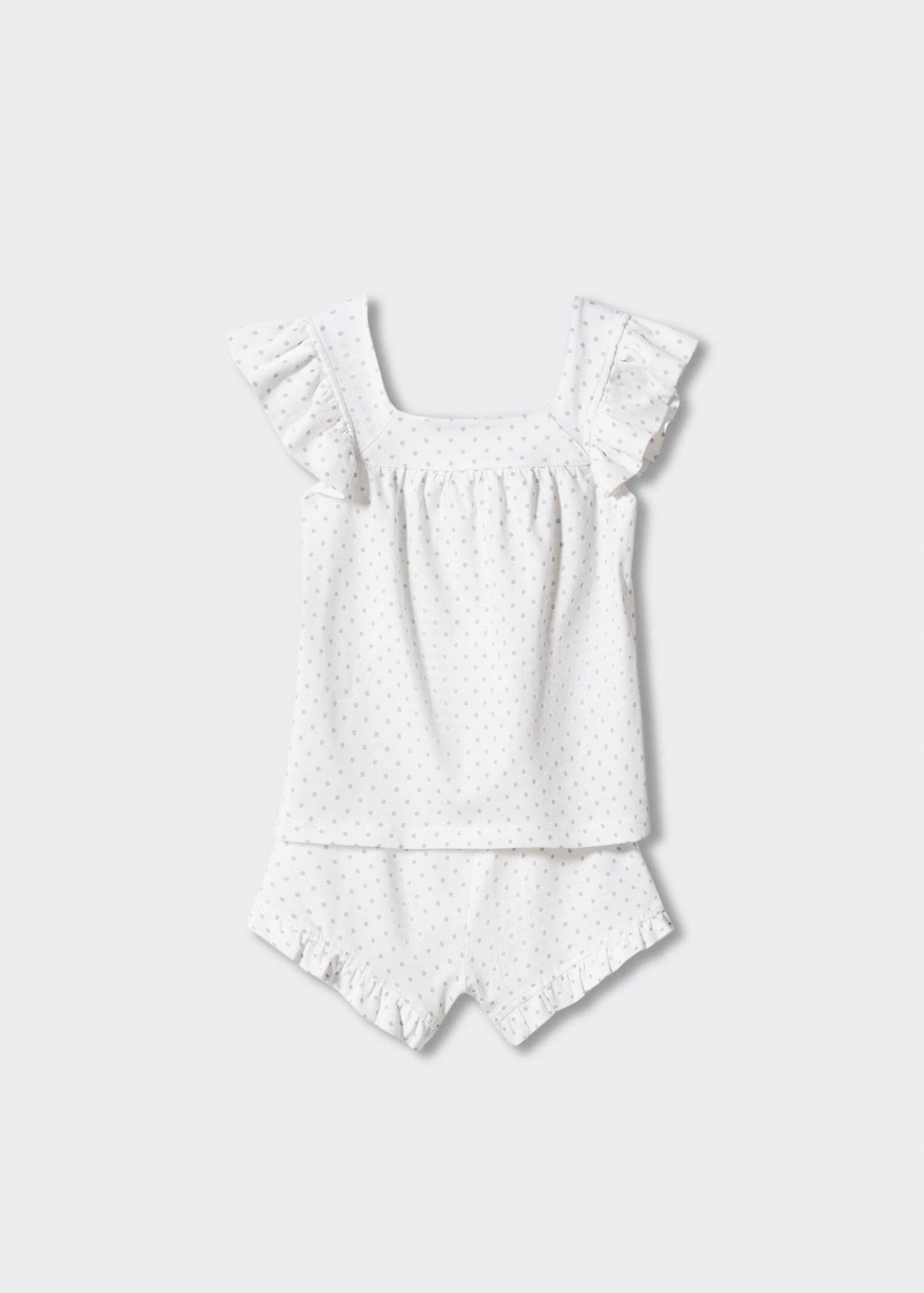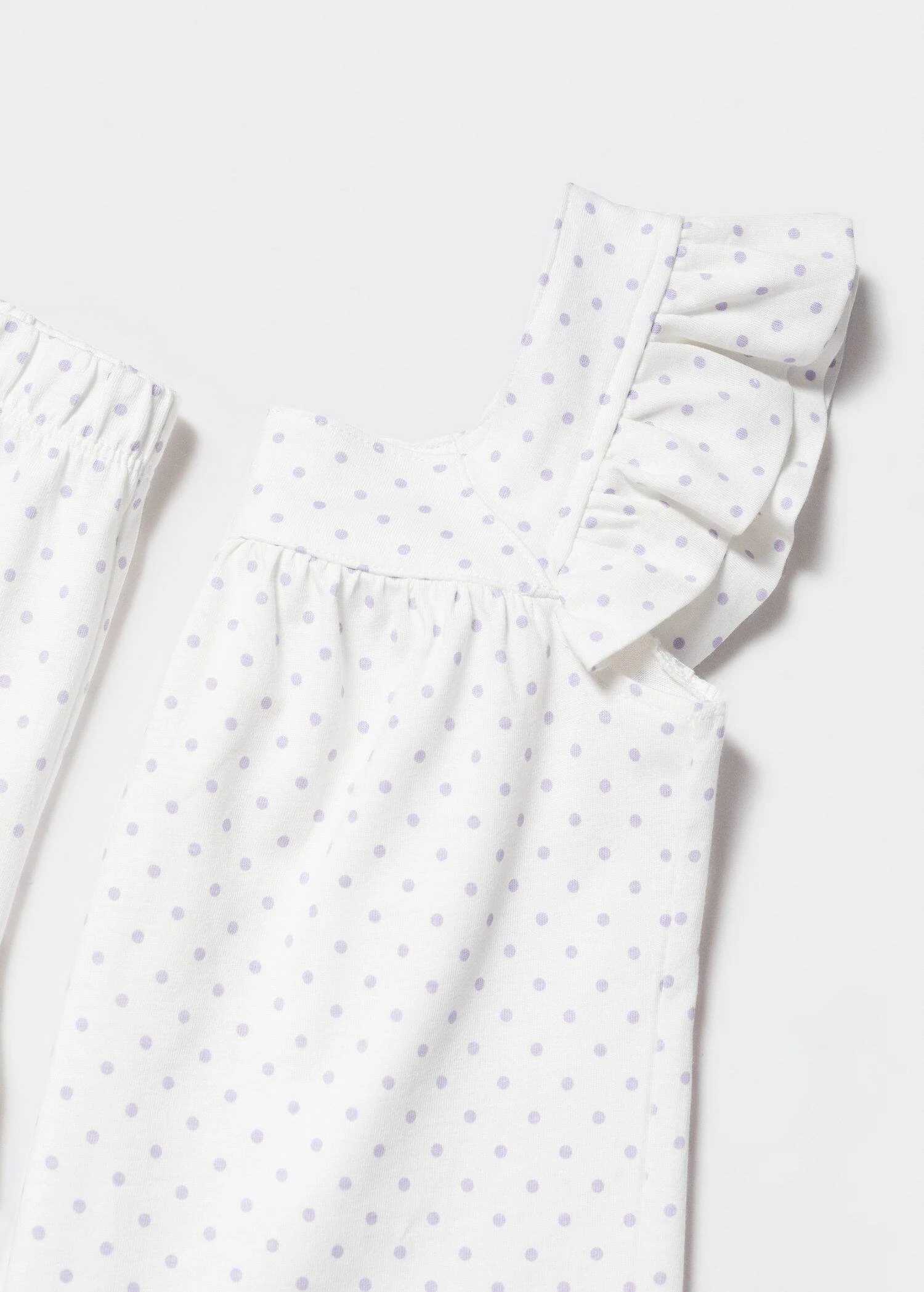 pack t-shirt et pantalon de pyjama, 100 % coton, imprime a pois, coupe courte, bretelles larges, bretelles a volant, base volantee, col carre, sans manches, avec ce vetement en coton, vous soutenez notre investissement dans la mission de better cotton. ce tissu est un equilibre de masse qui remplace ou melange du coton better cotton avec du coton conventionnel, aussi il est possible qu’il ne contienne pas de better cotton. les agriculteurs partenaires beneficient d’un soutien et d’une formation continus.COMPOSITION:100% COTON. PANTALON:100% COTON