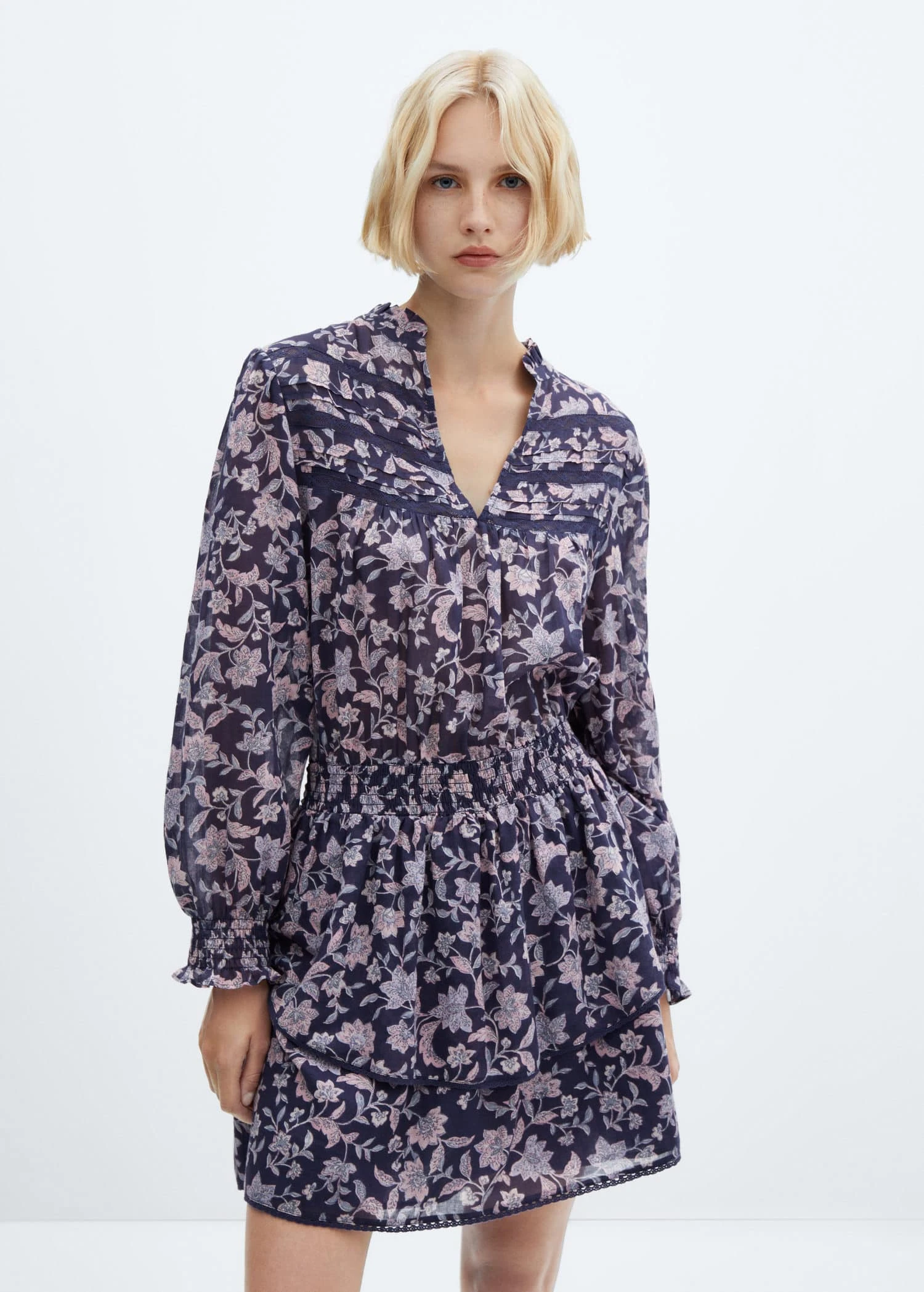 tissu 100 % coton, droit, coupe courte, imprime floral, col en v, manches longues bouffantes, poignets elastiques, fronce elastique a la taille, sans fermetureComposition: 100% coton. Doublure: 100% coton. Dentelle: 100% coton