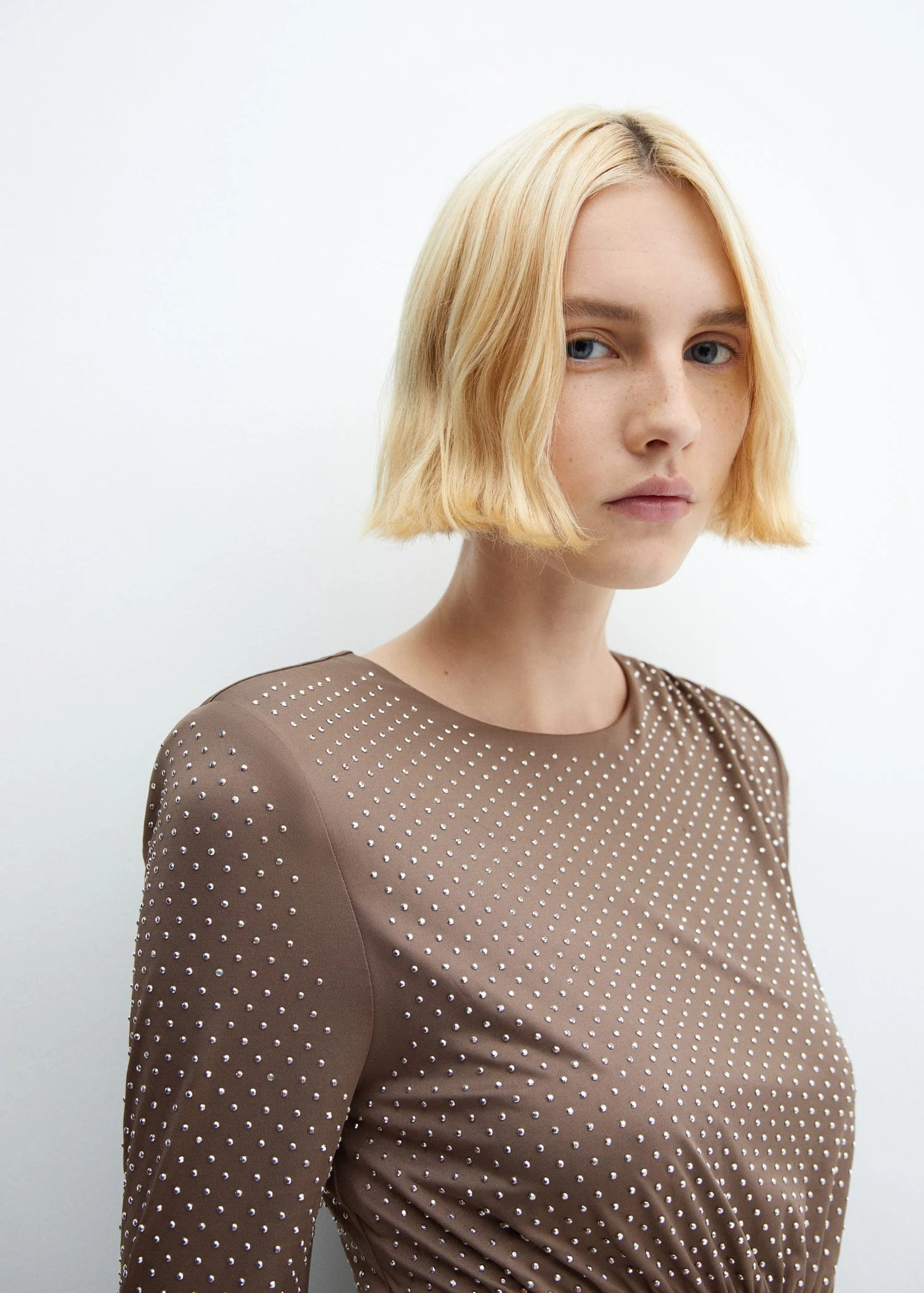 tissu fluide, tissu elastique, coupe courte, coupe cintree, col rond, manches longues, fermeture eclair a l’arriere, detail en strass, fronces laterales , doublure, collection fetes et ceremonies.Composition: 95% polyester,5% elasthanne. Doublure: 95% polyester,5% elasthanne. Sequin: 100% verre