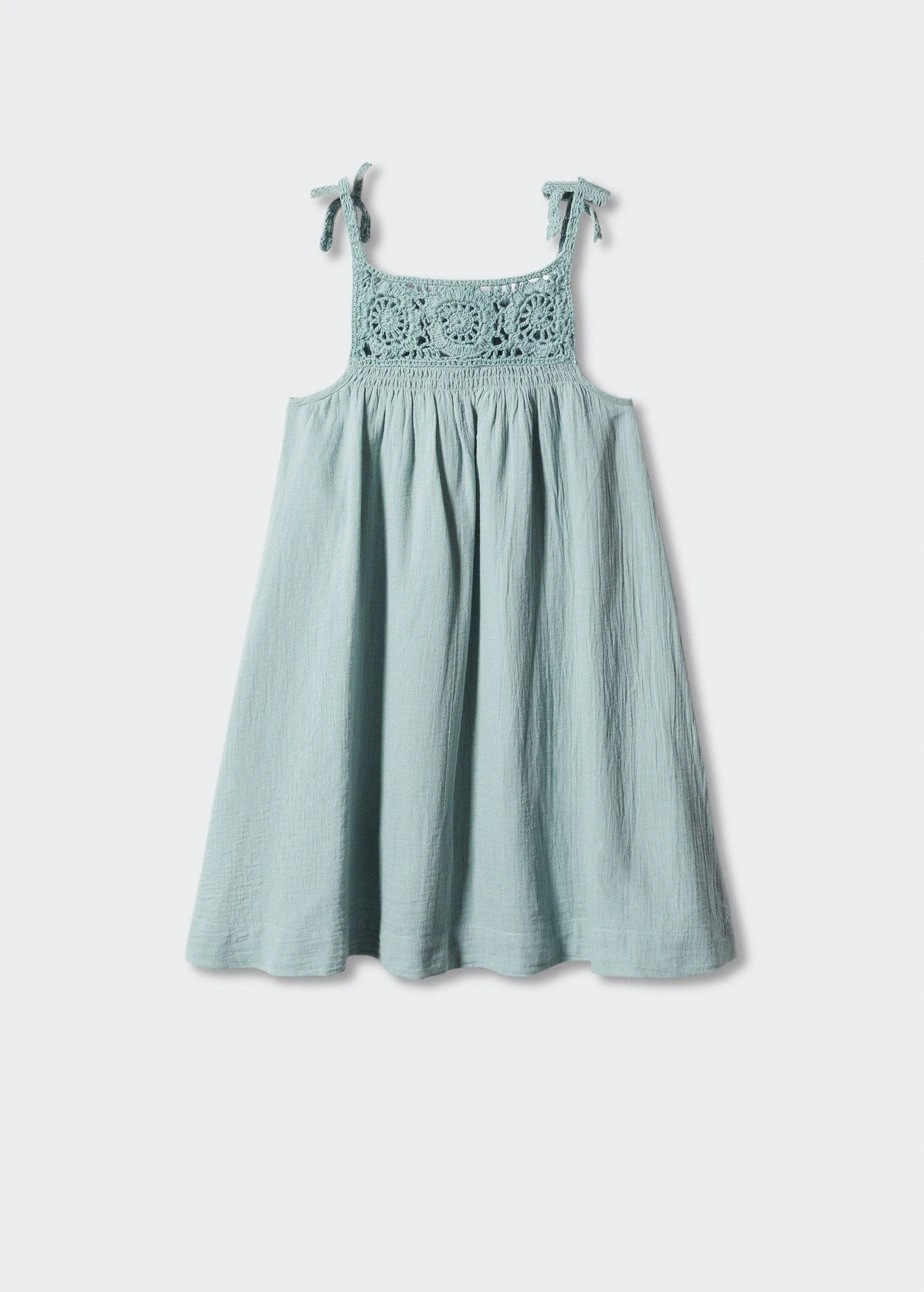 100 % coton, evase, motif crochet, detail fronce, coupe midi, col carre, bretelles fines, bretelles avec fermeture a nœud, sans manches, ce vetement est egalement disponible dans la collection femme., ce modele est egalement disponible dans la collection baby girl.Composition: 100% coton. Doublure: 100% coton. Applique: 100% coton