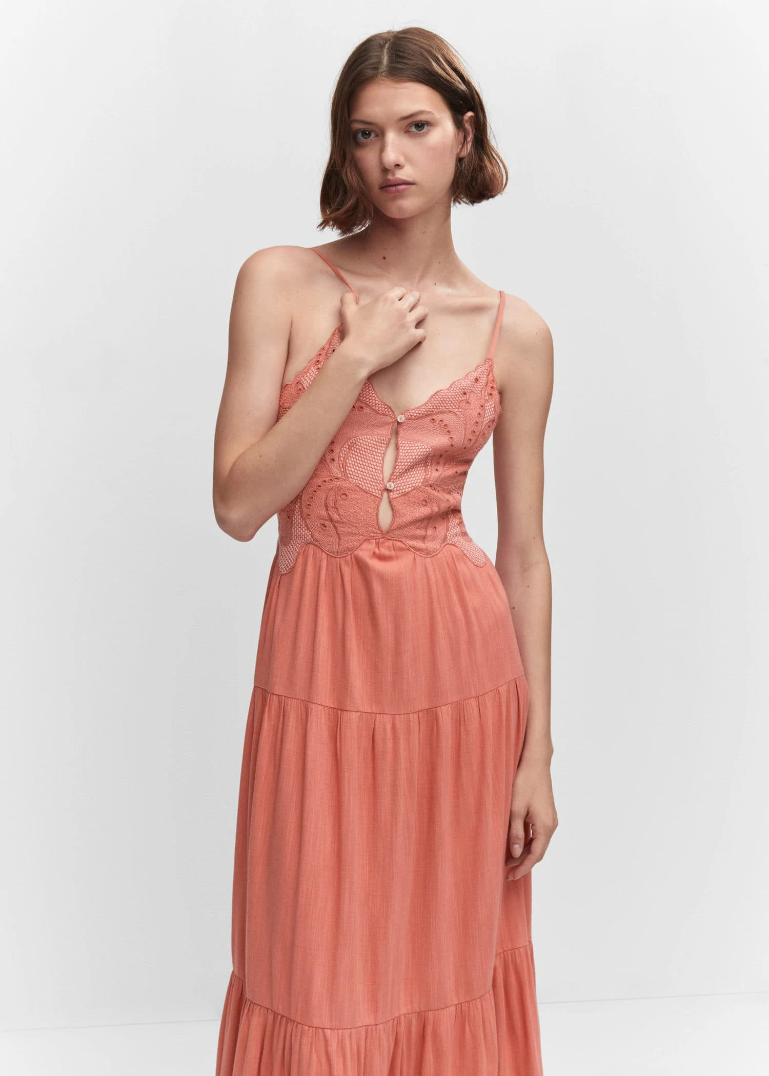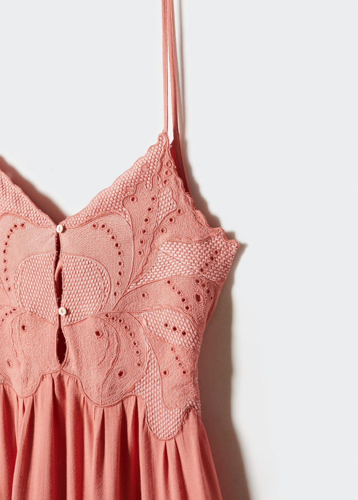 tissu de coton melange, tissu texture, coupe droite, coupe longue, col echancre, bretelles fines, dos nu, lien a nouer au dos, fermeture a bouton sur le devant, bas evase, details brodesComposition: 60% coton,40% viscose. Doublure: 100% coton. Broderie: 100% polyester