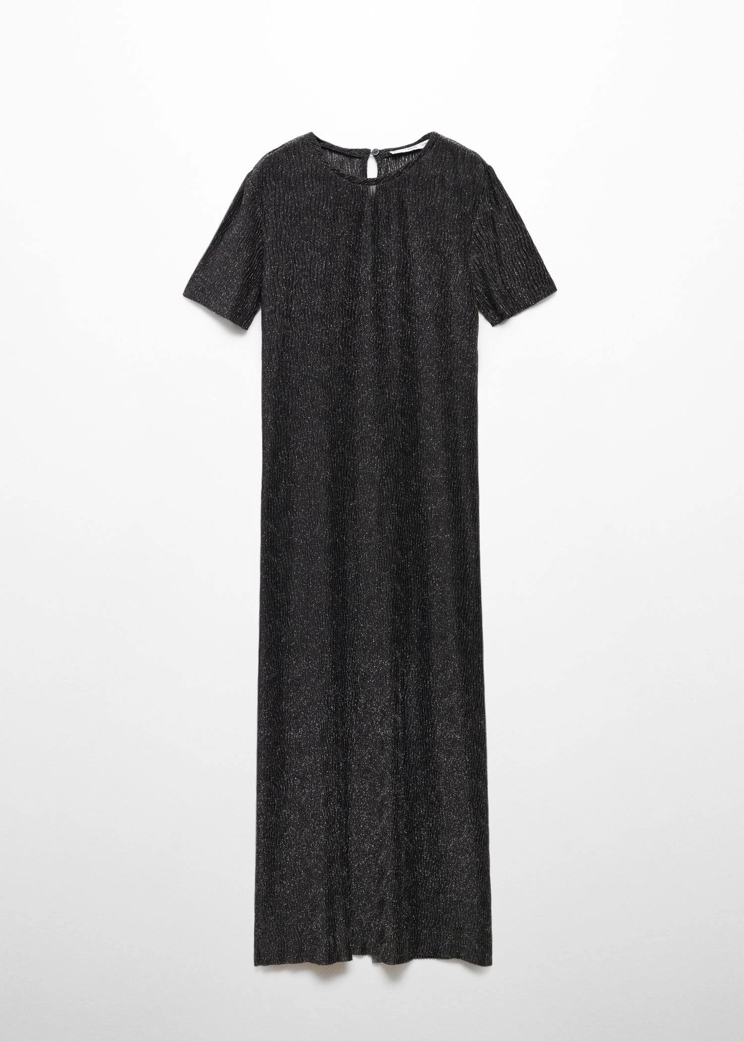 tissu lurex, coupe longue, coupe droite, manches courtes, col rond, detail d’ouverture au dos, fermeture en goutte a l’arriere, doublure, collection fetes et ceremonies.Composition: 75% polyester,25% polyester avec revêtement de cuivre. Doublure: 100% polyester