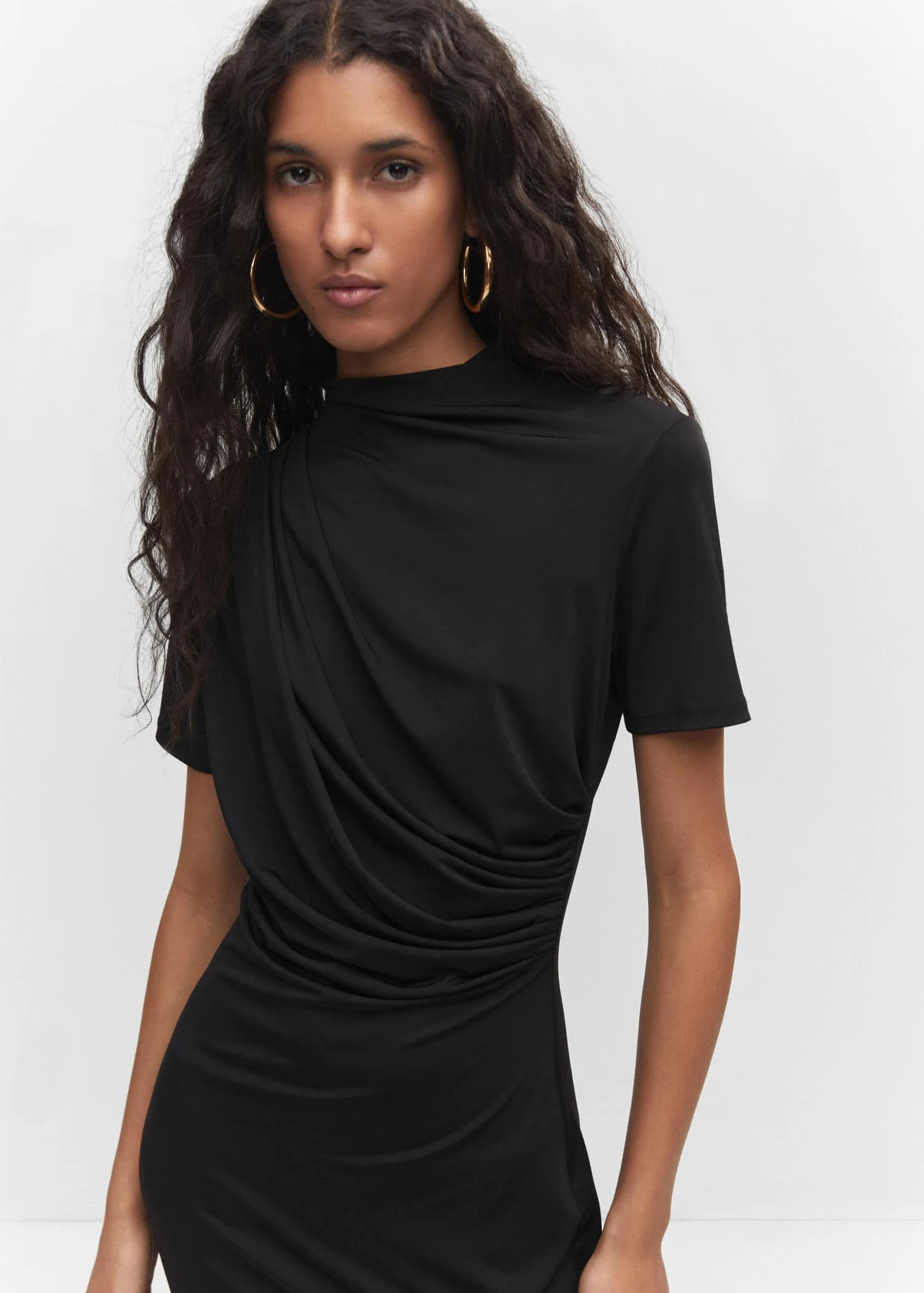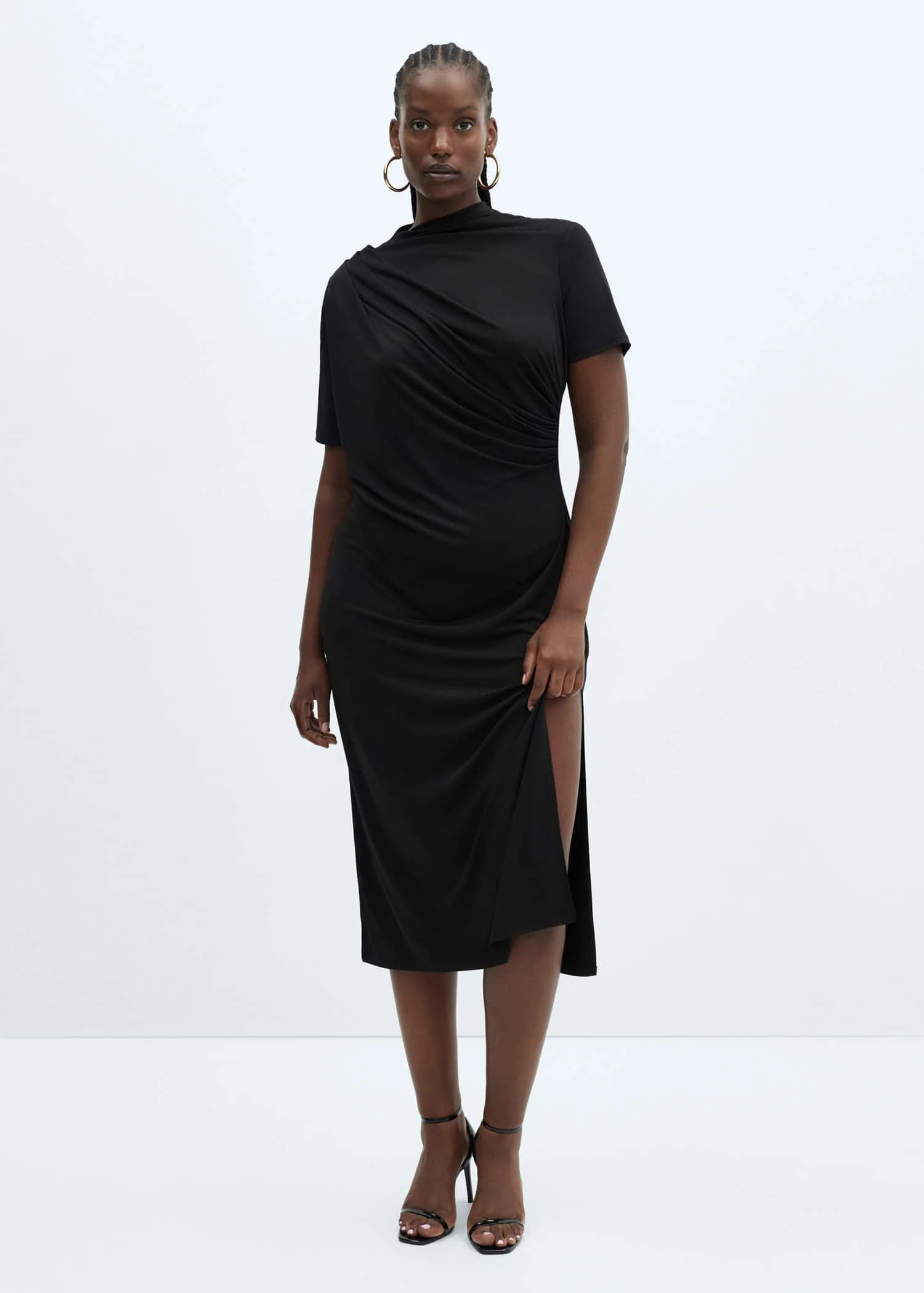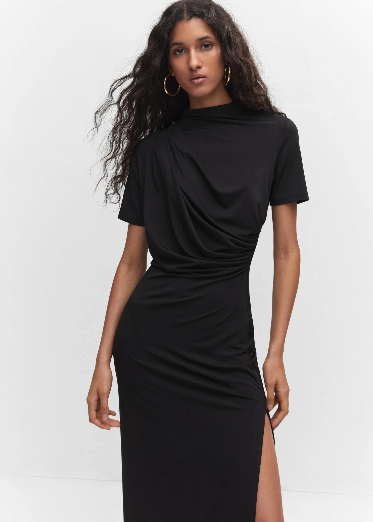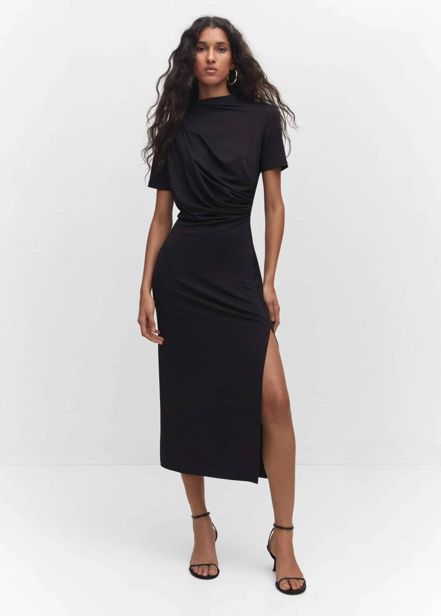 coupe cintree, coupe midi, detail drape, col rond, manches courtes, sans fermeture, fente laterale, disponible plus, collection fetes et ceremoniesComposition: 55% polyester,40% polyester recyclé,5% elasthanne