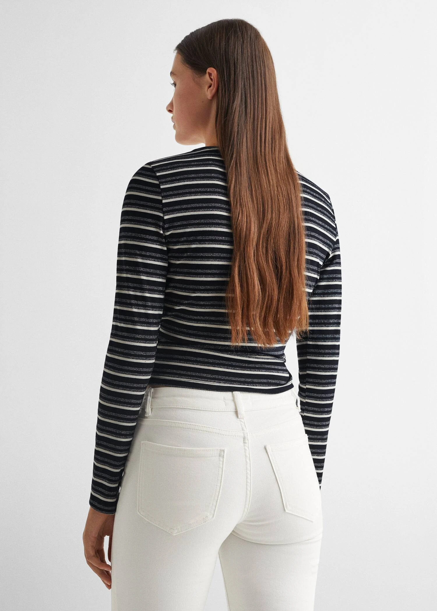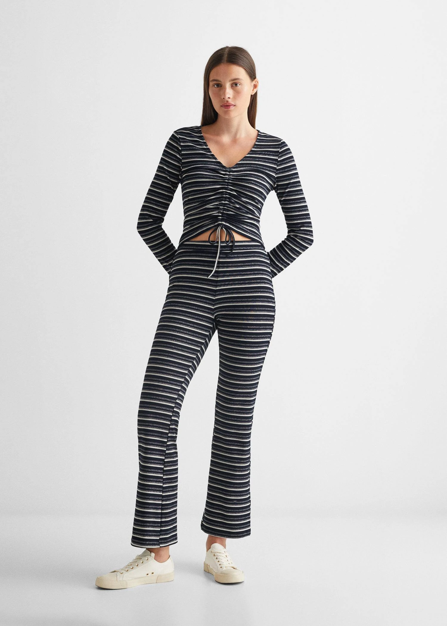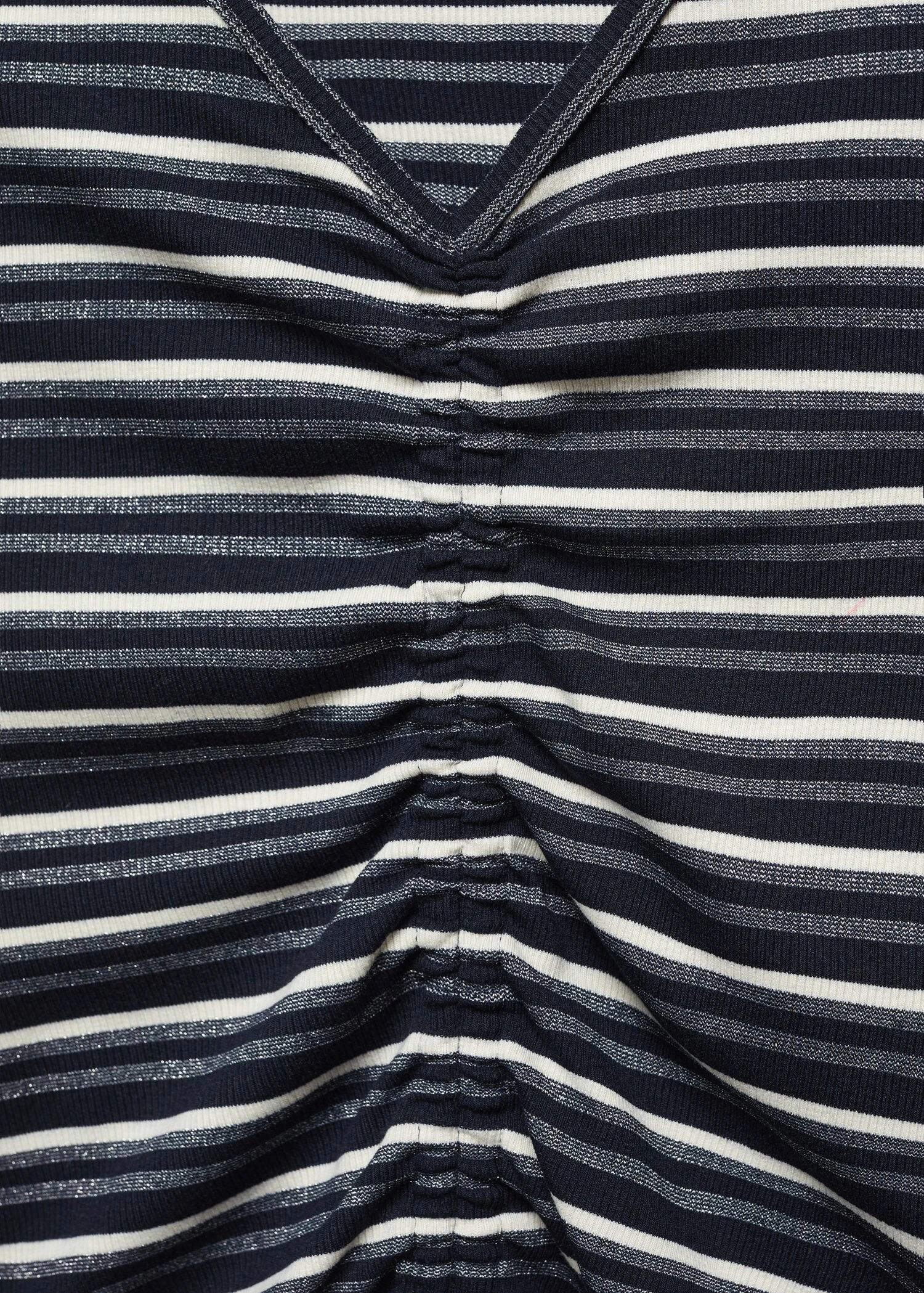 imprime rayures, detail brillant, detail fronce, col en v, manches longues, fermeture a cordonComposition: 66% polyester,25% viscose,6% elasthanne,3% polyester avec revêtement de cuivre